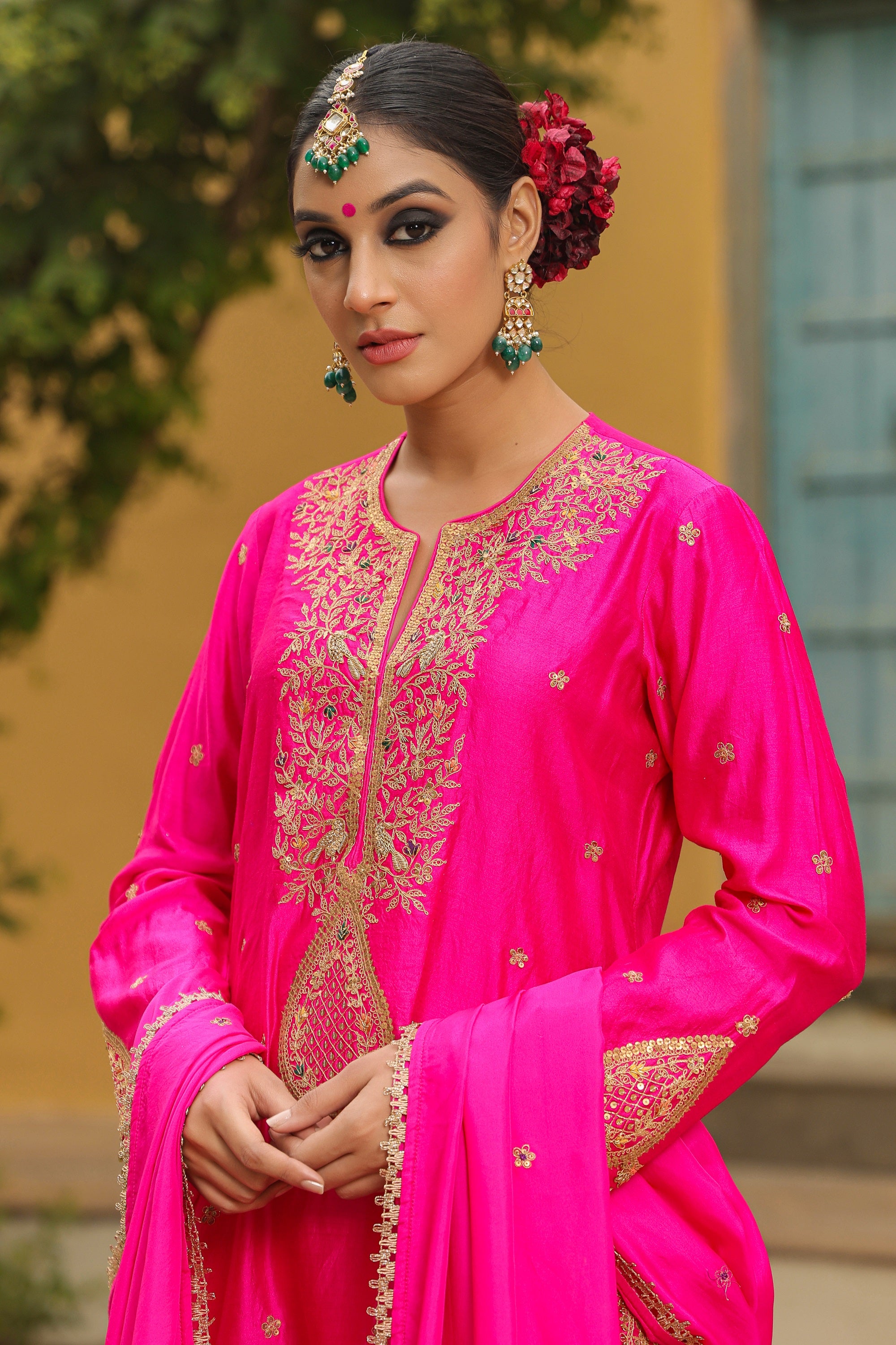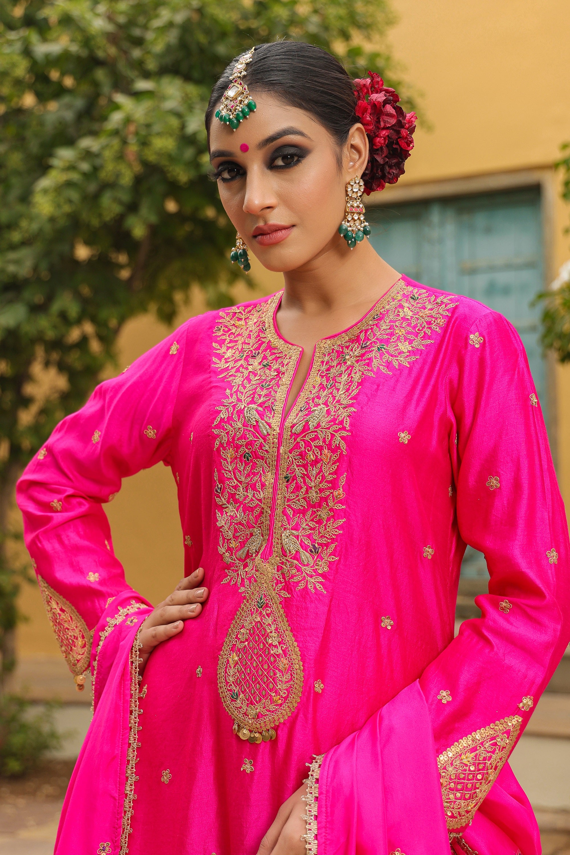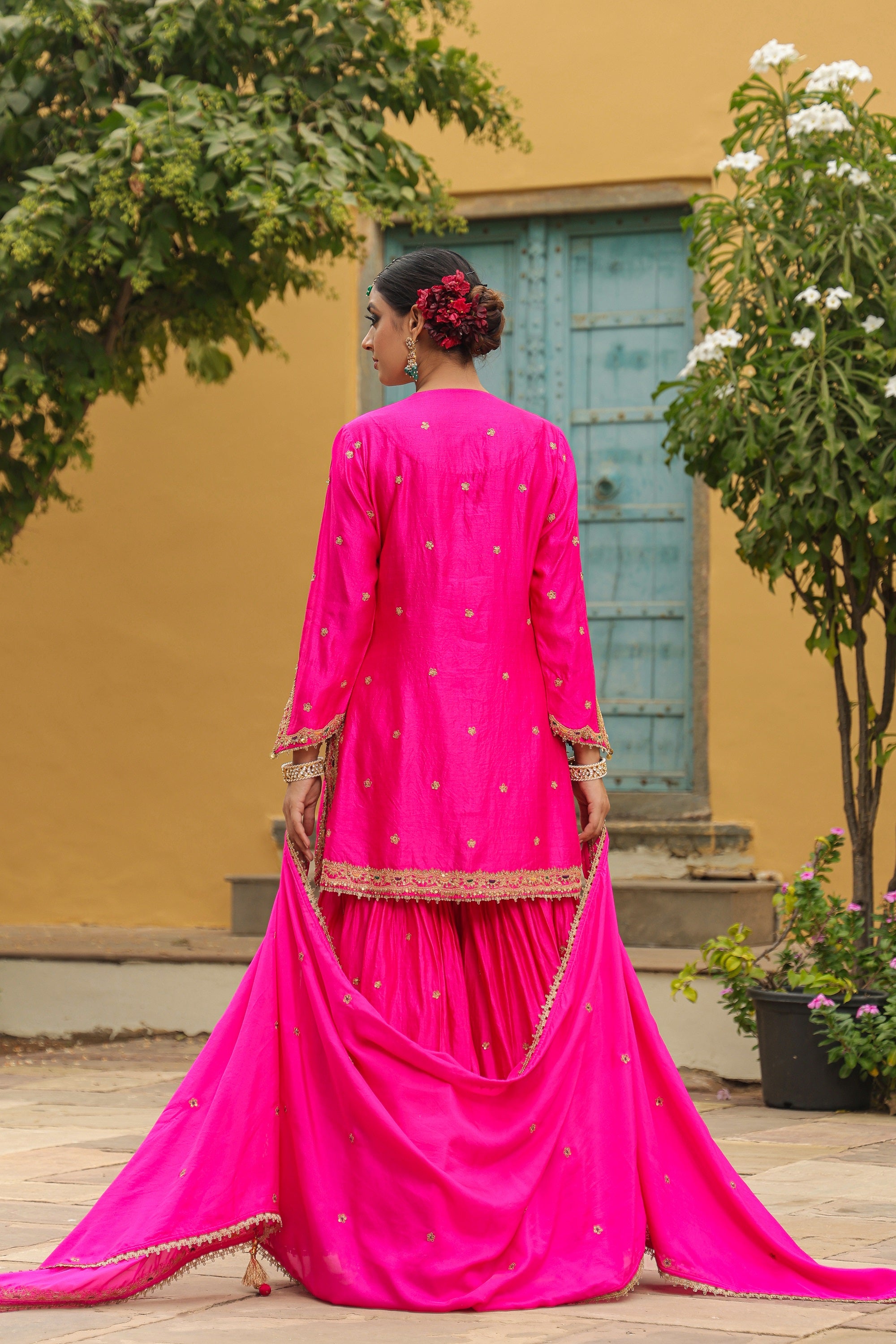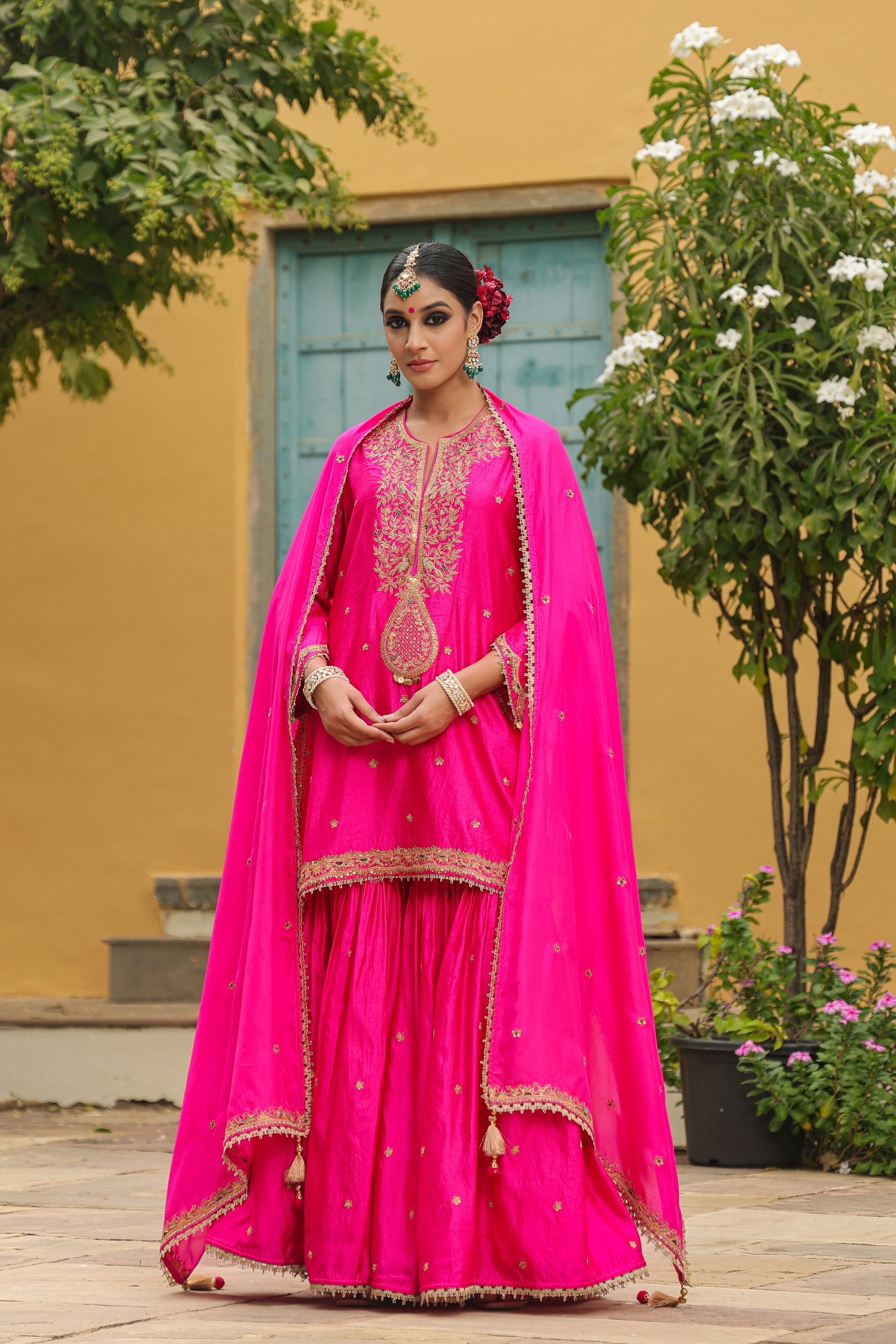 "This 3pc Sharara Set comes with Zari dori embroidery on the neck and hem line of the kurta and enhanced with colourful resham thread work