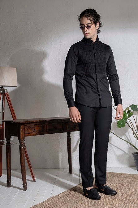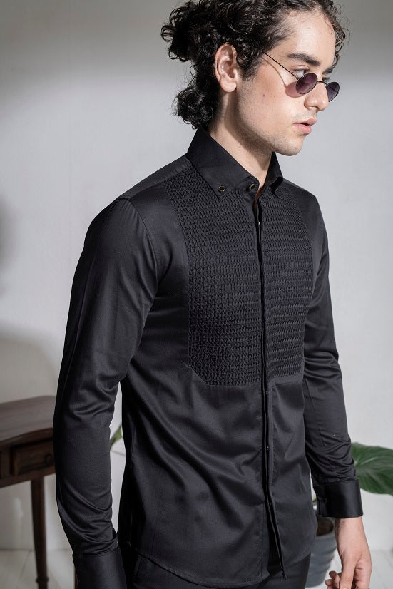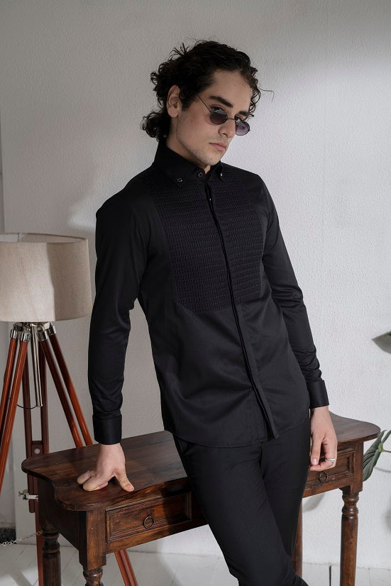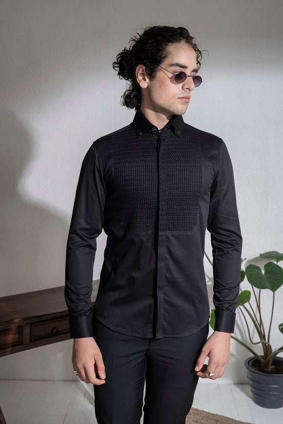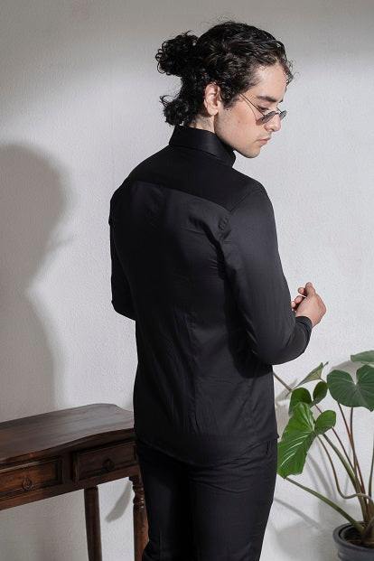 Featuring a black shirt in cotton base with concealed placket, button down collar, and metal buttons. This contains one piece only.