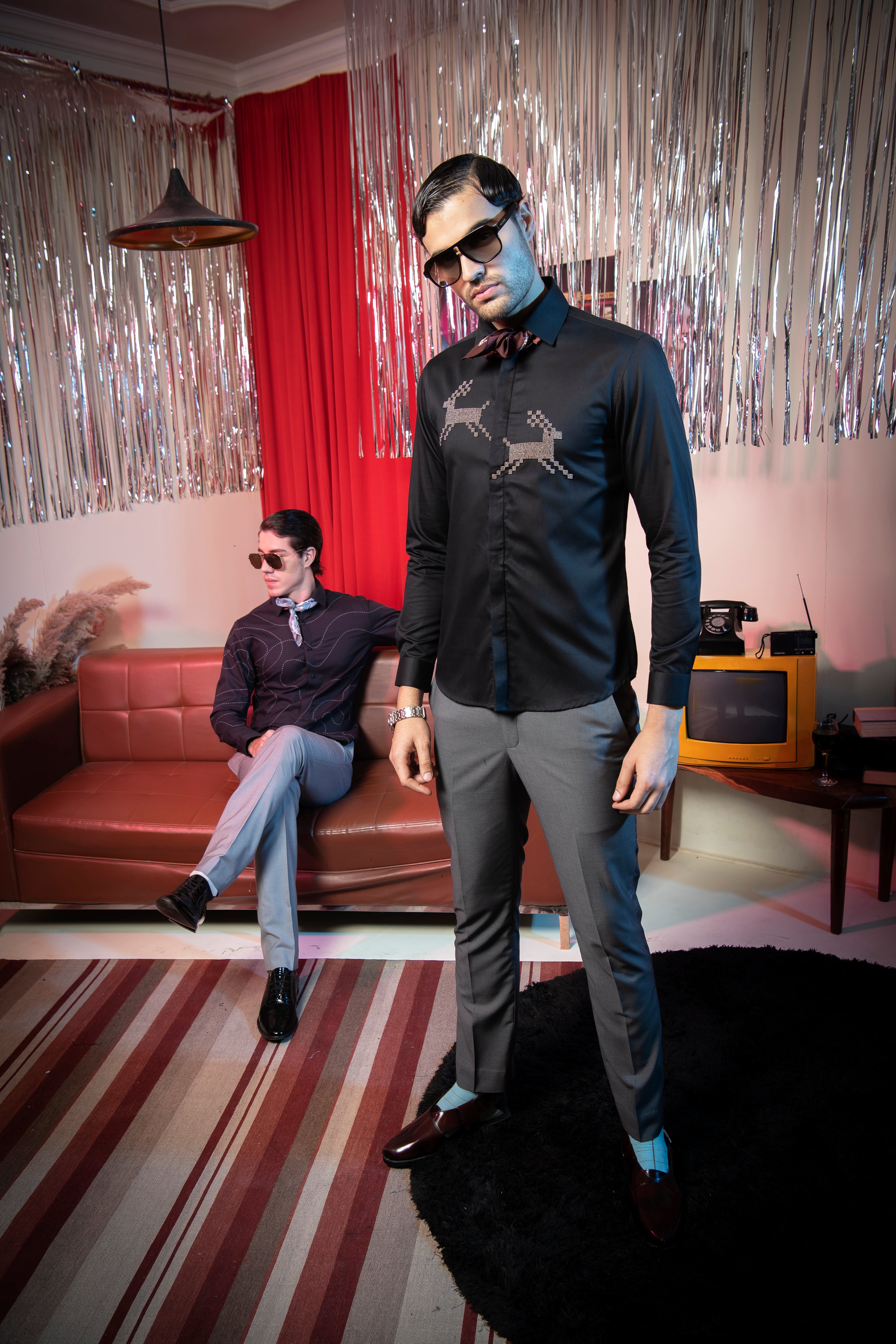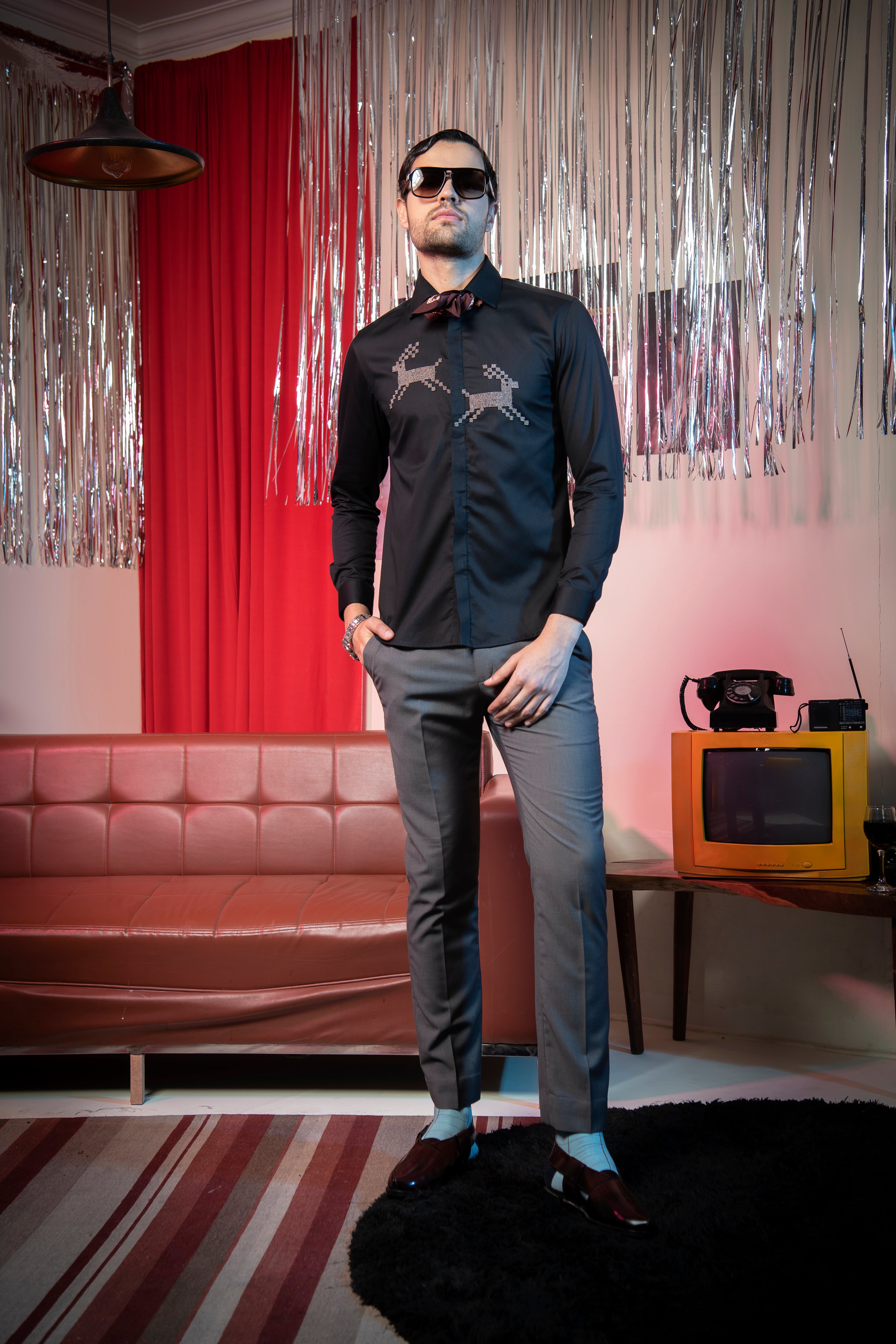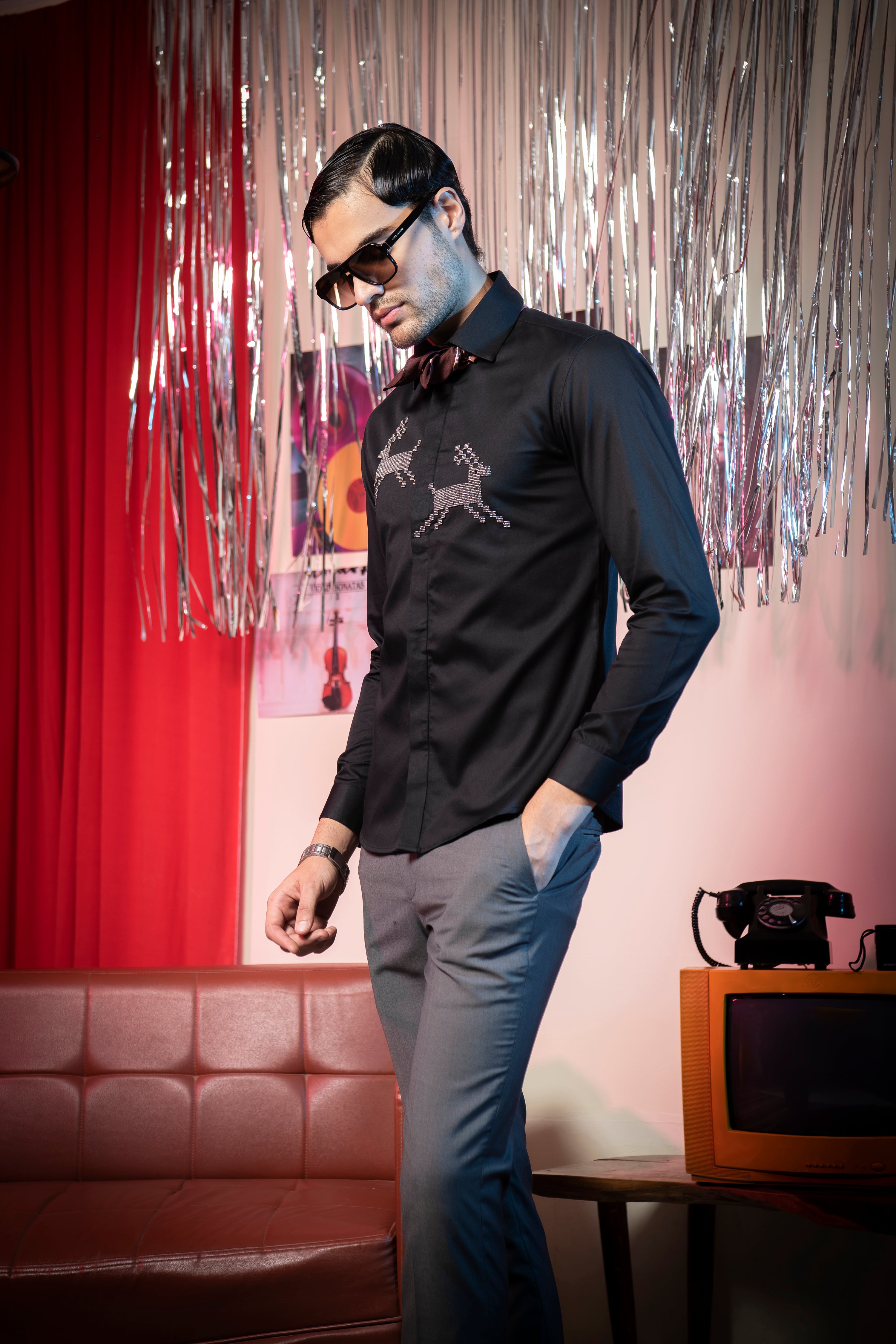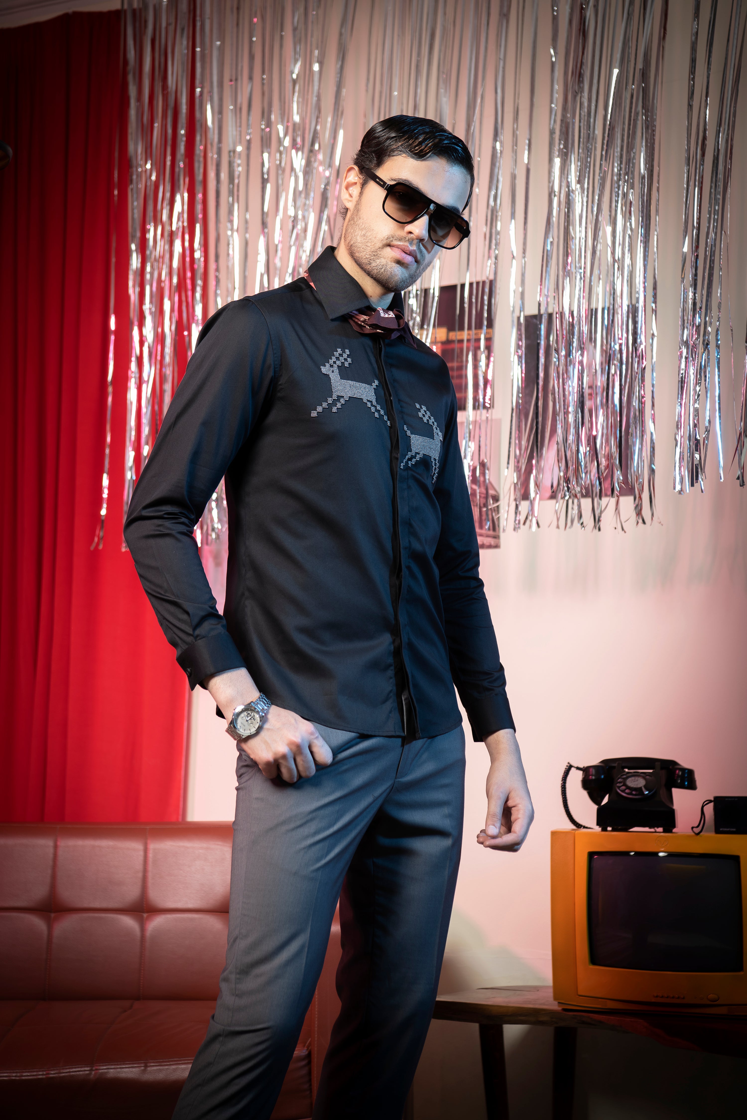 Featuring a black shirt in cotton base with beads embroidery, french seam, cuffs and piping detailing.