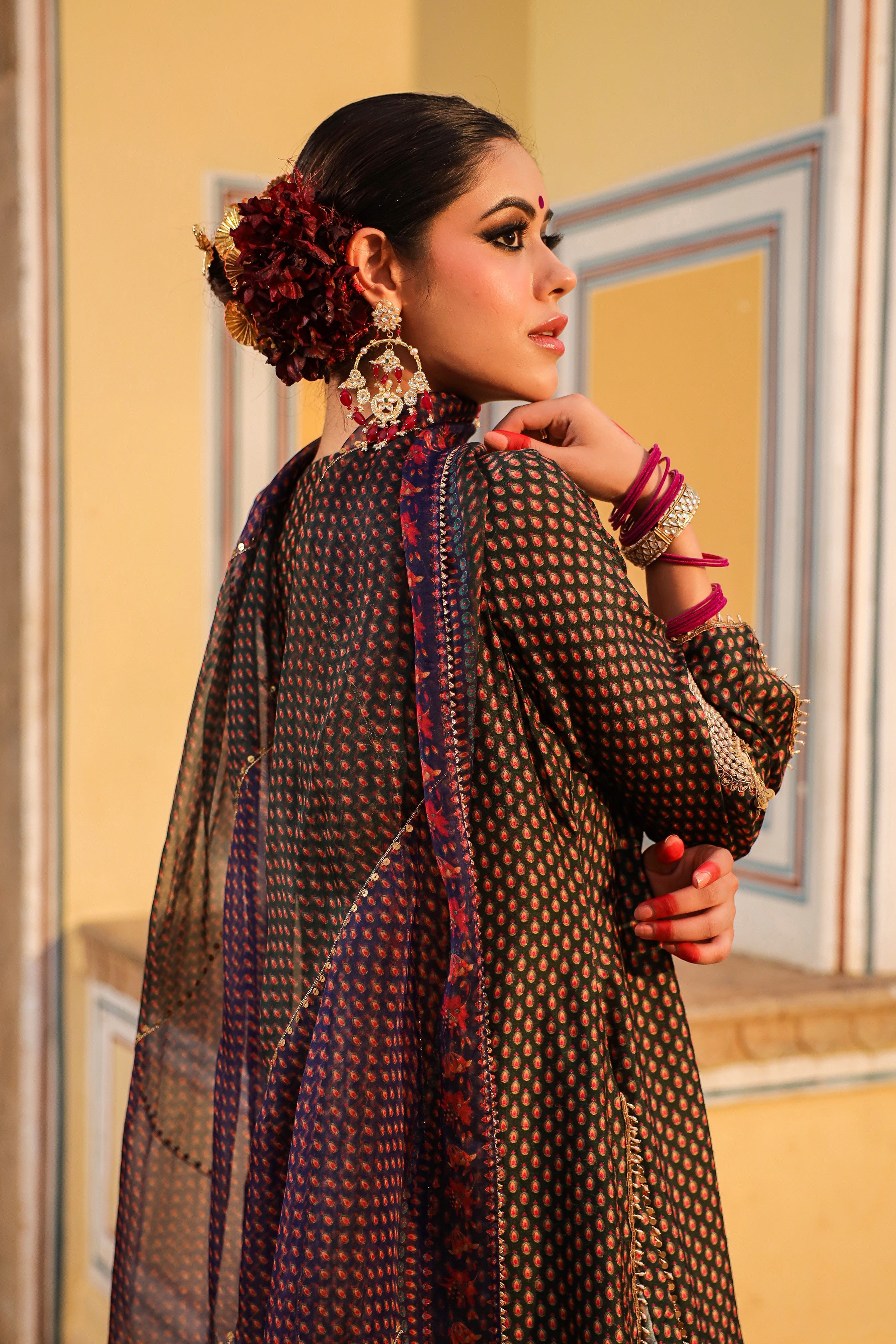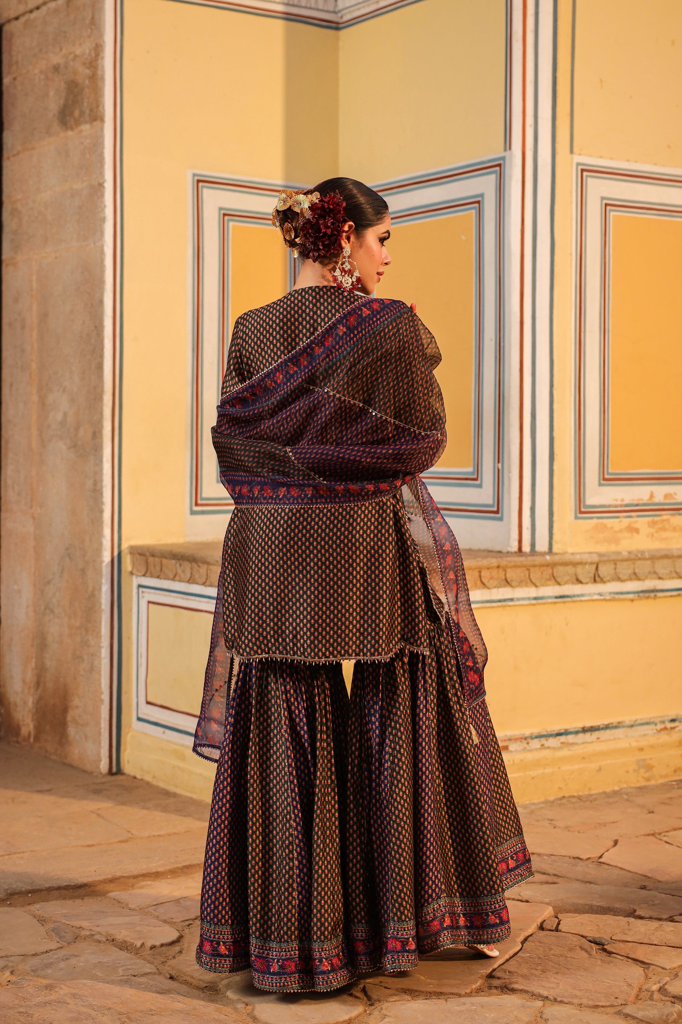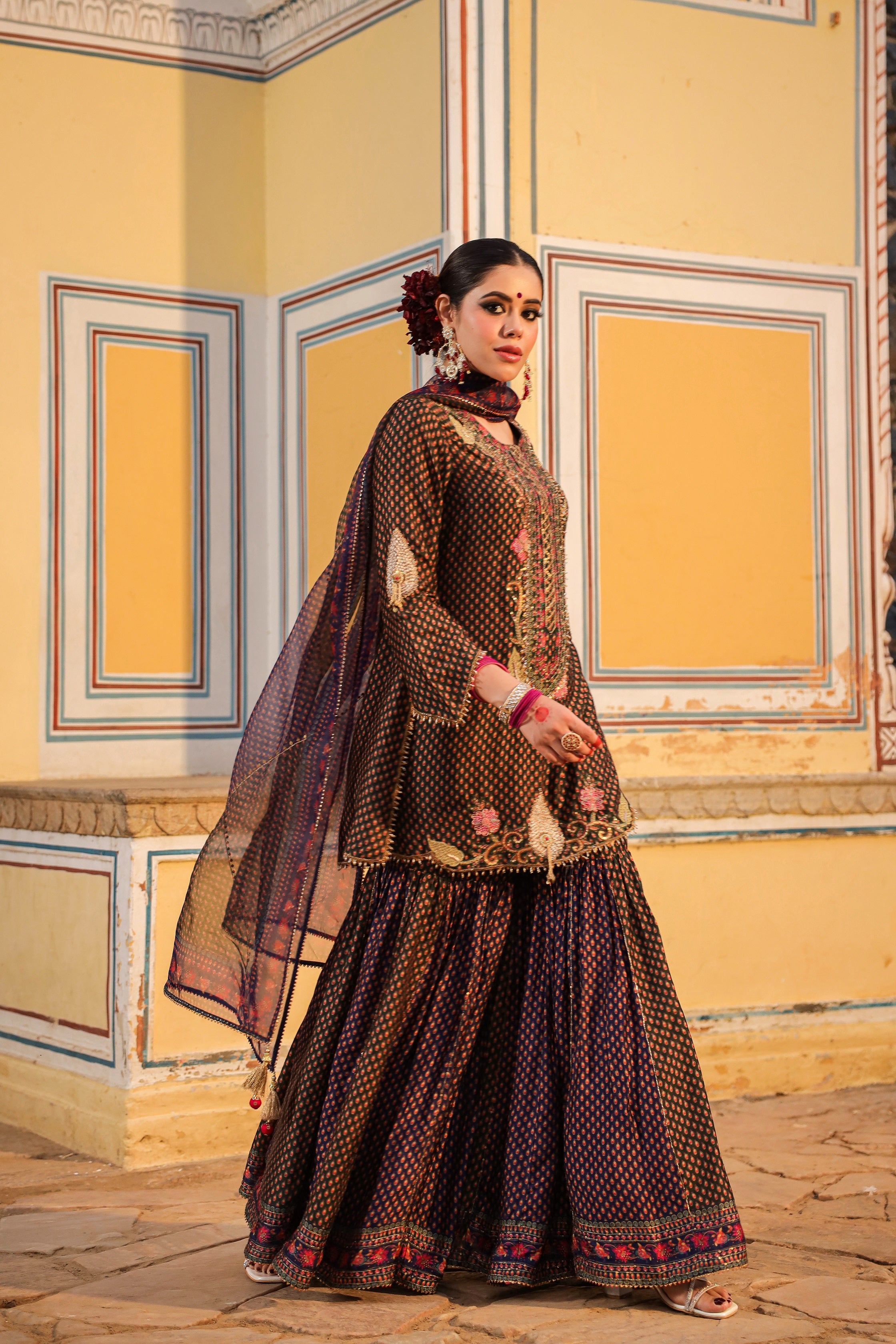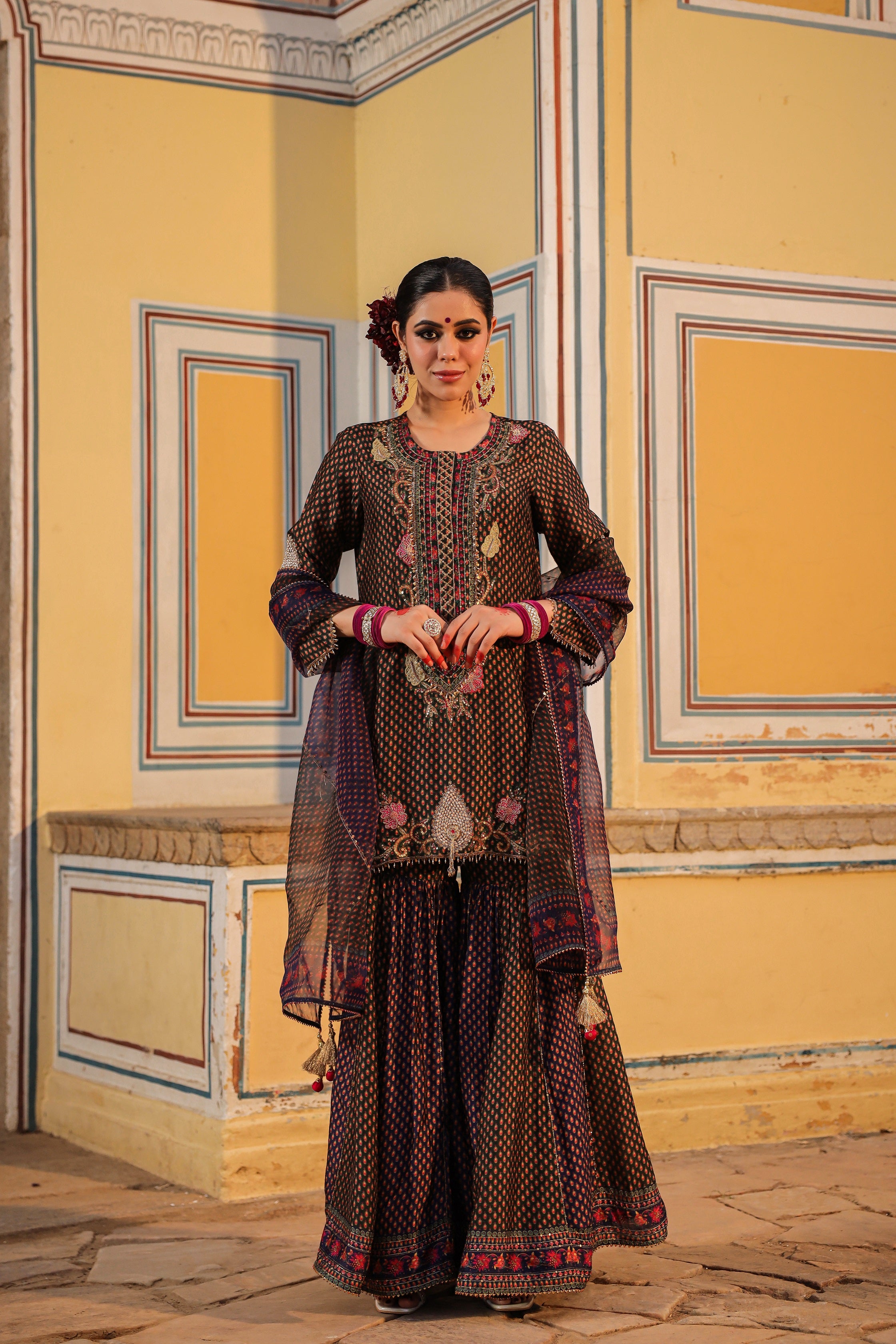 | This 3pc printed Sharara set comes with tikkis and pearls detailing on the neck line and an embroidered hem line with applique motifs enhanced with pearls , zari and resham thread work The sleeve is adorned with a pearl badaam butta Its paired with an embroidered Sharara and an organza dupatta with delicate pearl and tikki detailing |