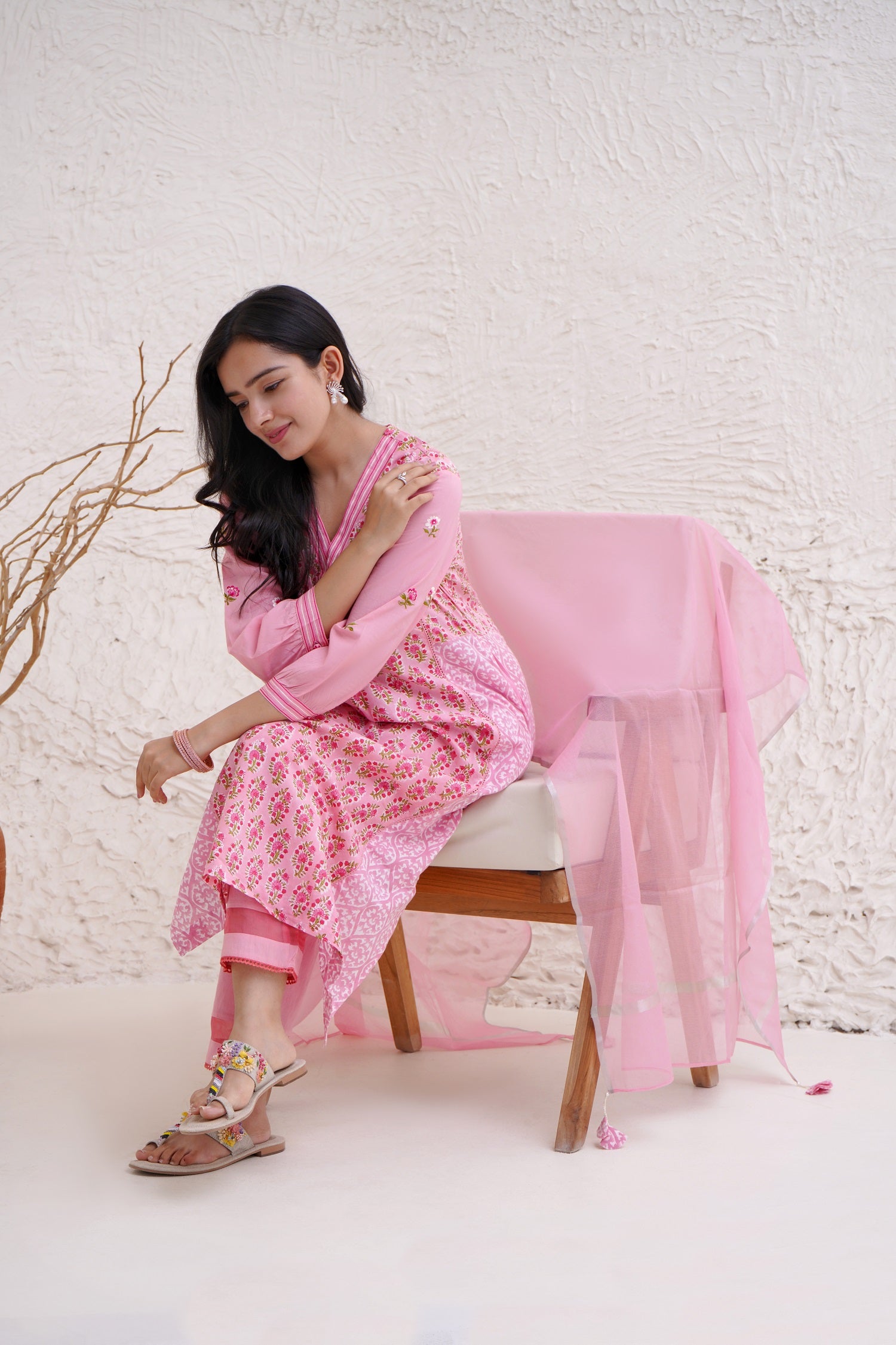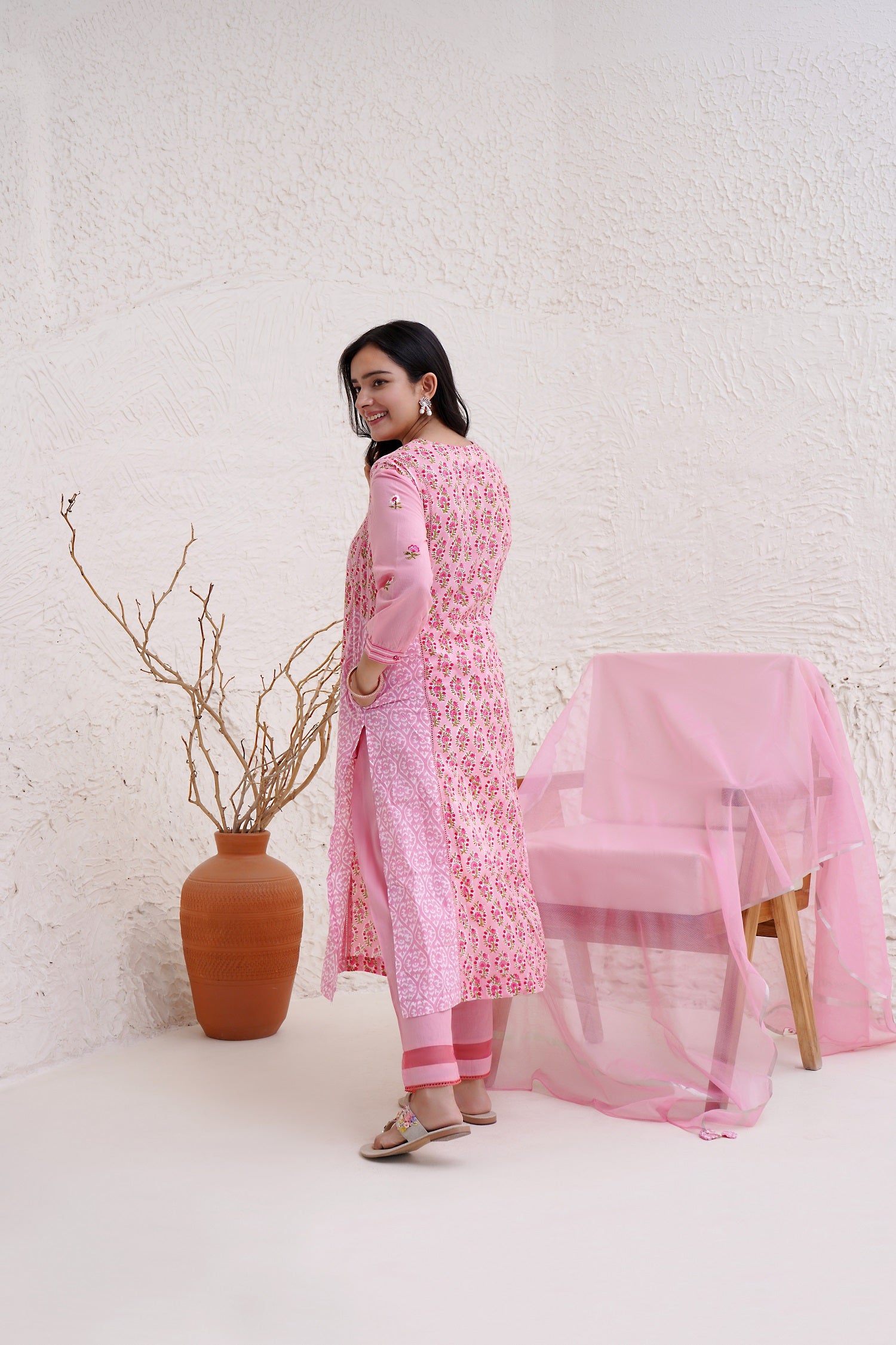 -Kurta in Petunia Pink Hand Block Printed Cotton Fabric with side panels and slits adding movement.
