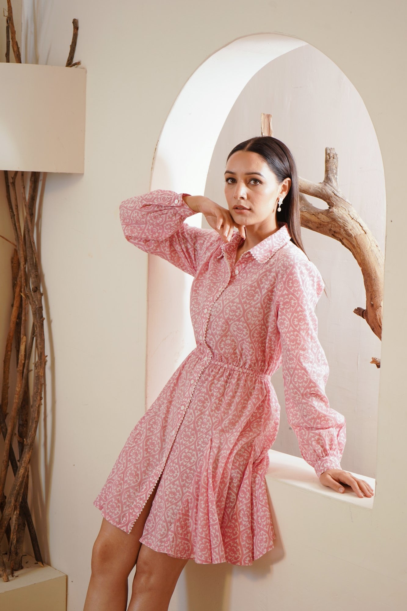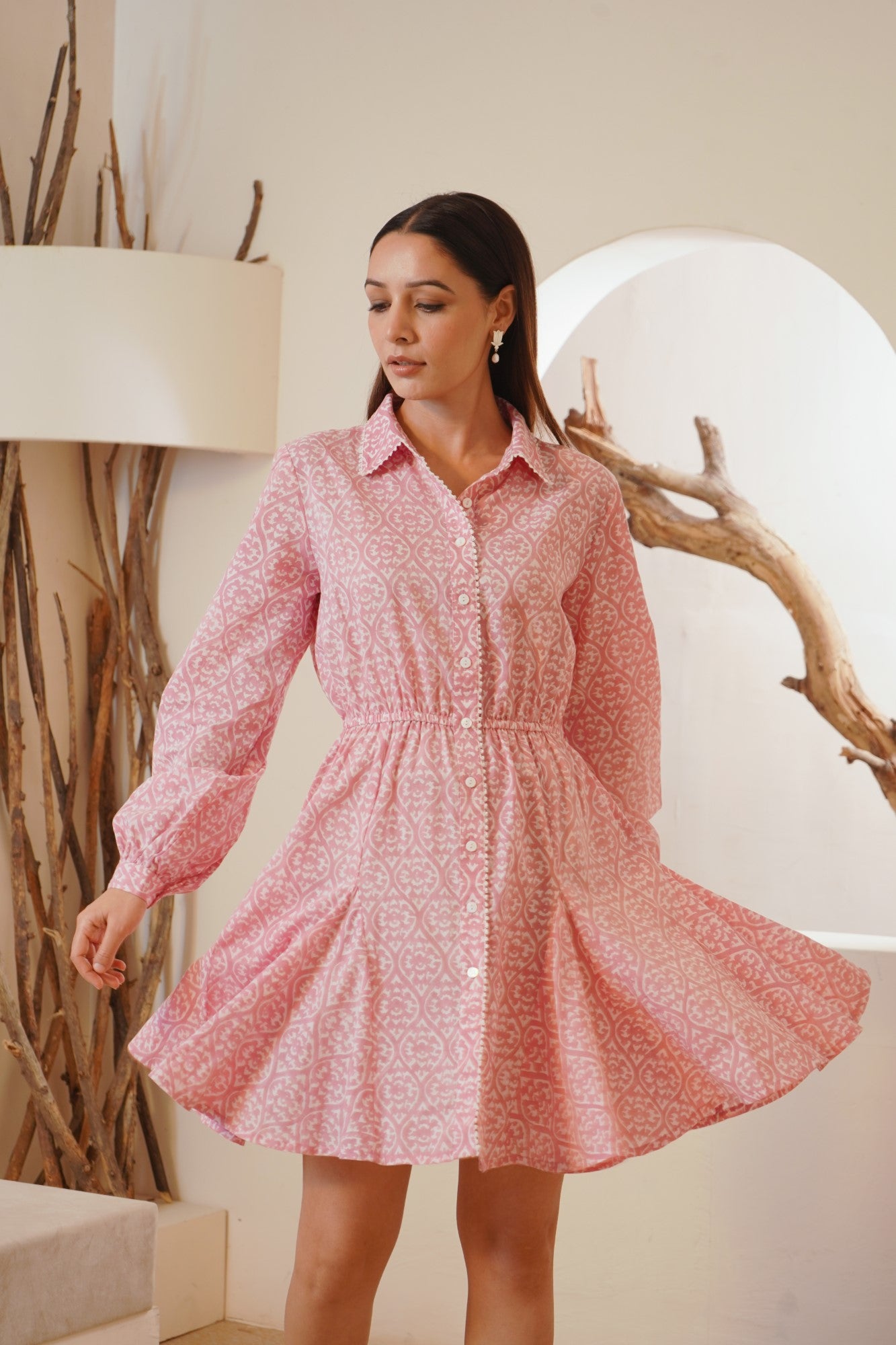 -Shirt Dress in Pink Morrocan Hand Block Printed fabric with panels adding flare.
