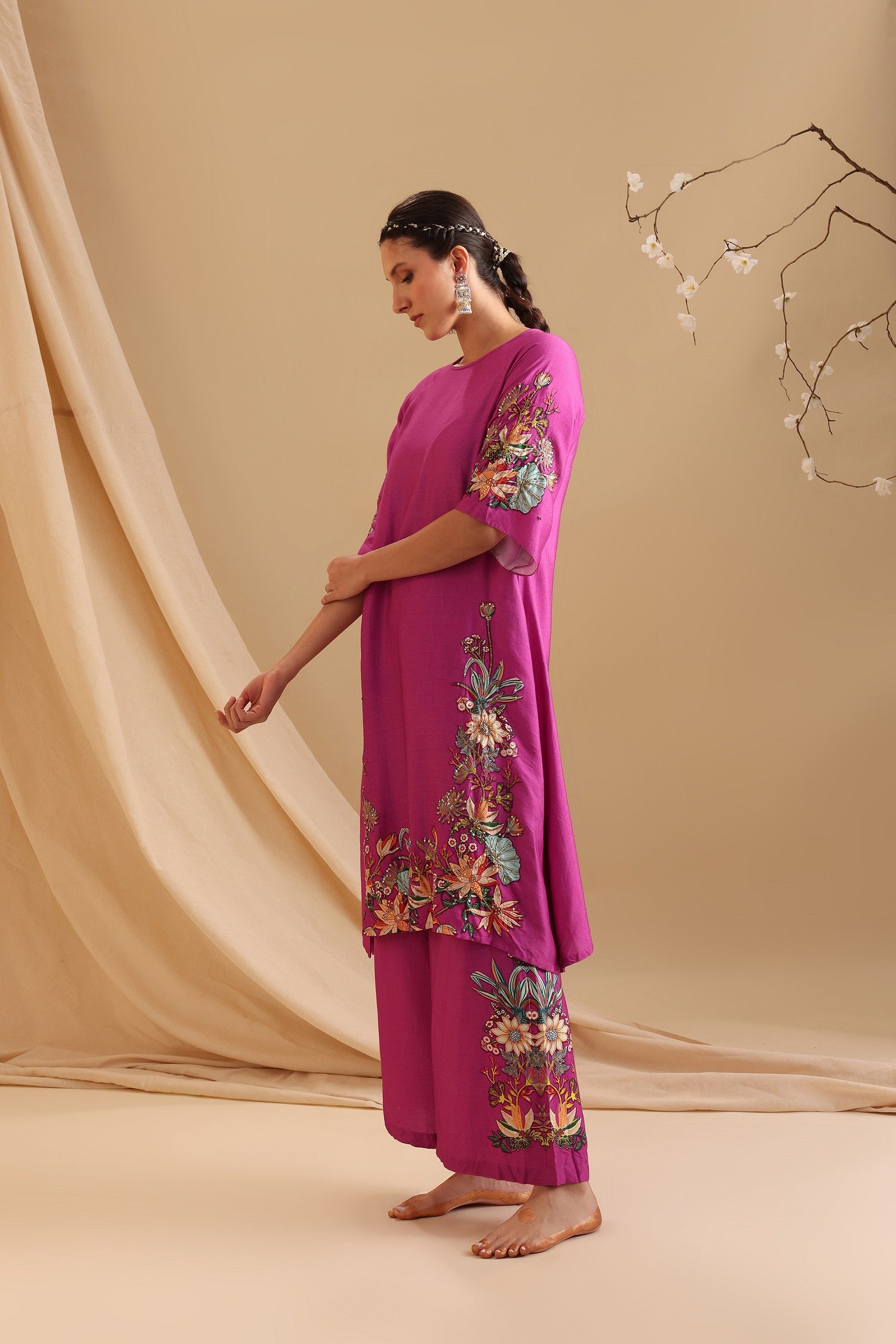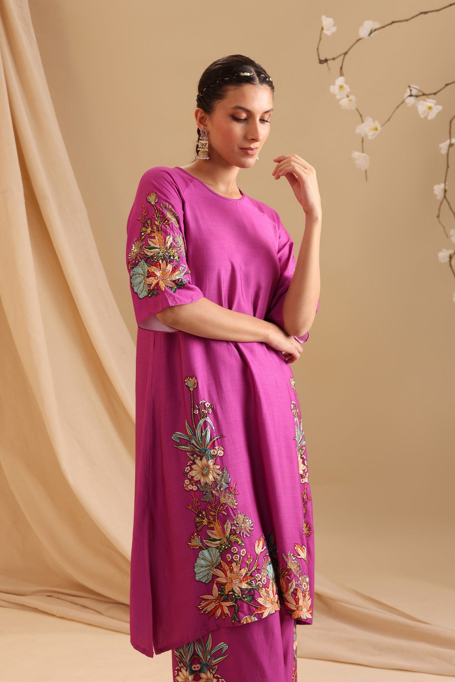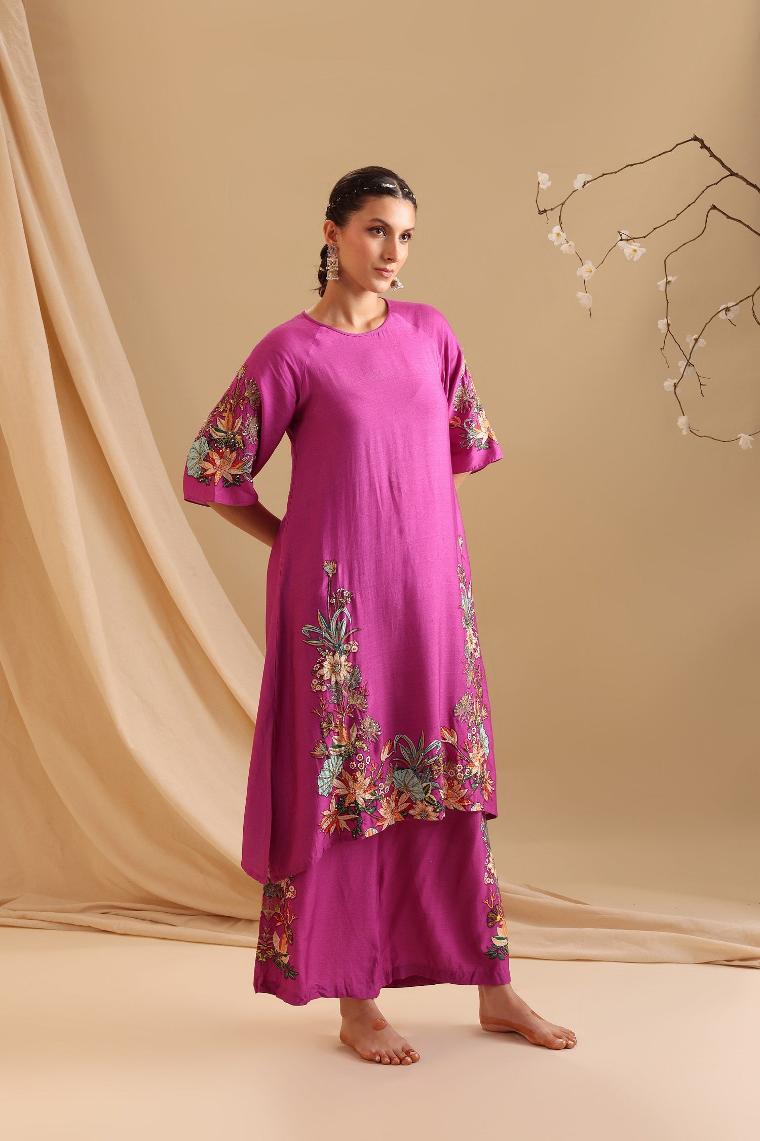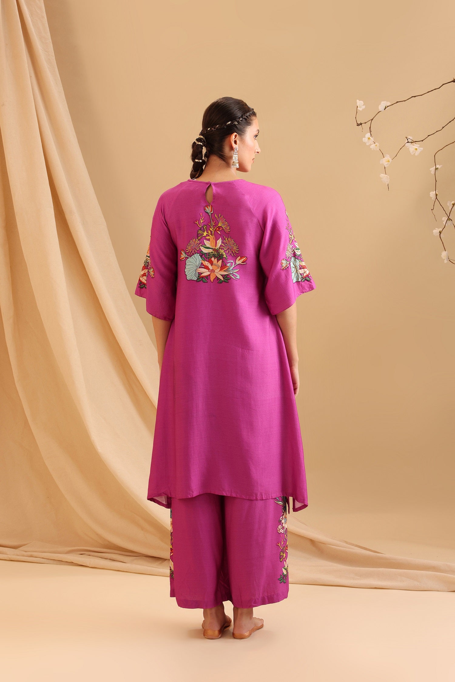 "Fuchsia Pink Aarani Embellished Kurta paired with Palazzo Pants in Chanderi