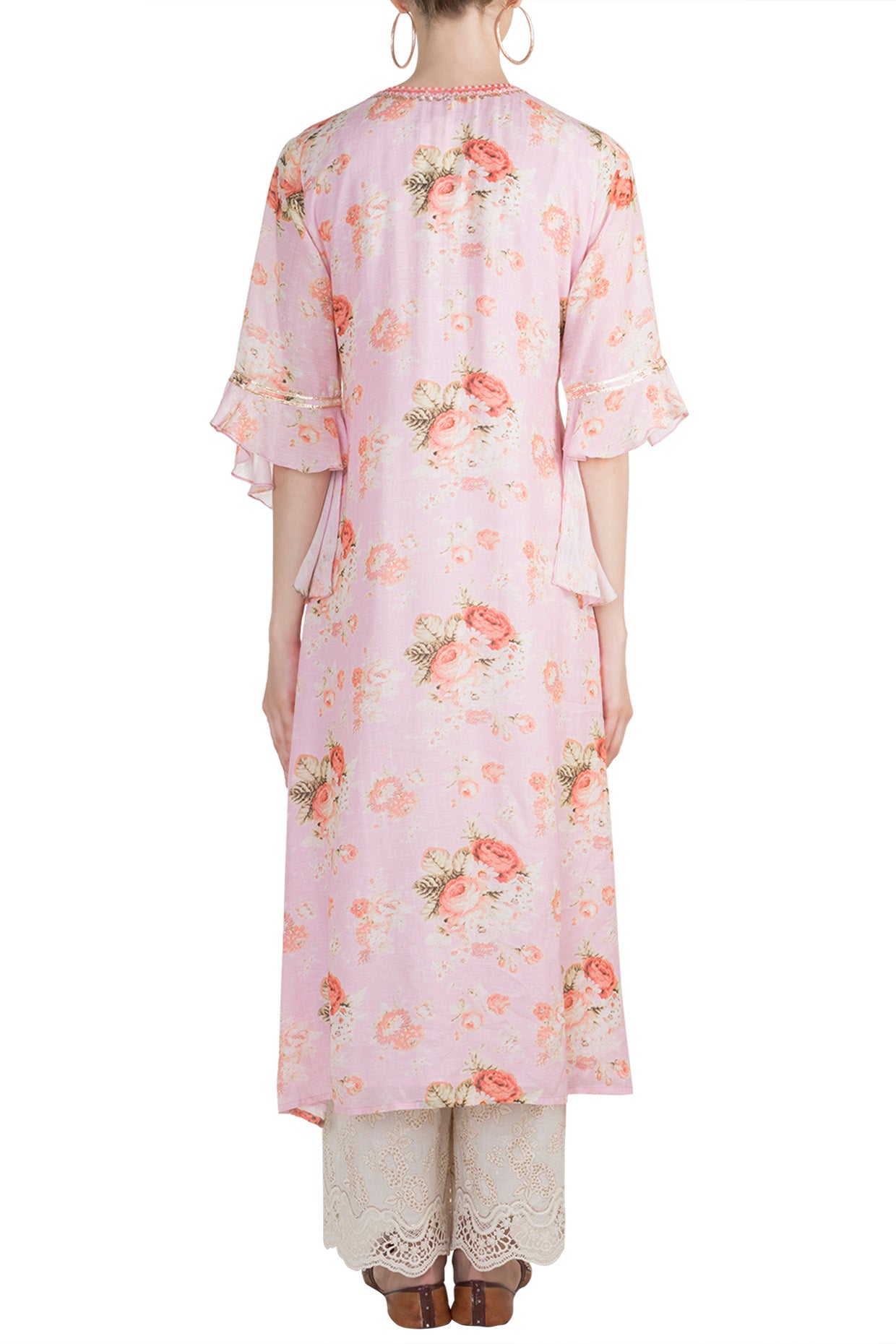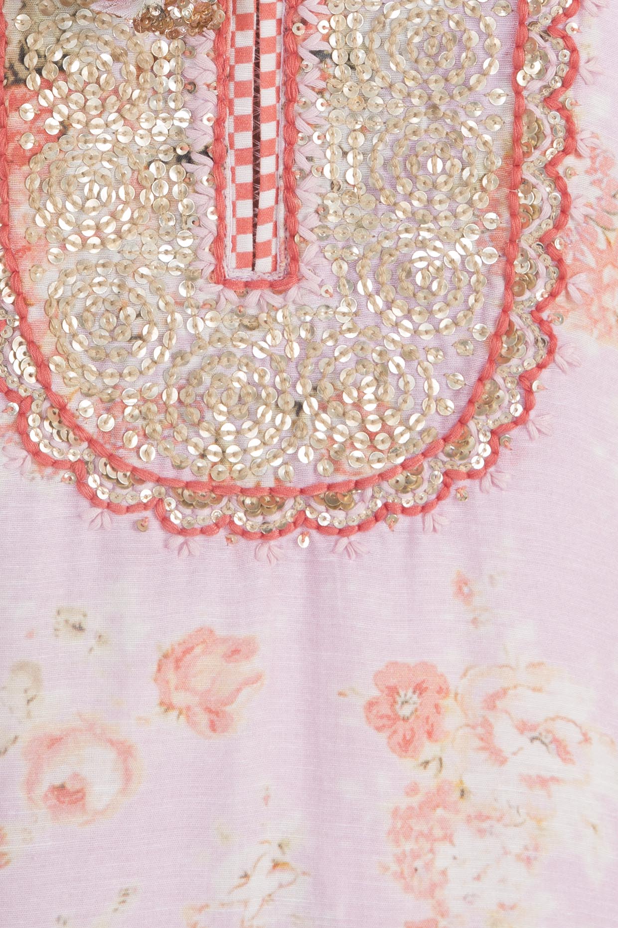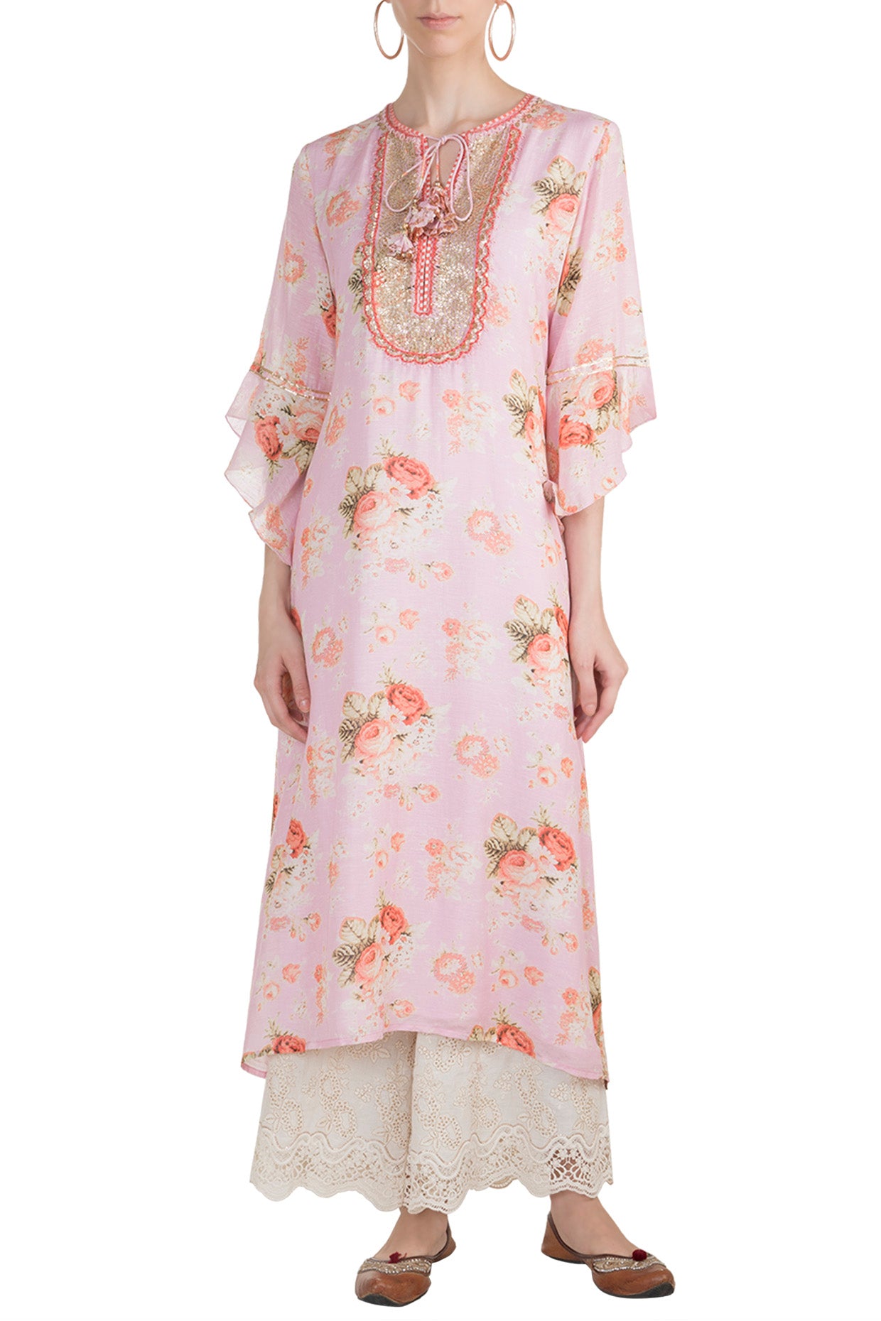 A Beautiful floral printed long tunic with handwork in sequence and thread.