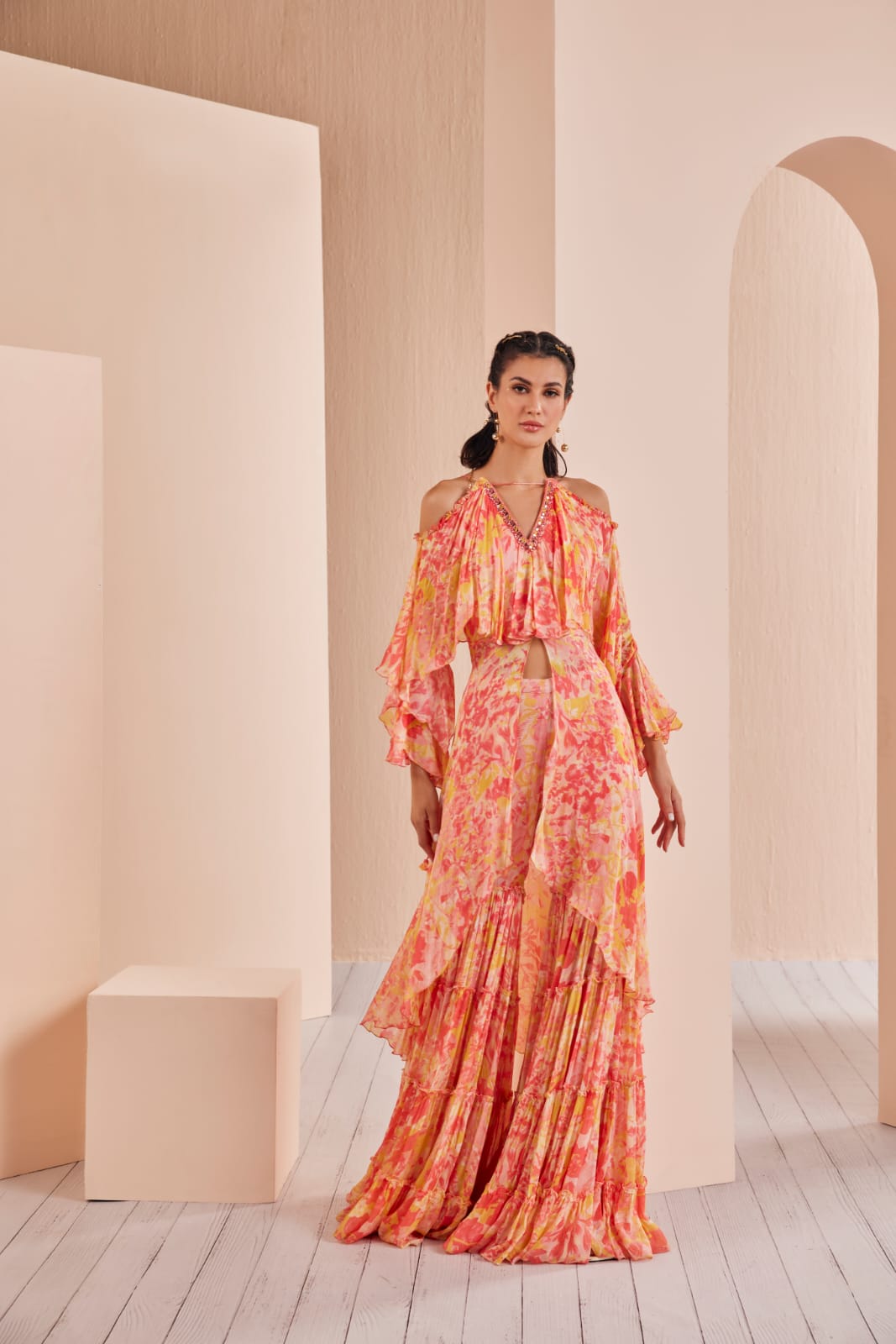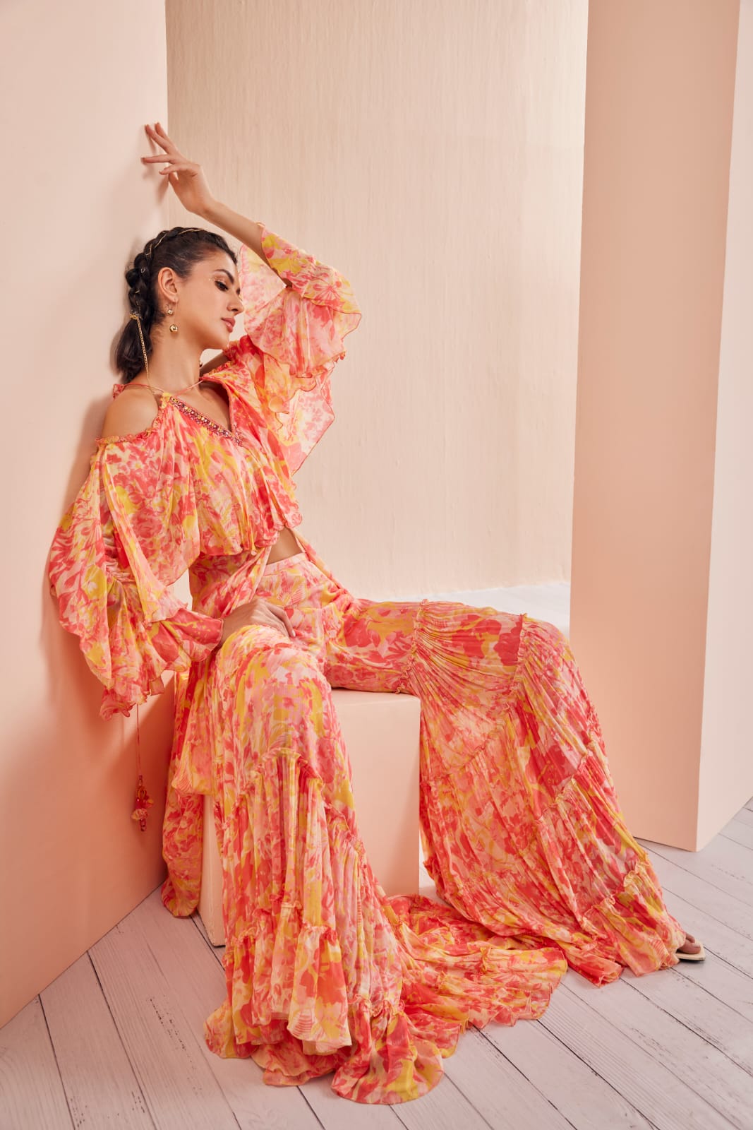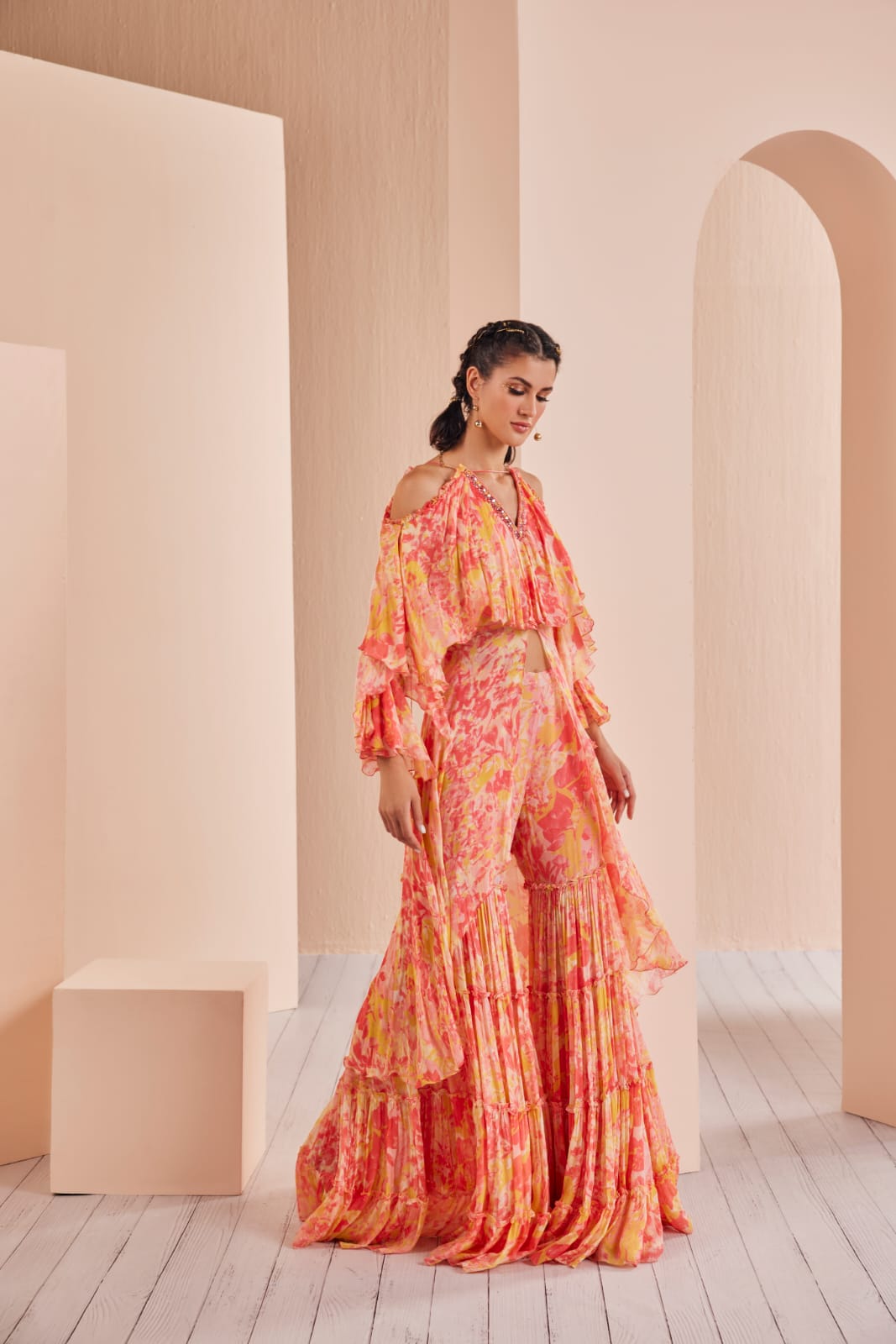 Red pancy daisy chiffon butterfly kurta top with tiered sharara
