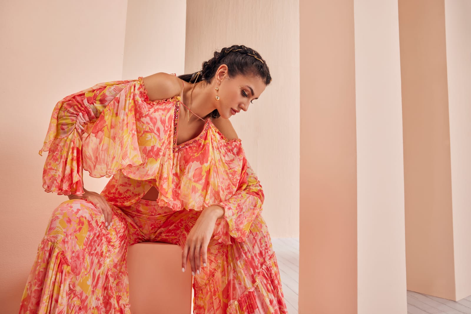 | Step into a world of effortless elegance with this printed butterfly top, a charming piece that seamlessly blends comfort and style. The top features a flattering V-neckline attached with a single string for a chic and adjustable look. Its coal sleeves are stylized with delightful ruffles that add a touch of whimsy to the ensemble. Paired with the top is a tiered chiffon sharara that offers both comfort and flair. The outfit is adorned with beautiful mirror embroidery at the neck, creating an intricate and eye-catching detail. This ensemble is a perfect fusion of modern design and traditional aesthetics, making it an enchanting choice for a variety of occasions. |