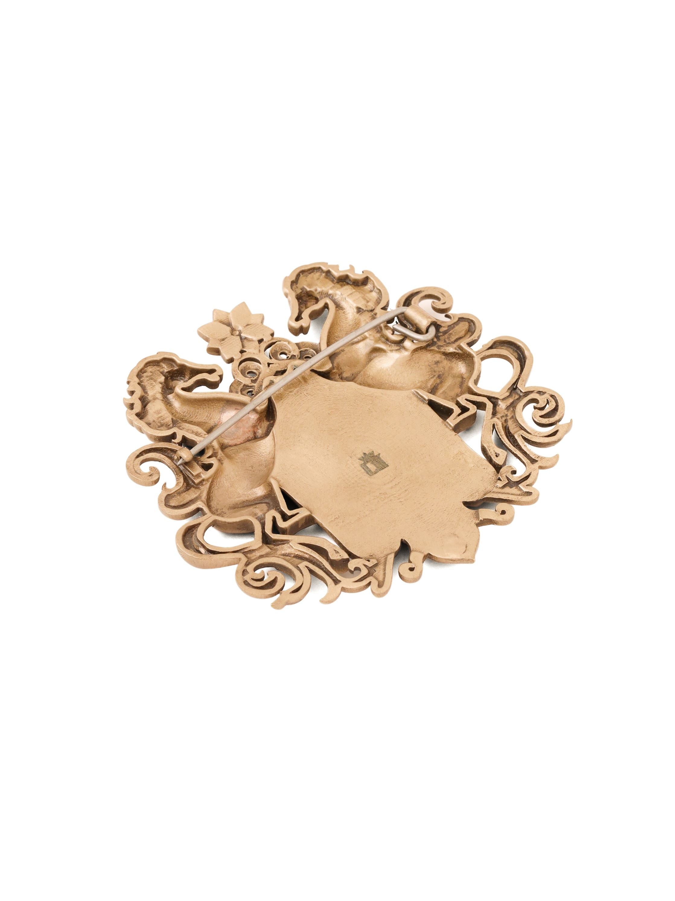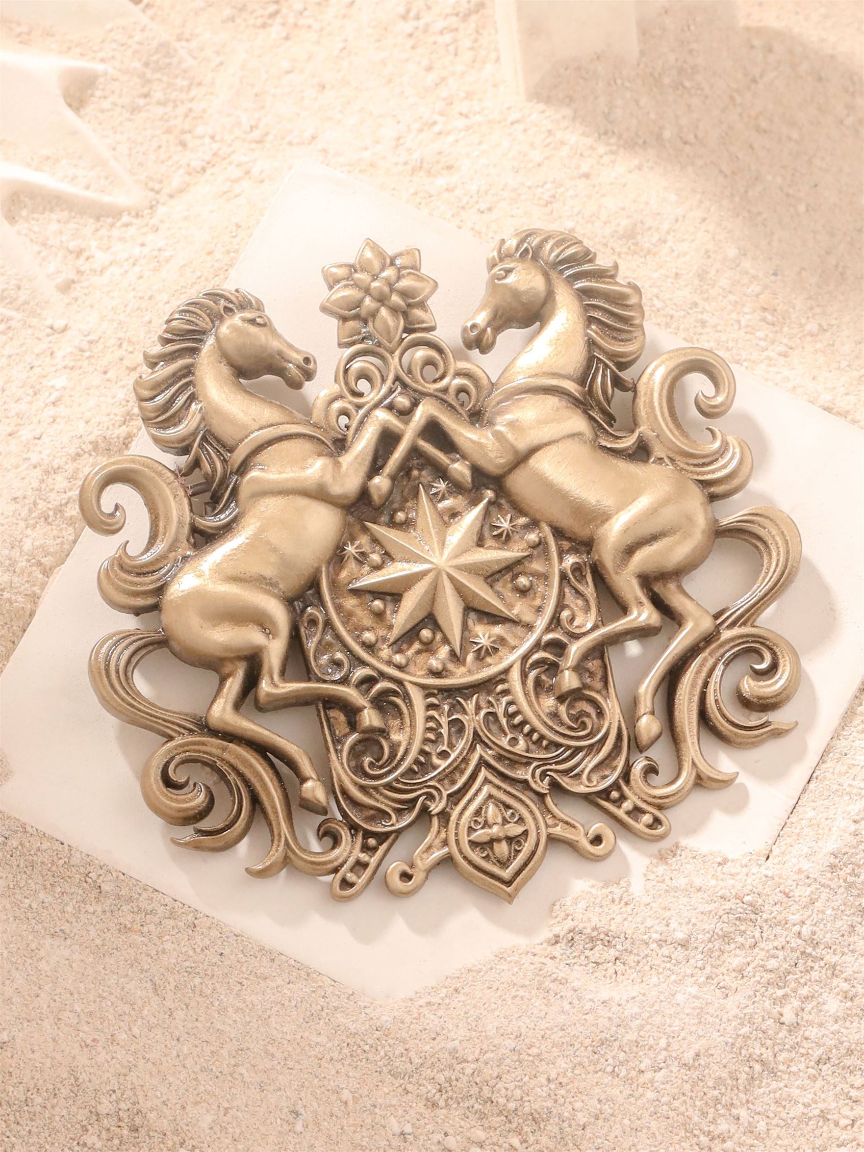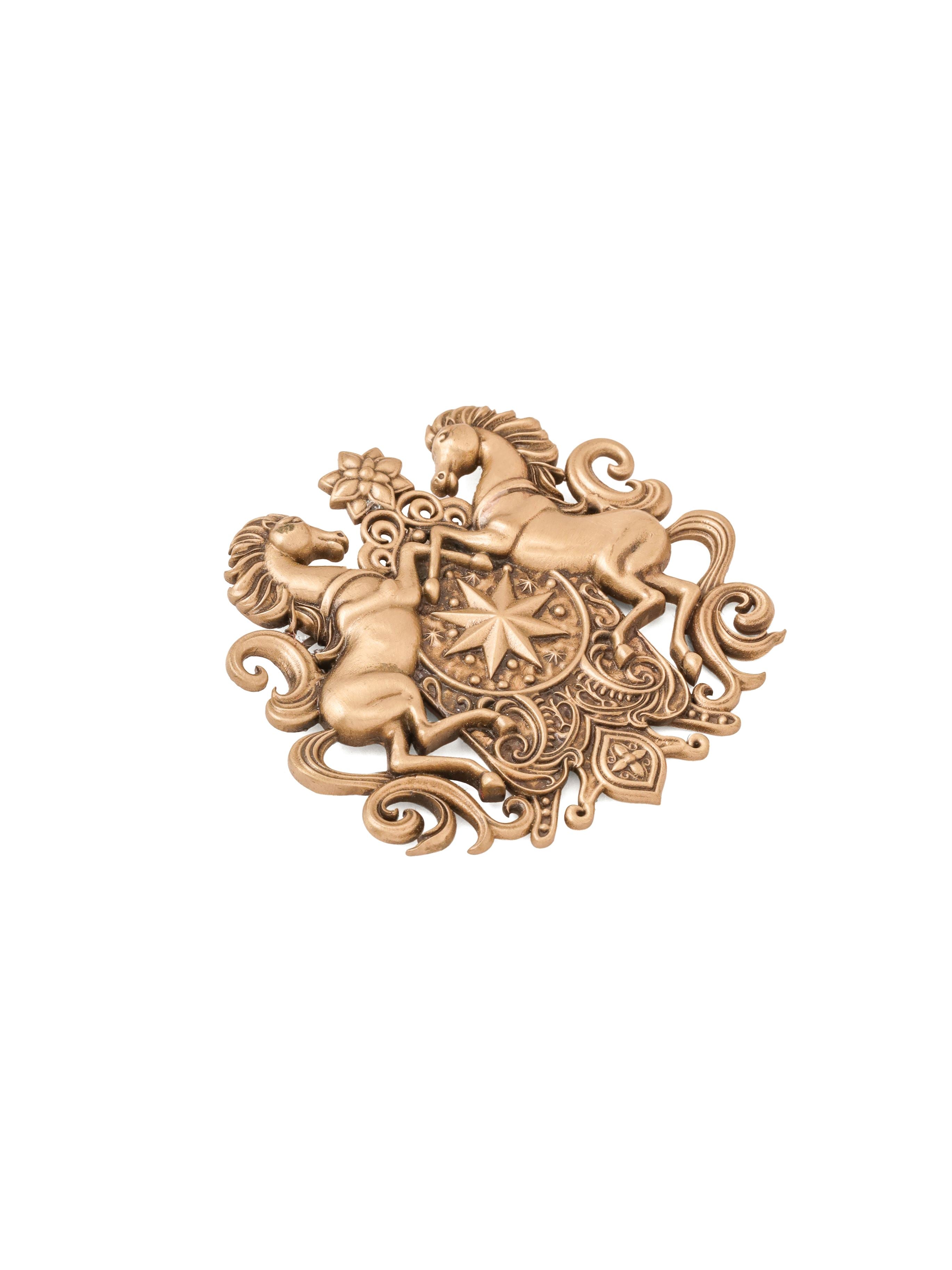 | Embrace the grandeur of ancient heraldry with this lightweight brass brooch, perfect for adorning coats, jackets, and bandhgalas. Featuring two rearing stallions guarding a majestic star emblem, this piece evokes a sense of nobility and timeless elegance, making it a distinguished accessory for any regal occasion. |