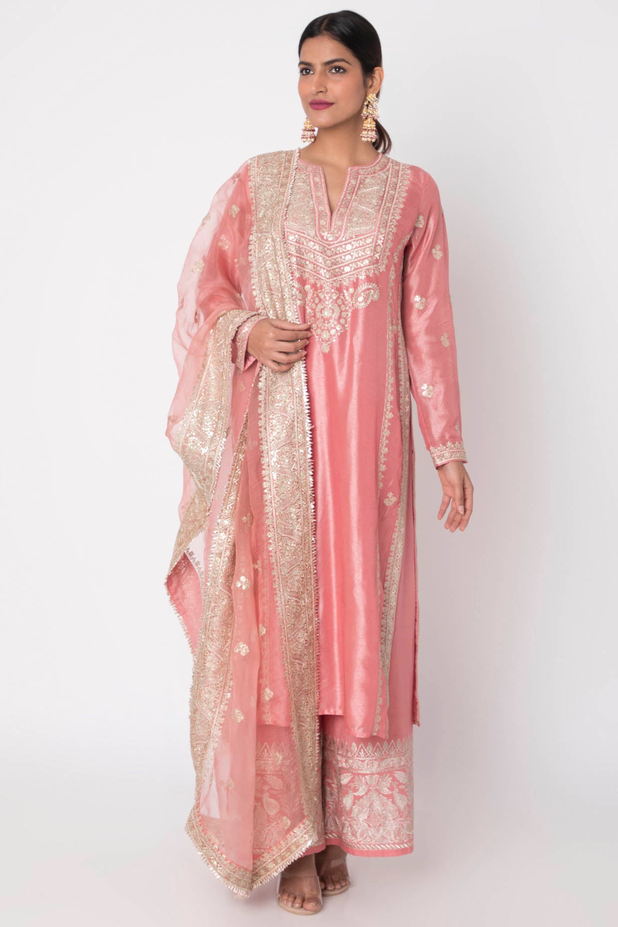 Featuring Graceful Kurta With Matching Embroidered Palazzo Pants. An Elegant And Classic Organza Dupatta To Make A Prefect Look!
