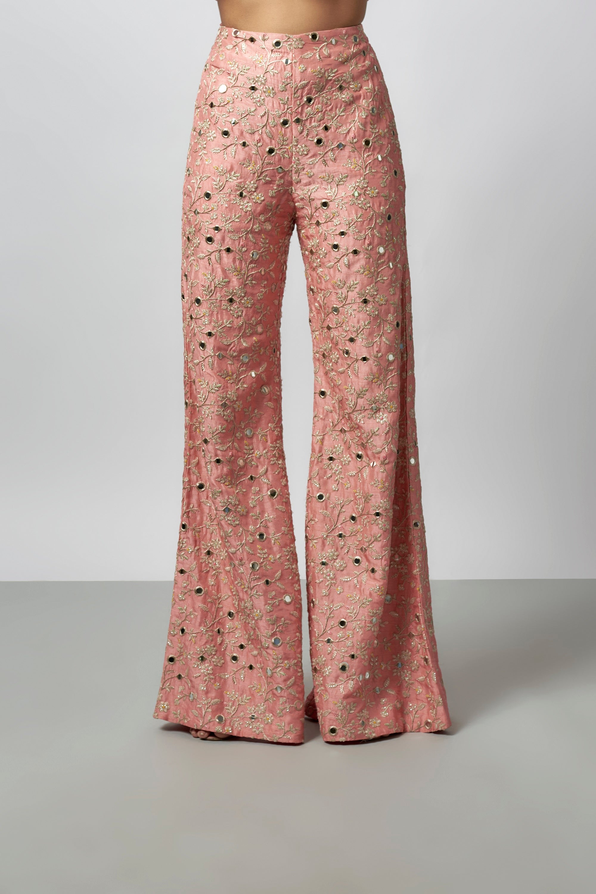This Pantsuit Features A Tailored Blazer Intricately Embellished With Delicate Floral Jaal Embroidery And Mirror Work, Featuring A Plunging Neckline. Paired With Flared Trousers That Echo The Same Detailed Embellishments Striking Boldness.