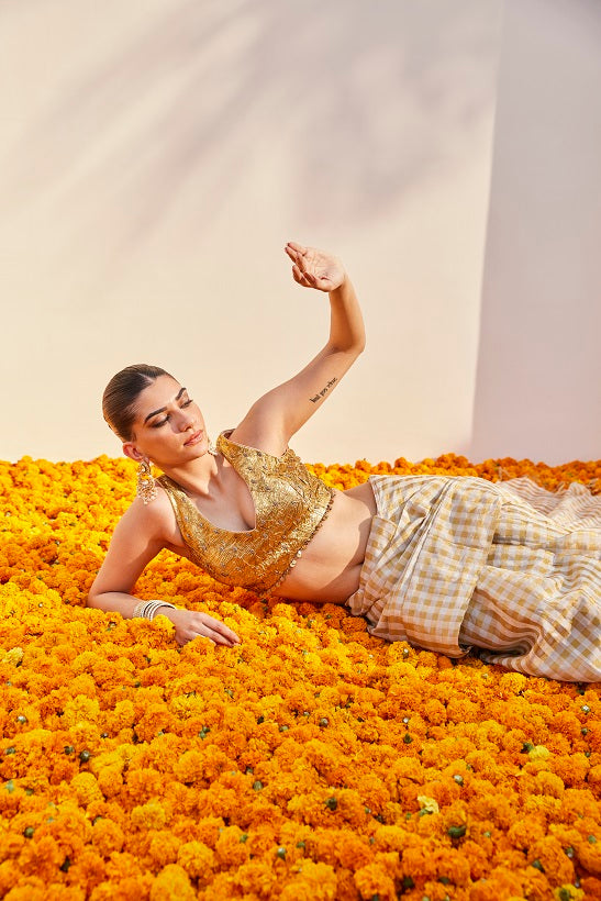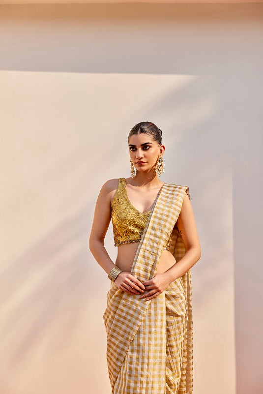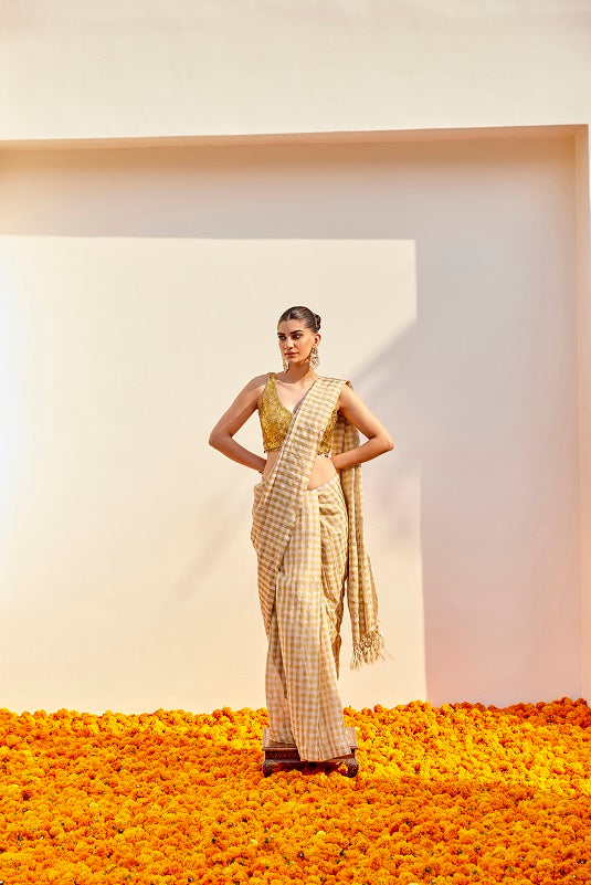 featuring with Gold colour Saree set with the grey silver checks on fabric the fabric is pure handwown tissue zari fabric it paired with saree and blouse.