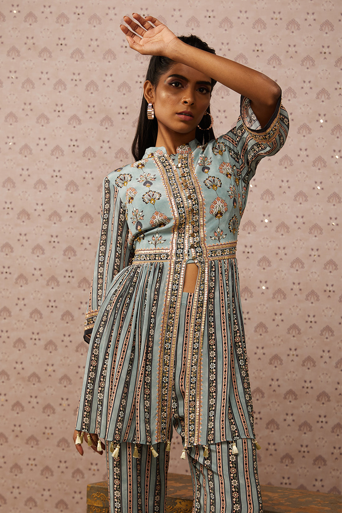 Featuring a crepe-based kurta set. It is paired with a crepe pallazo bottom.