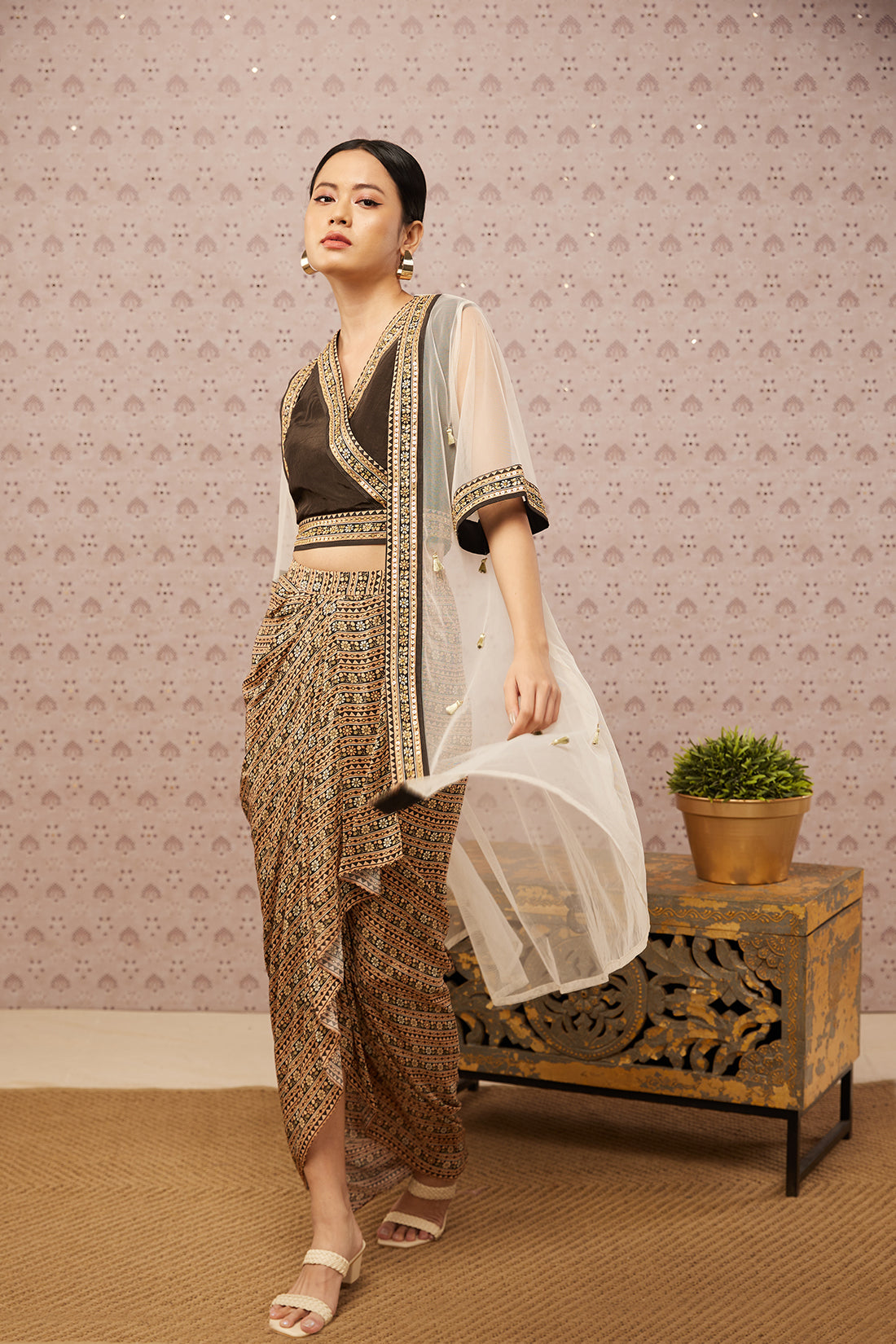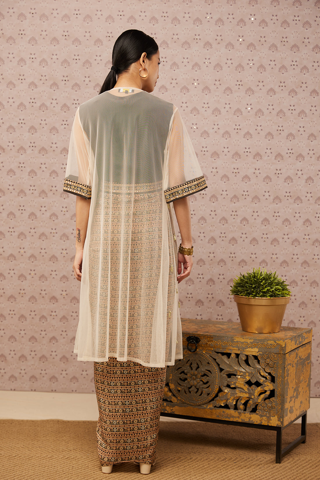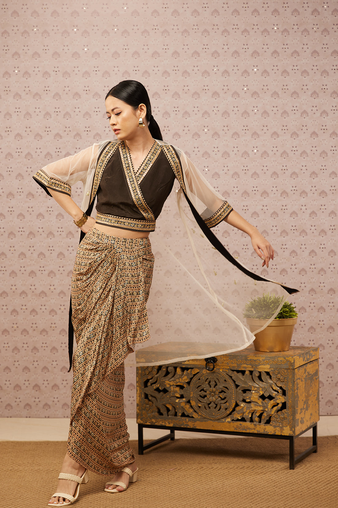 Featuring a black and cream drake skirt. It is paired with a crop top & a net Jacket