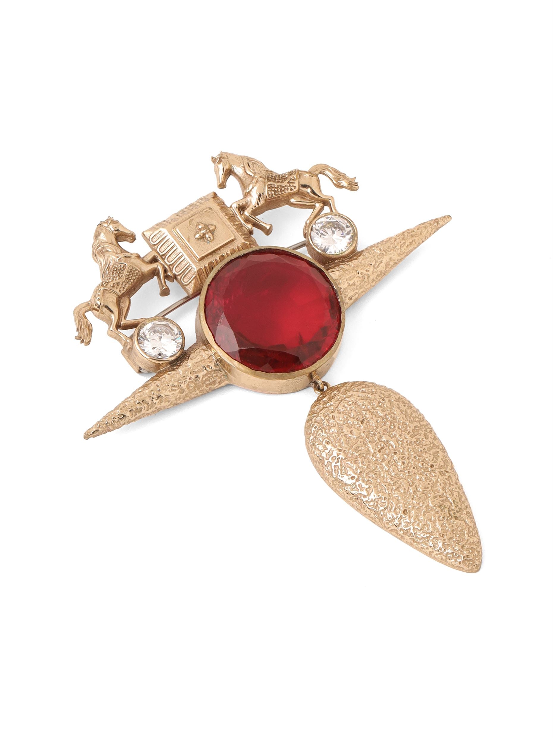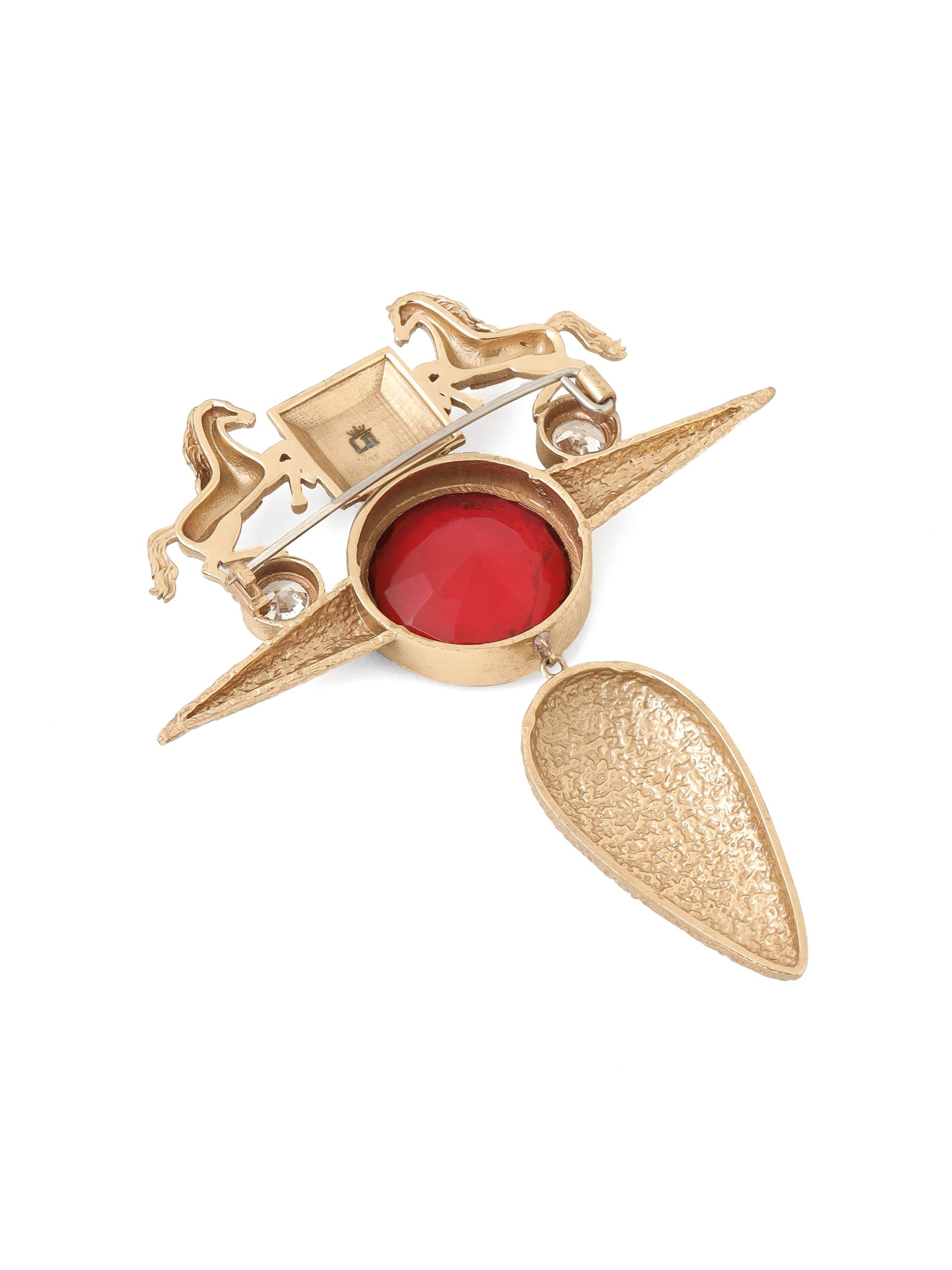 Elevate your style with the "Sawaar-e-Shaan Brooch," a graceful tribute to the spirit of horses. This exquisite accessory showcases two intricately designed horses, capturing their elegant form and boundless energy. Adorned with two small red gemstones representing their fiery spirit, it exudes a captivating charm. At the heart of the brooch lies a magnificent green gemstone, symbolizing the lush landscapes they gallop through. .