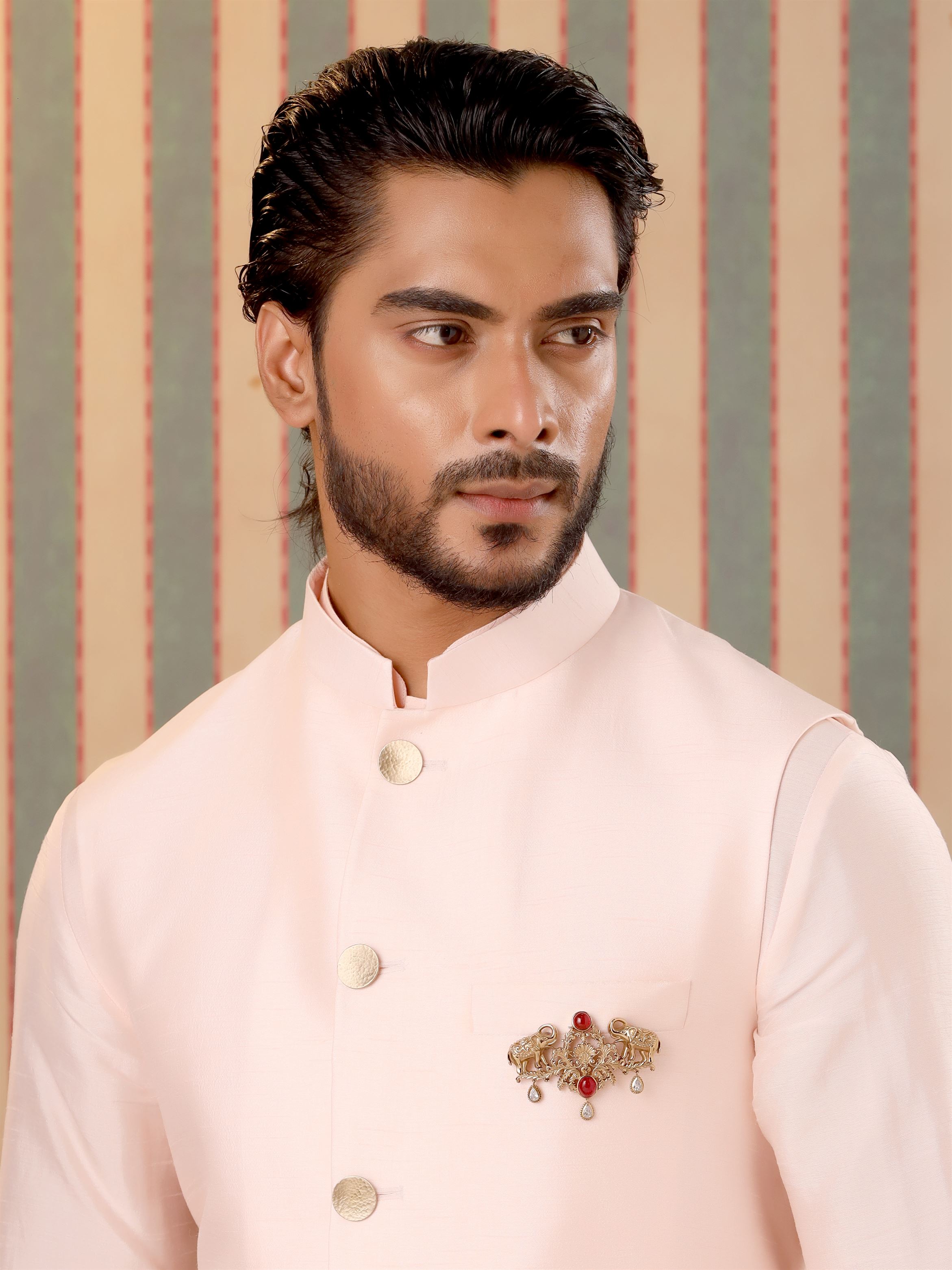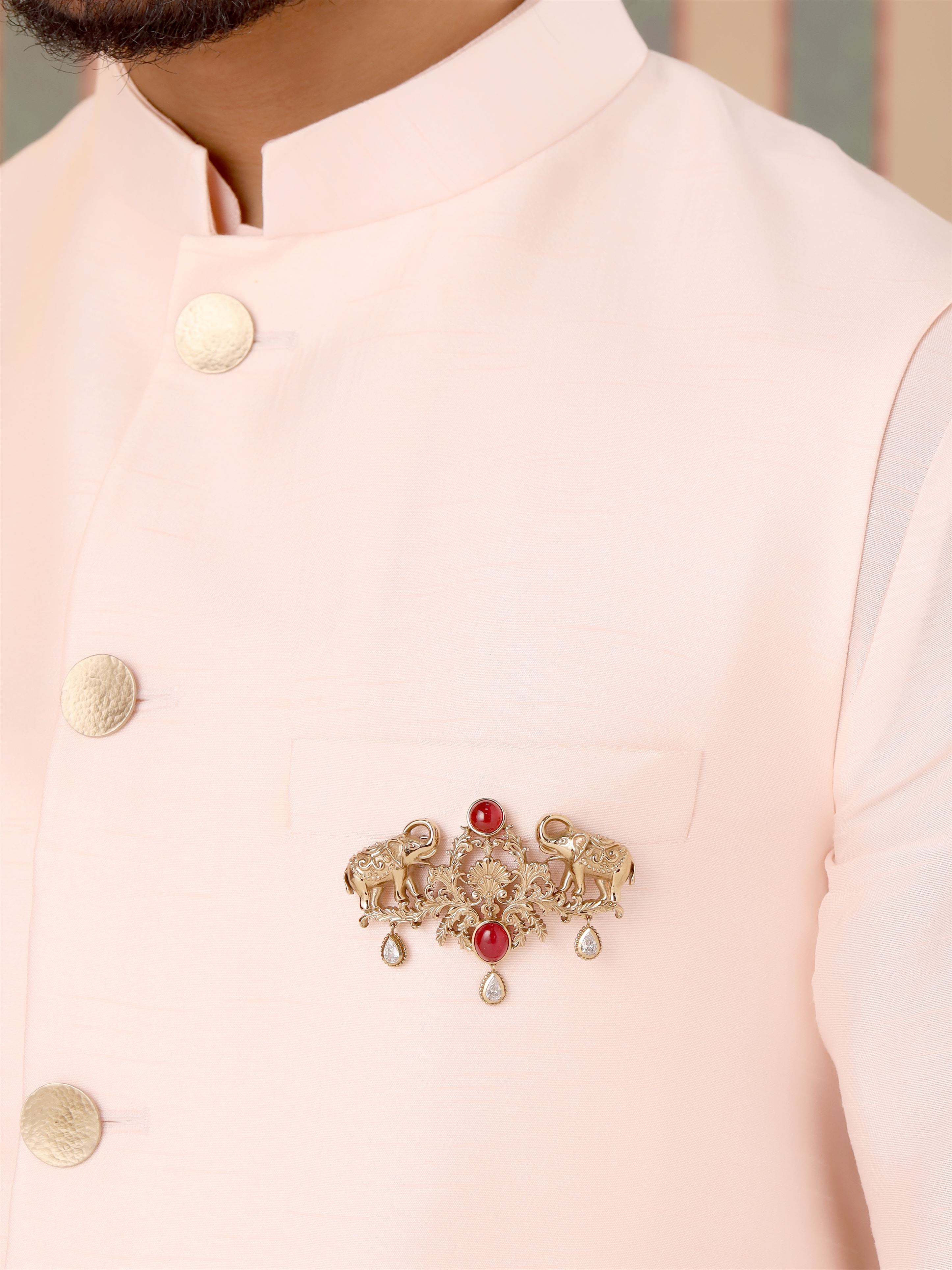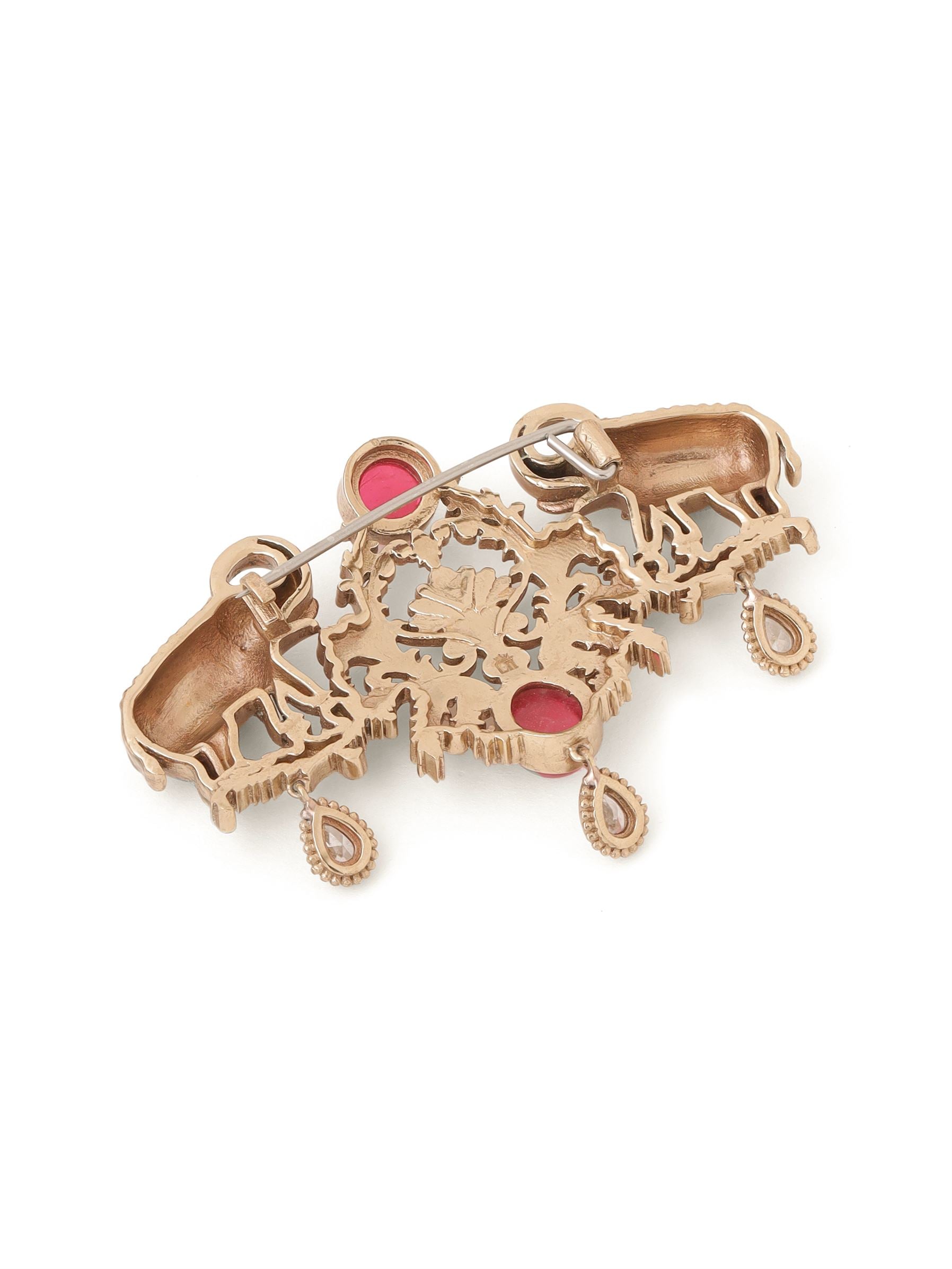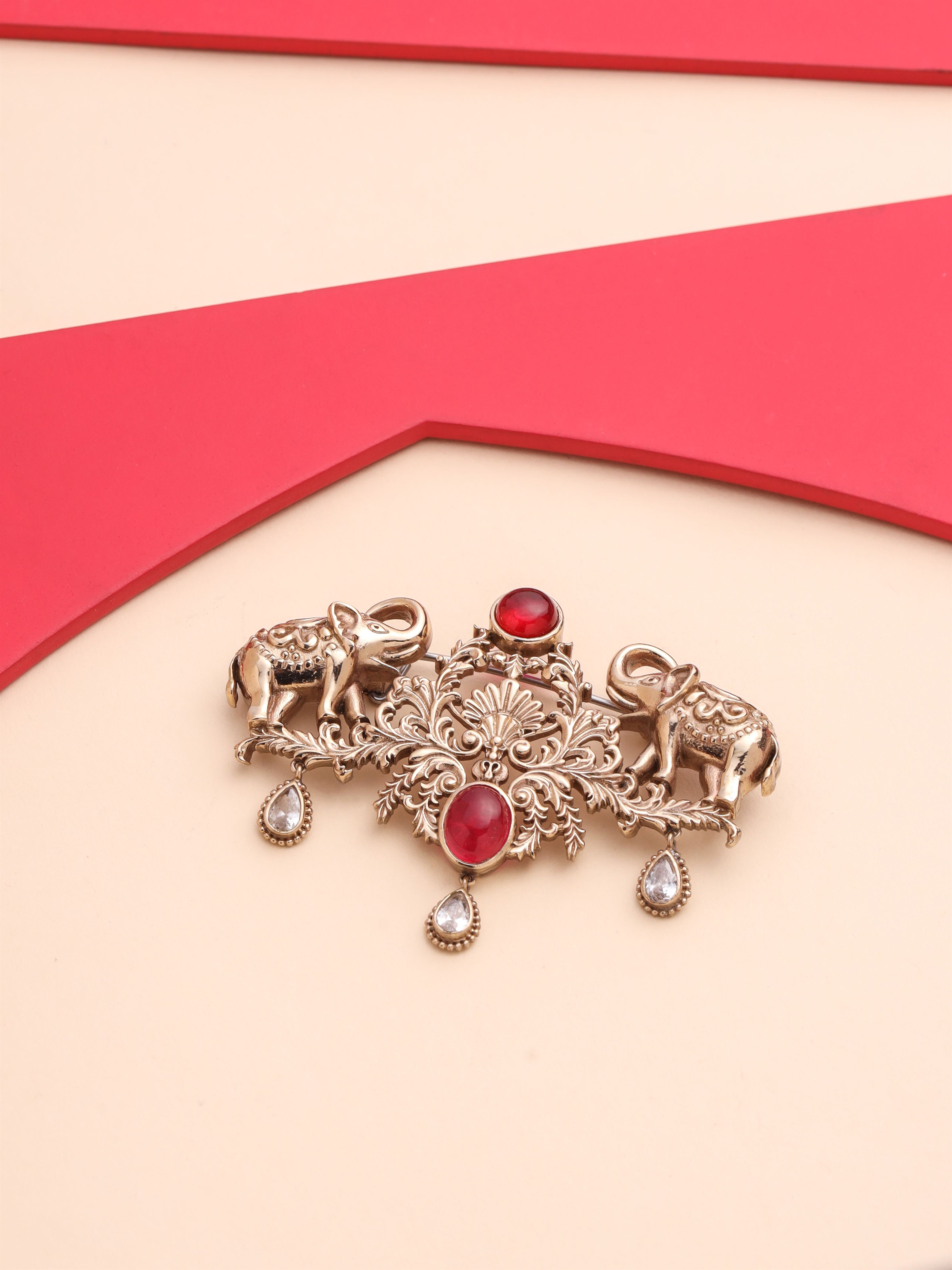 The Shaahi Haathi Brooch features a pair of charming elephants adorned with two red gemstones. The elephants are crafted with a graceful design, and the brooch serves as an elegant accessory suitable for various attires.