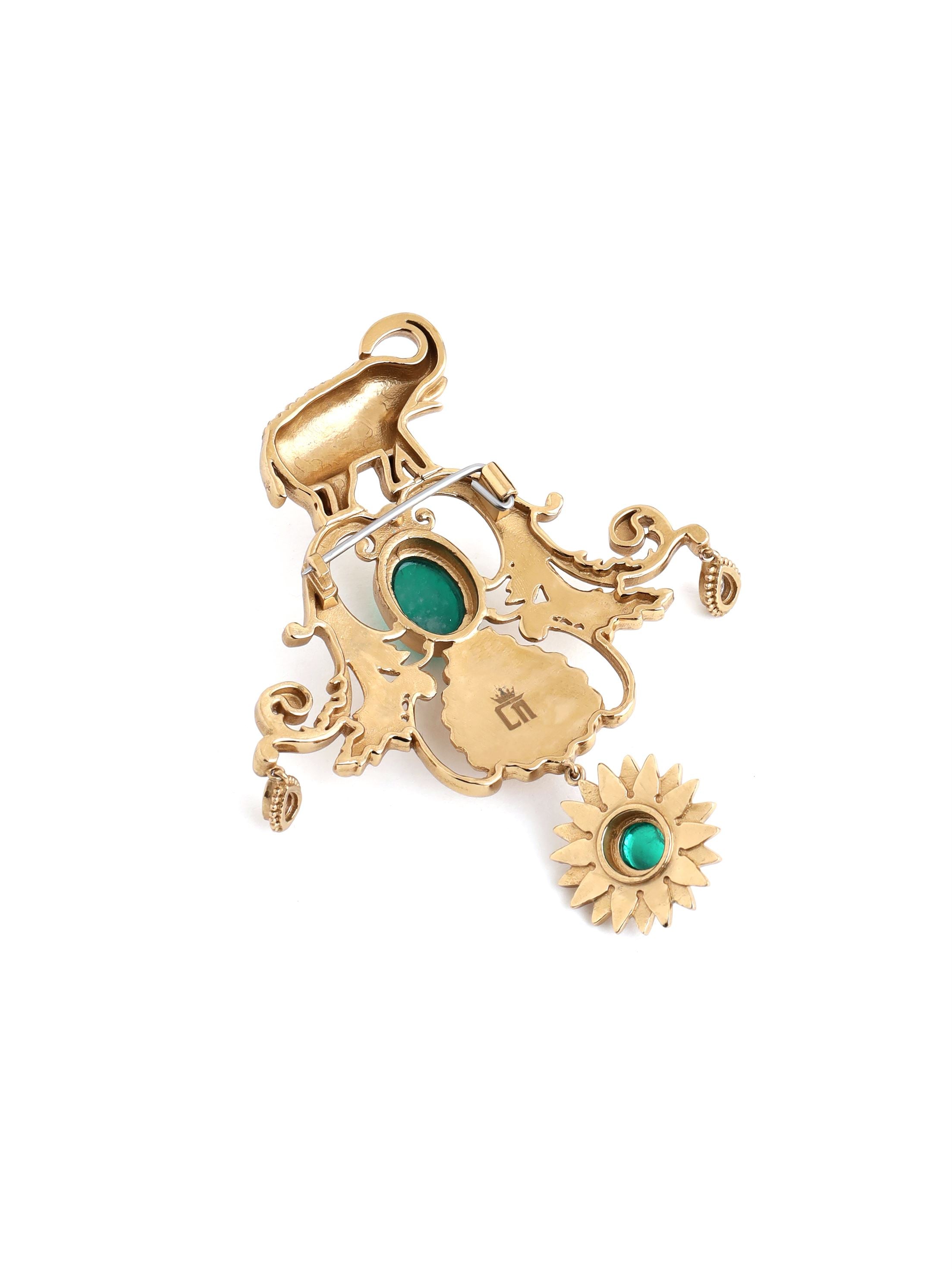 The Shaahi Haathi Brooch features a pair of charming elephants adorned with two red gemstones. The elephants are crafted with a graceful design, and the brooch serves as an elegant accessory suitable for various attires.