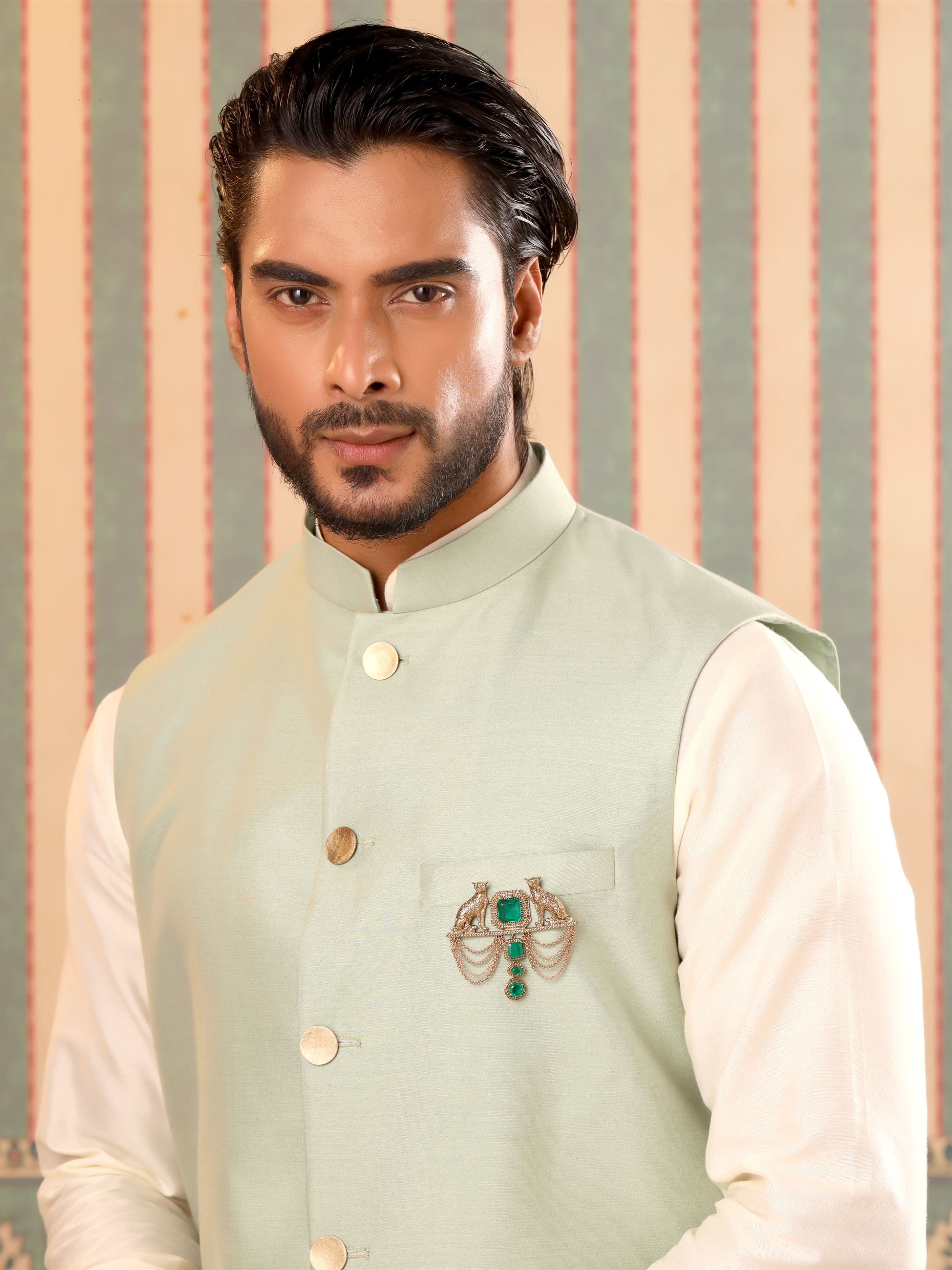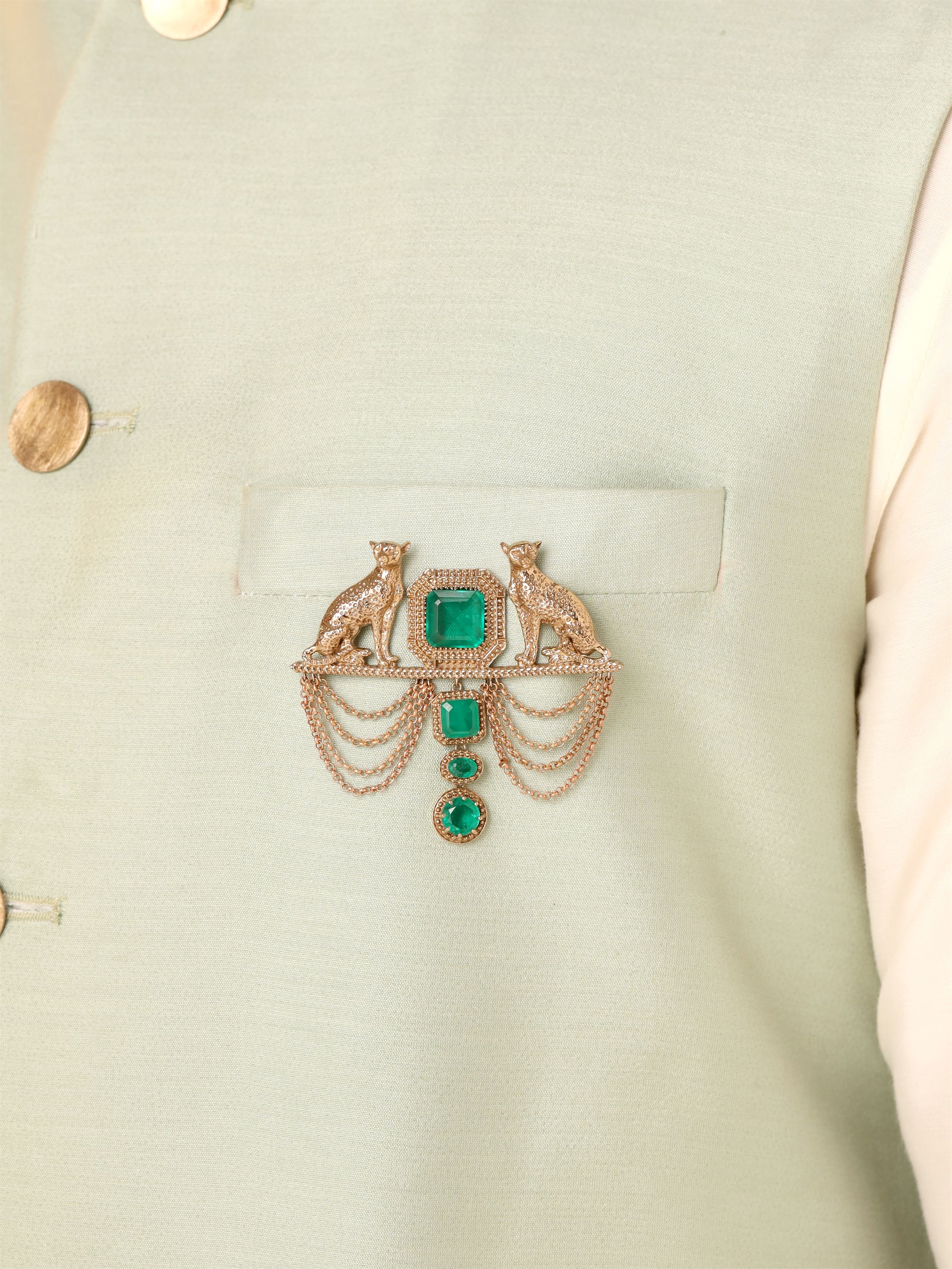The Shaandaar Cheetah Brooch features two poised cheetahs on its sides and three vibrant green gemstones. Its design embodies a dynamic charm, adding an understated accent to your ensemble