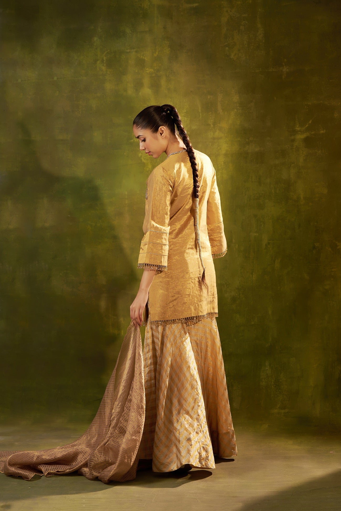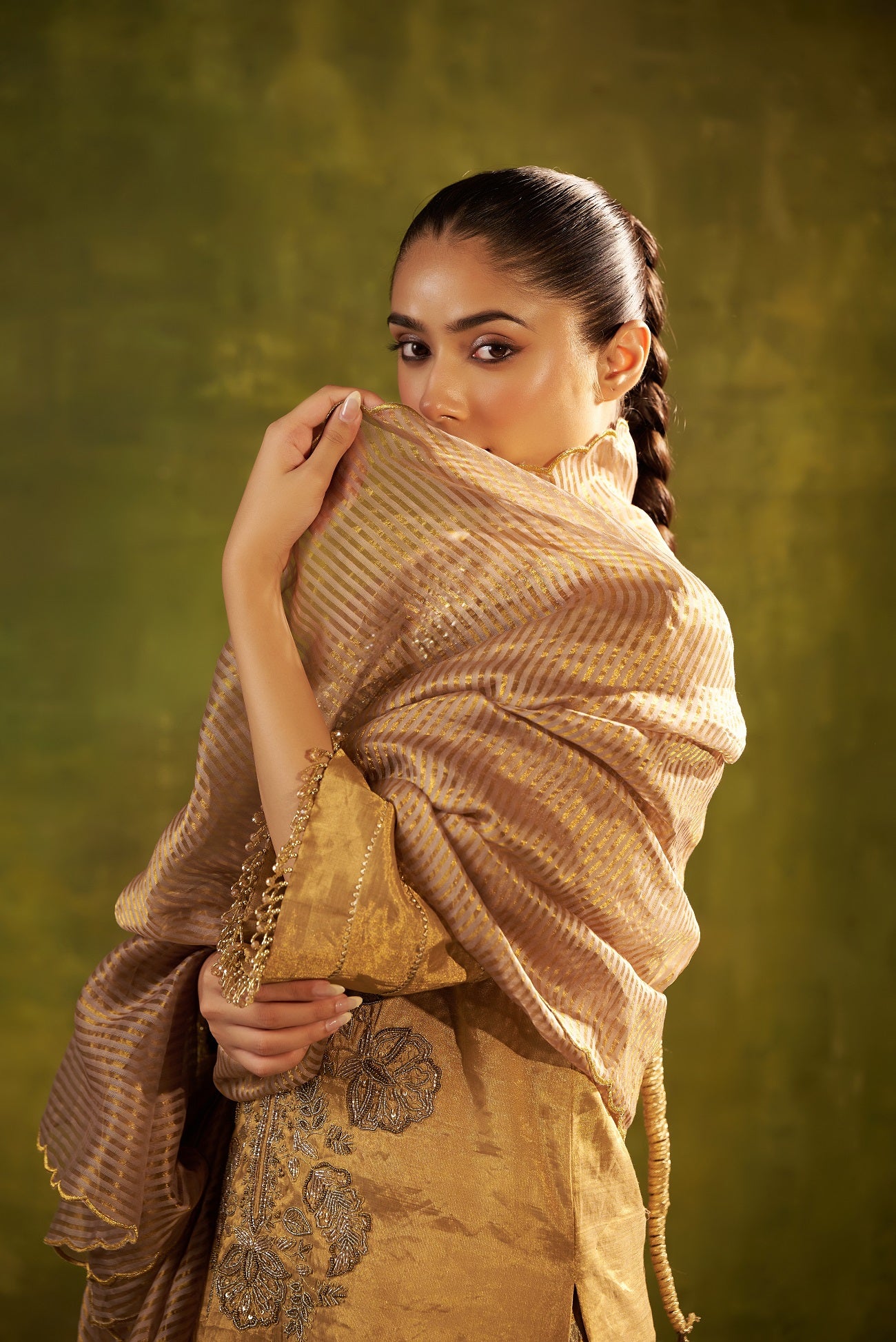 Gold love, Featured our gold embroidered shirt inspired with garden theme embroidery. Piared with tissue garara and banarasi dupatta.