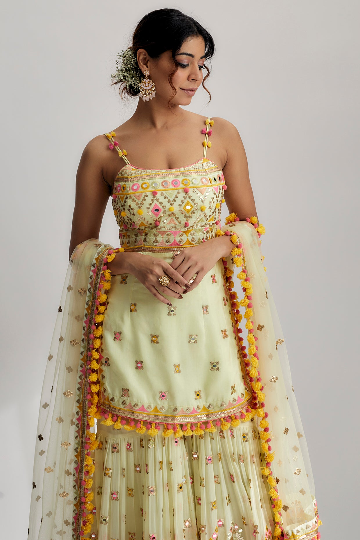Whether you're attending a festive occasion, a wedding celebration, or a cultural event, the Sonia Strappy Sharara Set will make you stand out with its intricate embroidery, sequins, and colorful embellishments. It embodies the perfect fusion of traditional craftsmanship and contemporary fashion, making it a unique and exquisite choice for those who appreciate timeless beauty.