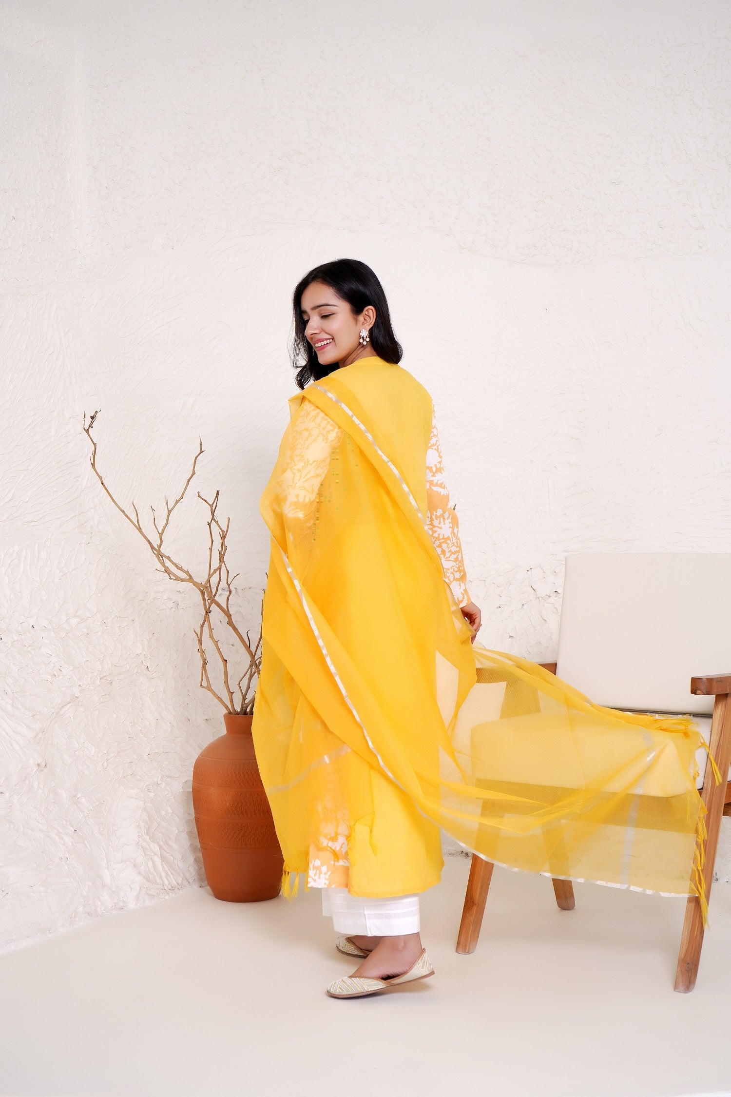 -Kurta in Sunflower Yellow and White Printed Fabric with gathers and panelling adding flare to the silhouette.