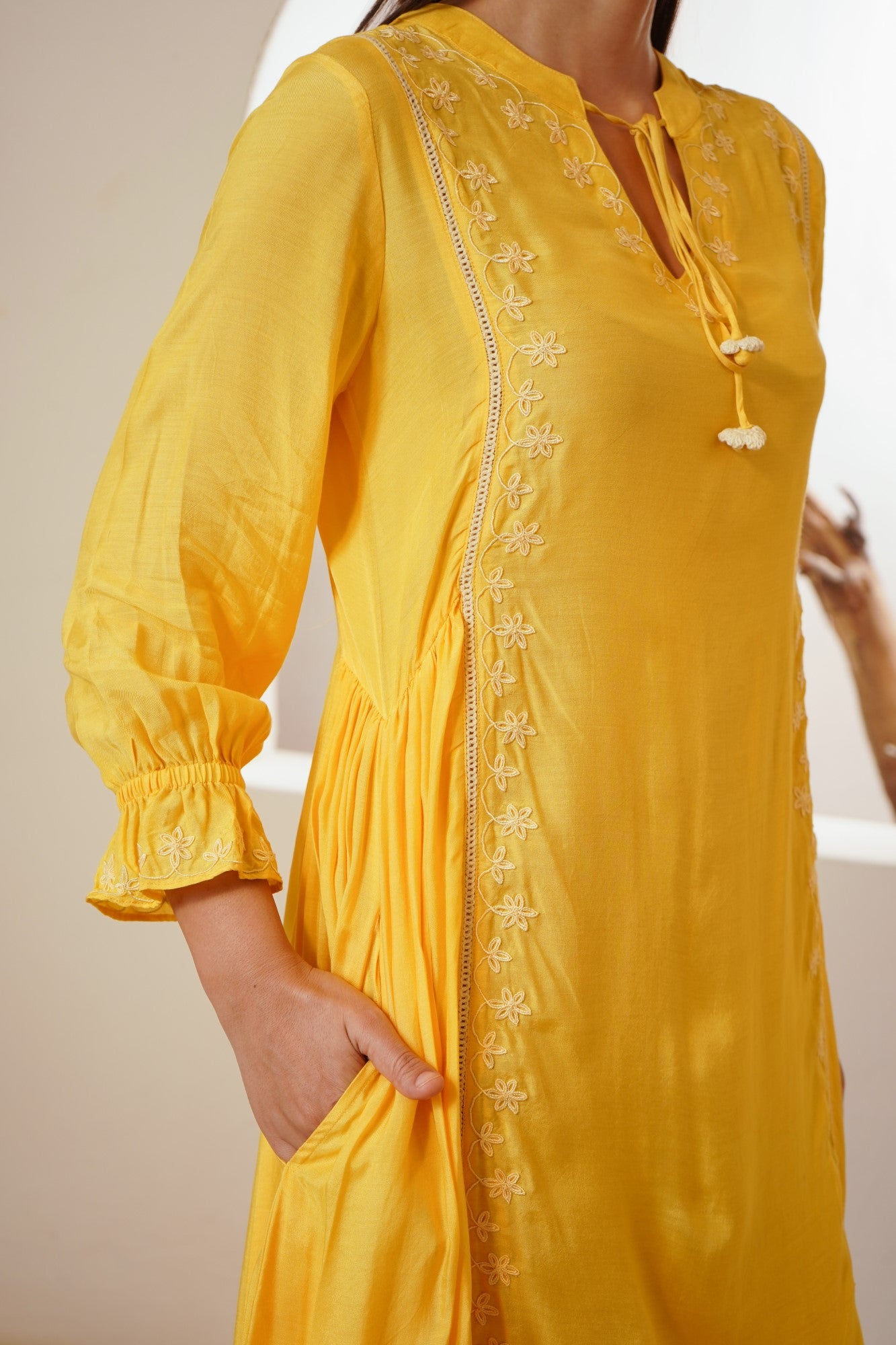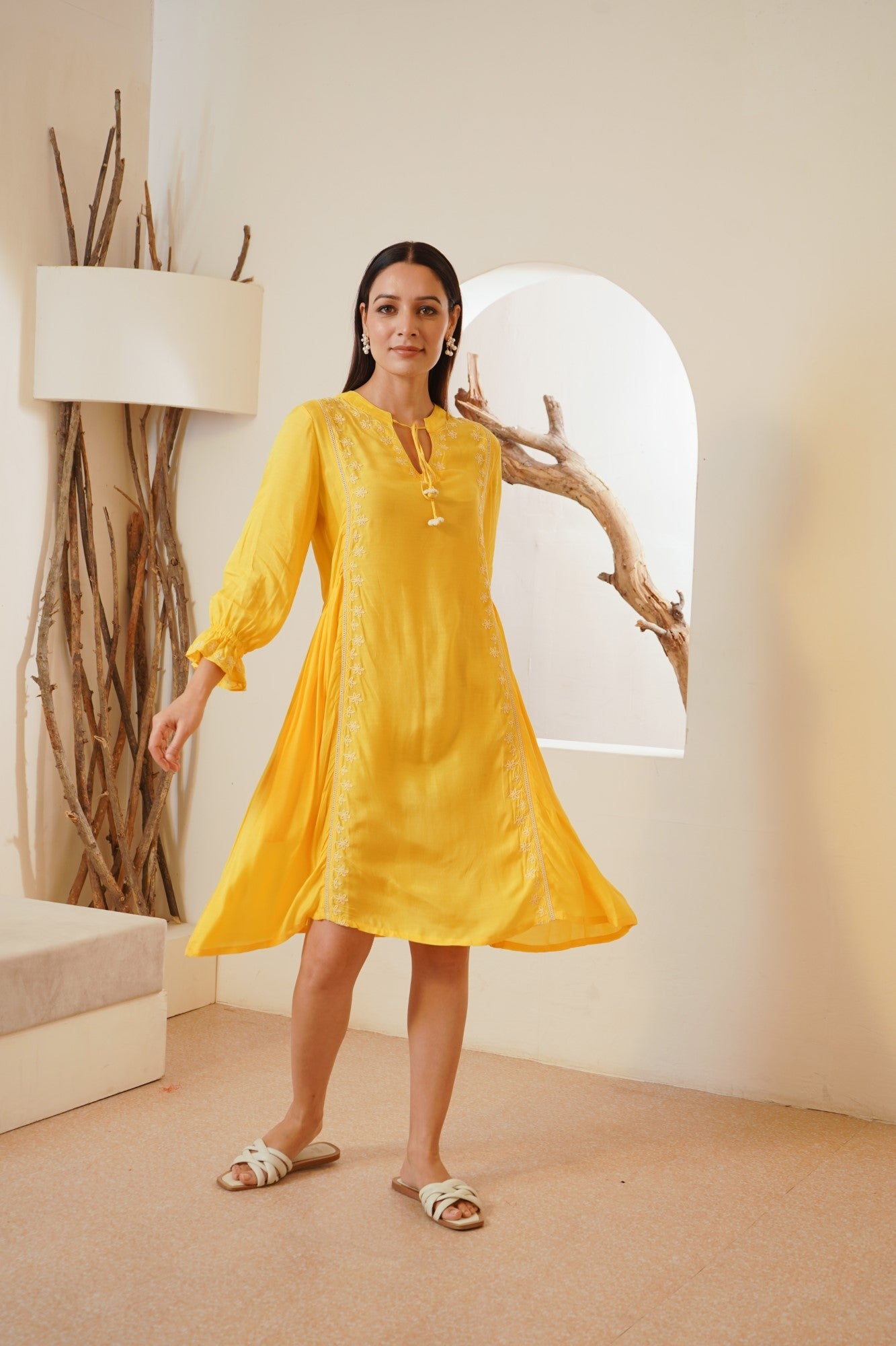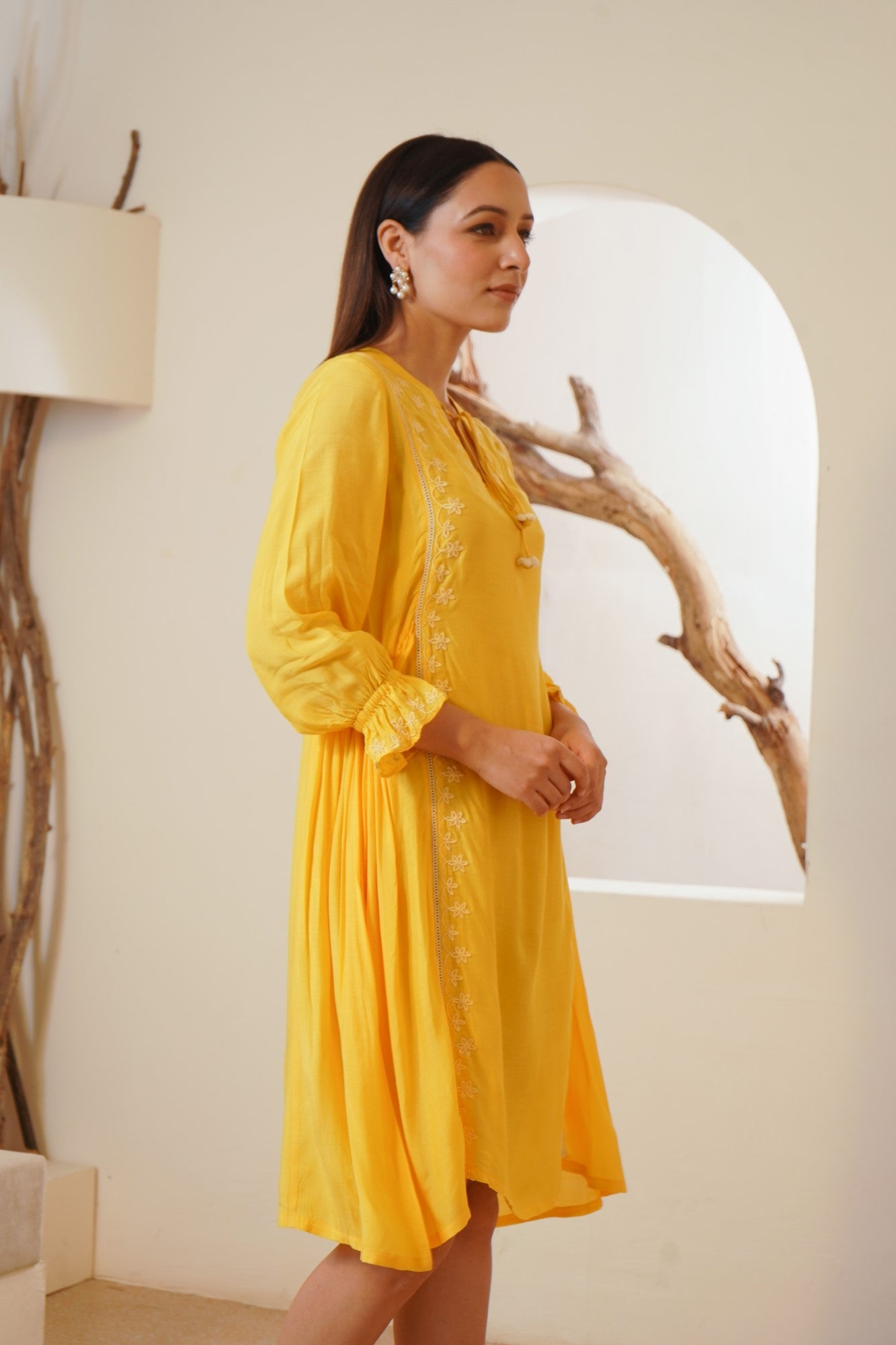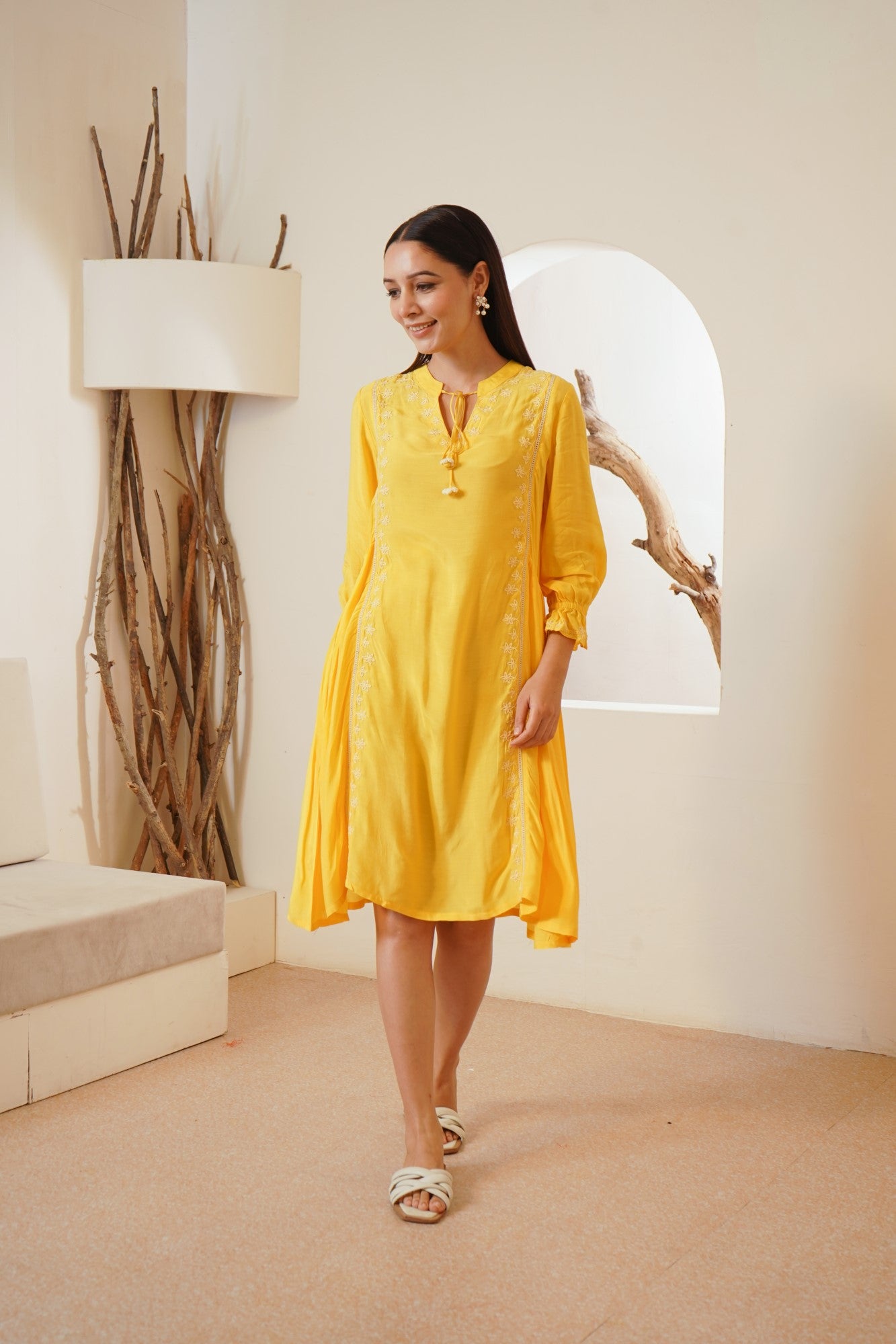-Dress in Yellow Silky Modal fabric with Offwhite dori embroidery on the neck and along the panels.