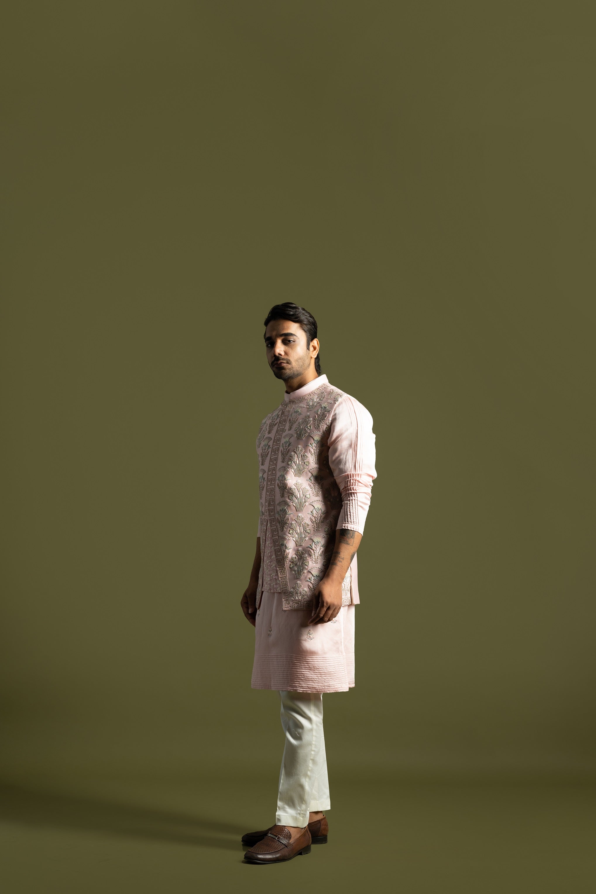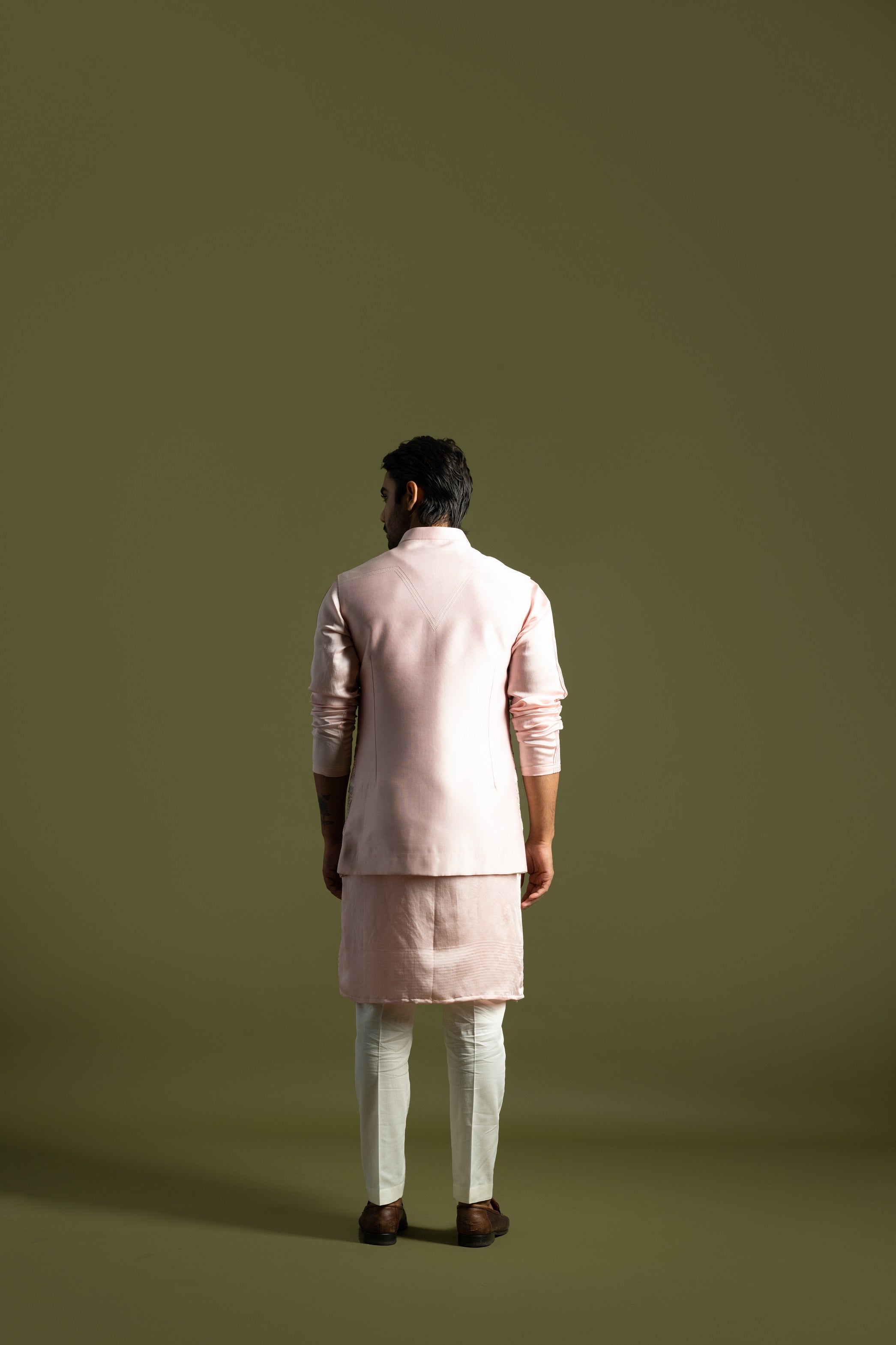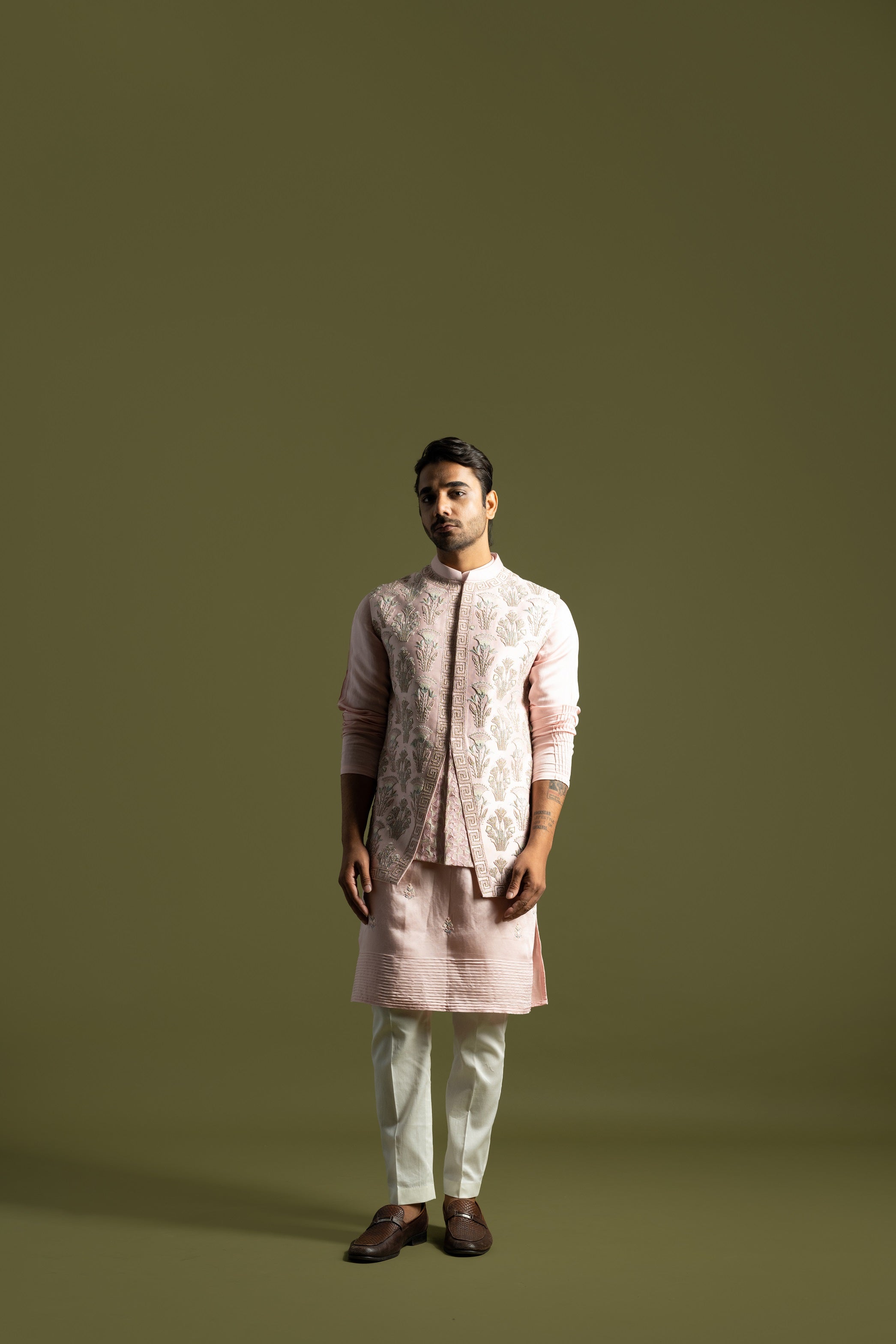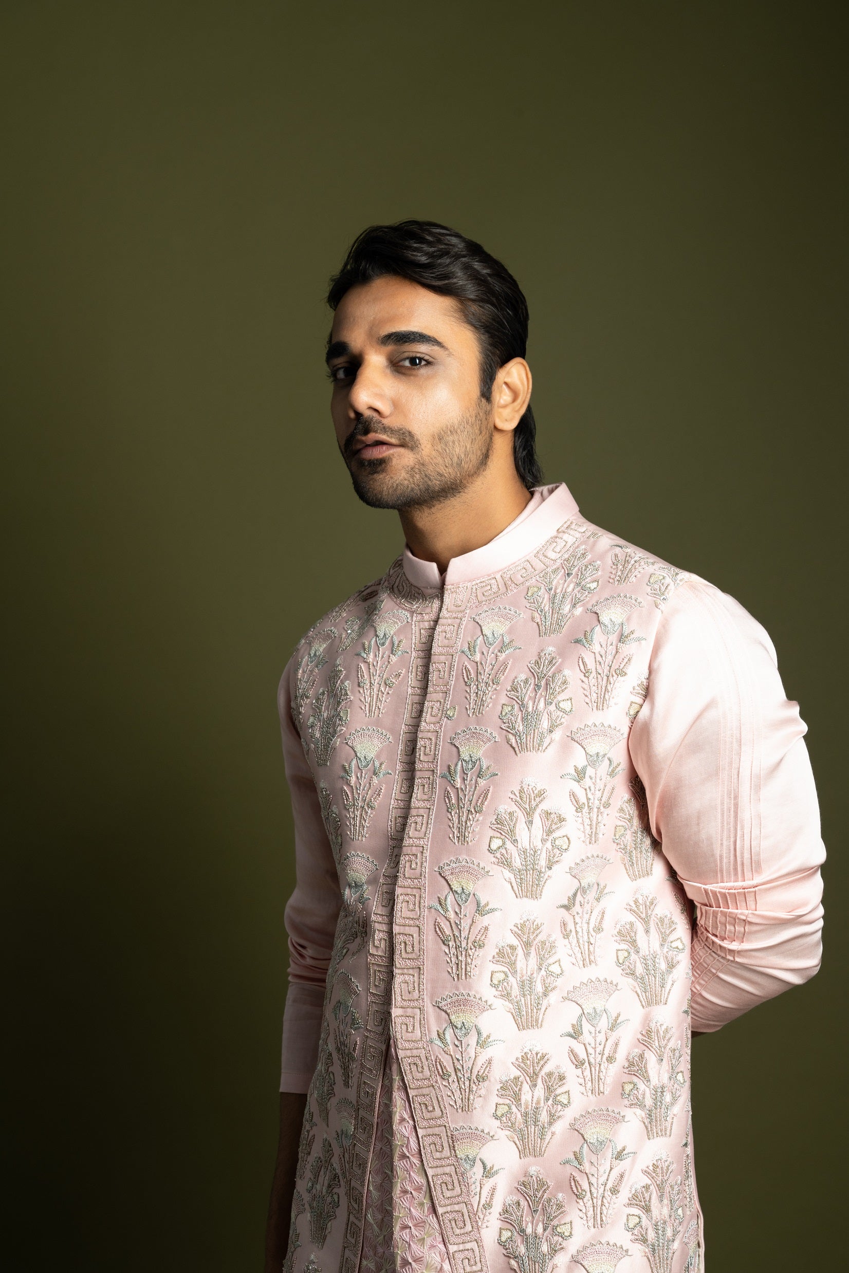 | SWEET PINK NEHRU IN CHANDERI WITH HEAVY CHIRWORK AND FRENCHKNOT MOTIFS ALL OVER. PAIRED WIT A POWDER PINK LINEN SATIN KURTA WITH PINTUCK DETAIL AROUND THE PLACATE WITH FLORAL EMBROIDERY MOTIFS ON THE BODY |