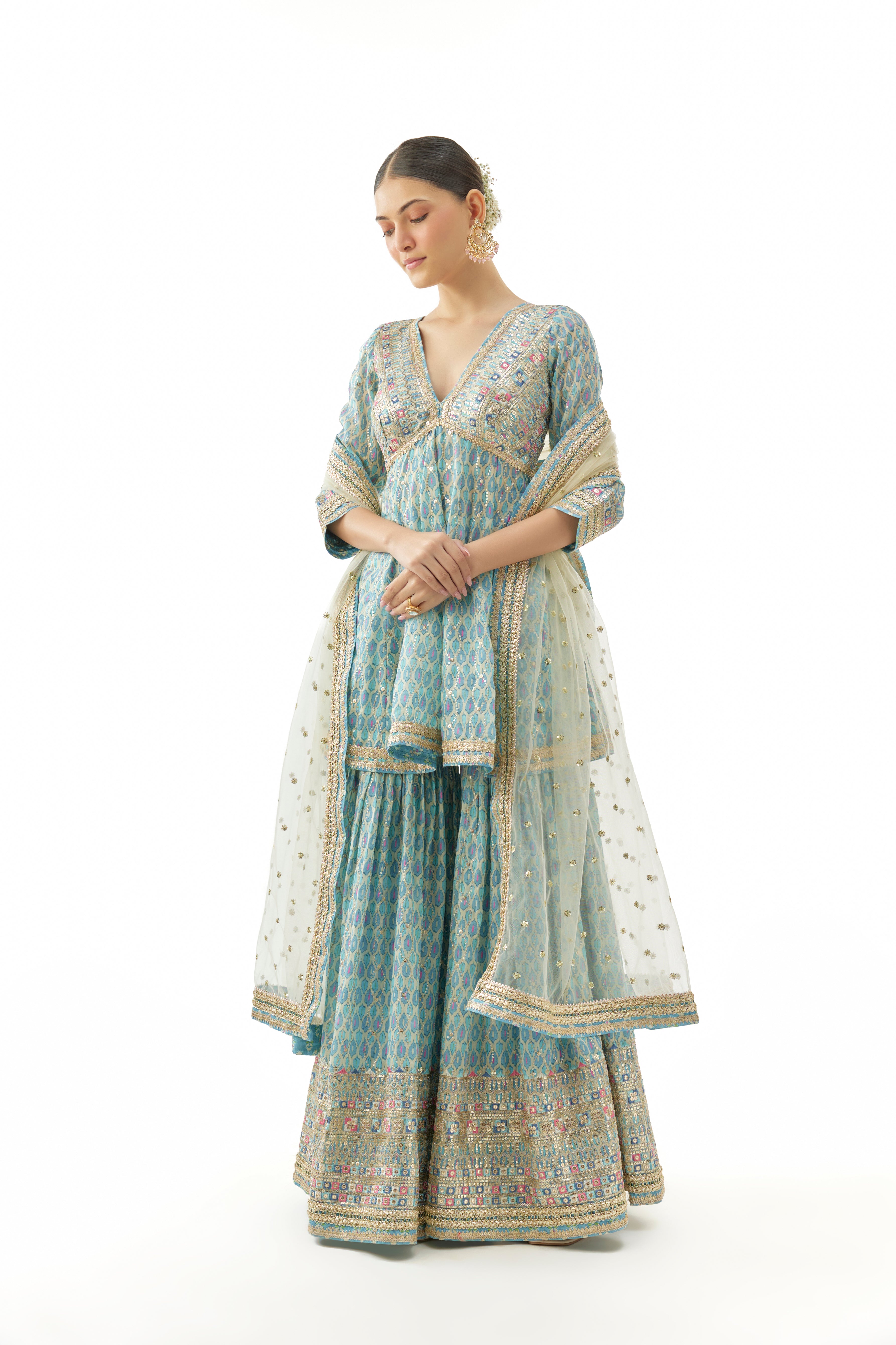 "This Elegant Ensemble Features A V-Neck Peplum-Style Kurta With Sleeves, Intricately Embroidered With Mirror Work And Pastel Thread Detailing Along The Neckline, Sleeves, And Hem. The All-Over Printed Fabric Adds Depth And Charm, While The Sahara Pants Flow Beautifully With Delicate Embroidery At The Borders For A Rich, Festive Finish.