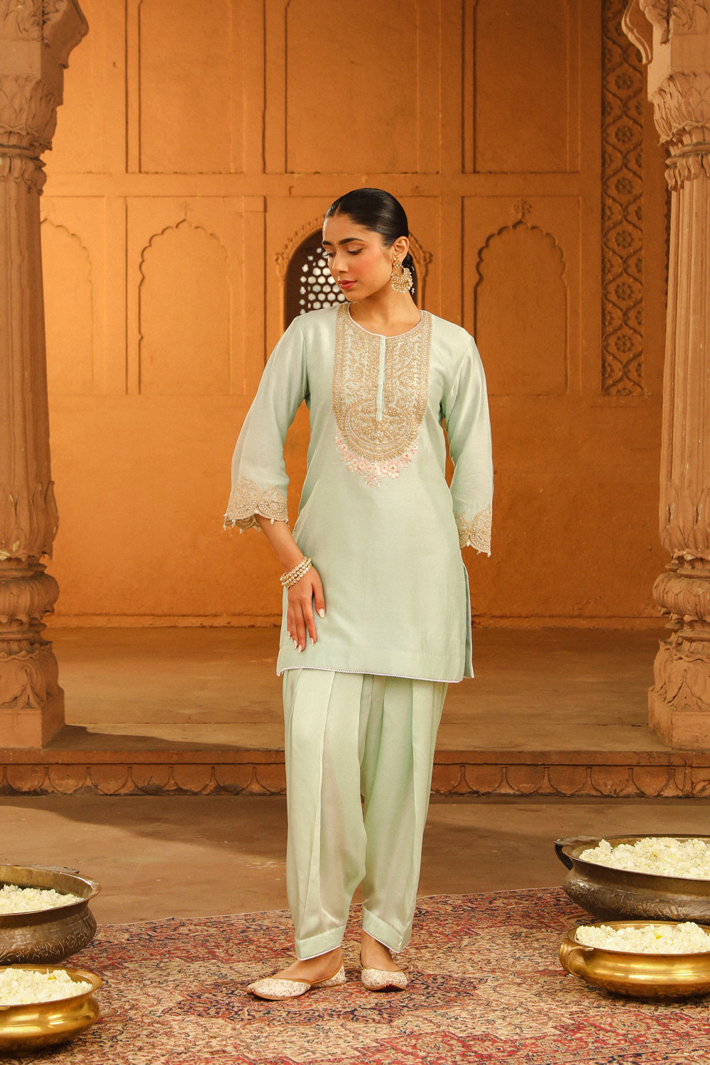 Ensure that the kurta's design complements the misty green color of the salwar. If the kurta has intricate detailing, keep the salwar simpler to balance the overall look.