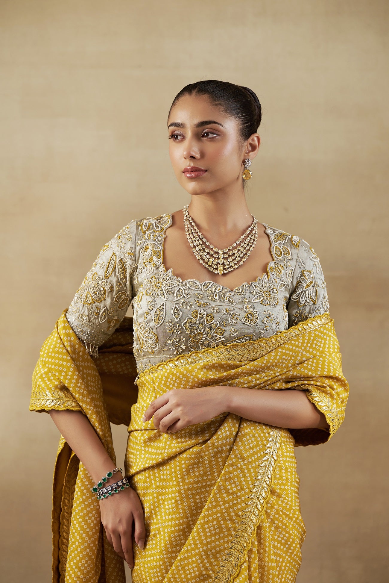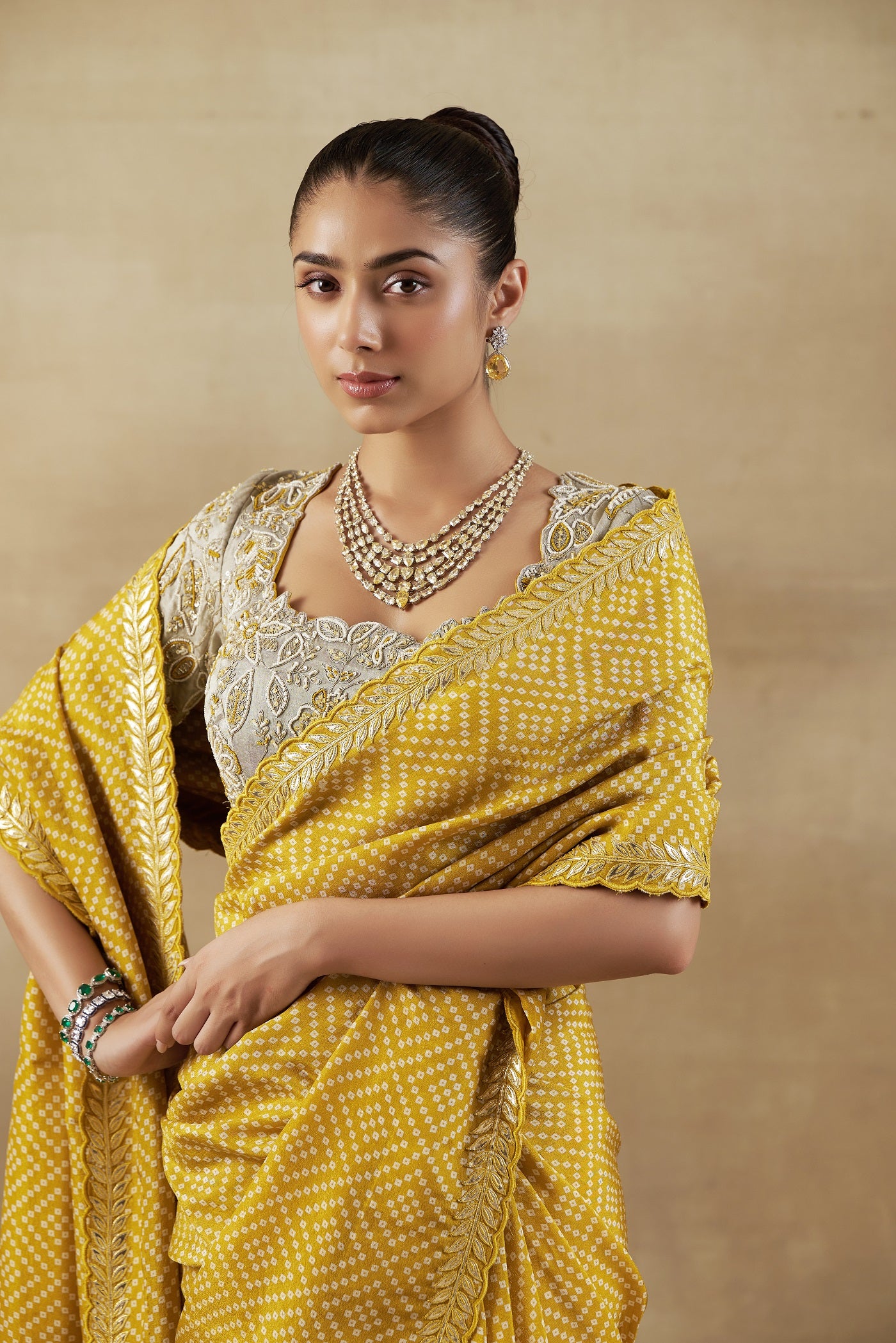 "Featuring our elegant yellow bandhani tissue saree