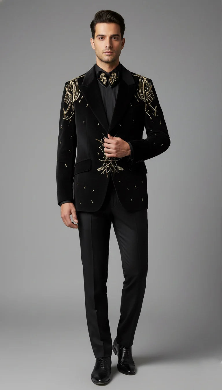 Crafted from rich Italian velvet, this black tuxedo set exudes depth, refinement, and timeless elegance. The fabric showcases a finely textured, plush surface that subtly plays with light and shadow, creating a dimensional, sophisticated finish rather than a flat matte look. The premium velvet has a soft, smooth hand-feel while maintaining tailored structure, allowing for sharp lines and a sculpted silhouette. Its weight and drape give the garment a regal presence, making it ideal for formal evenings, black-tie events, weddings, and luxury celebrations. This tuxedo seamlessly blends classic formal tradition with modern velvet sophistication—perfect for the man who wants to stand out with understated power.