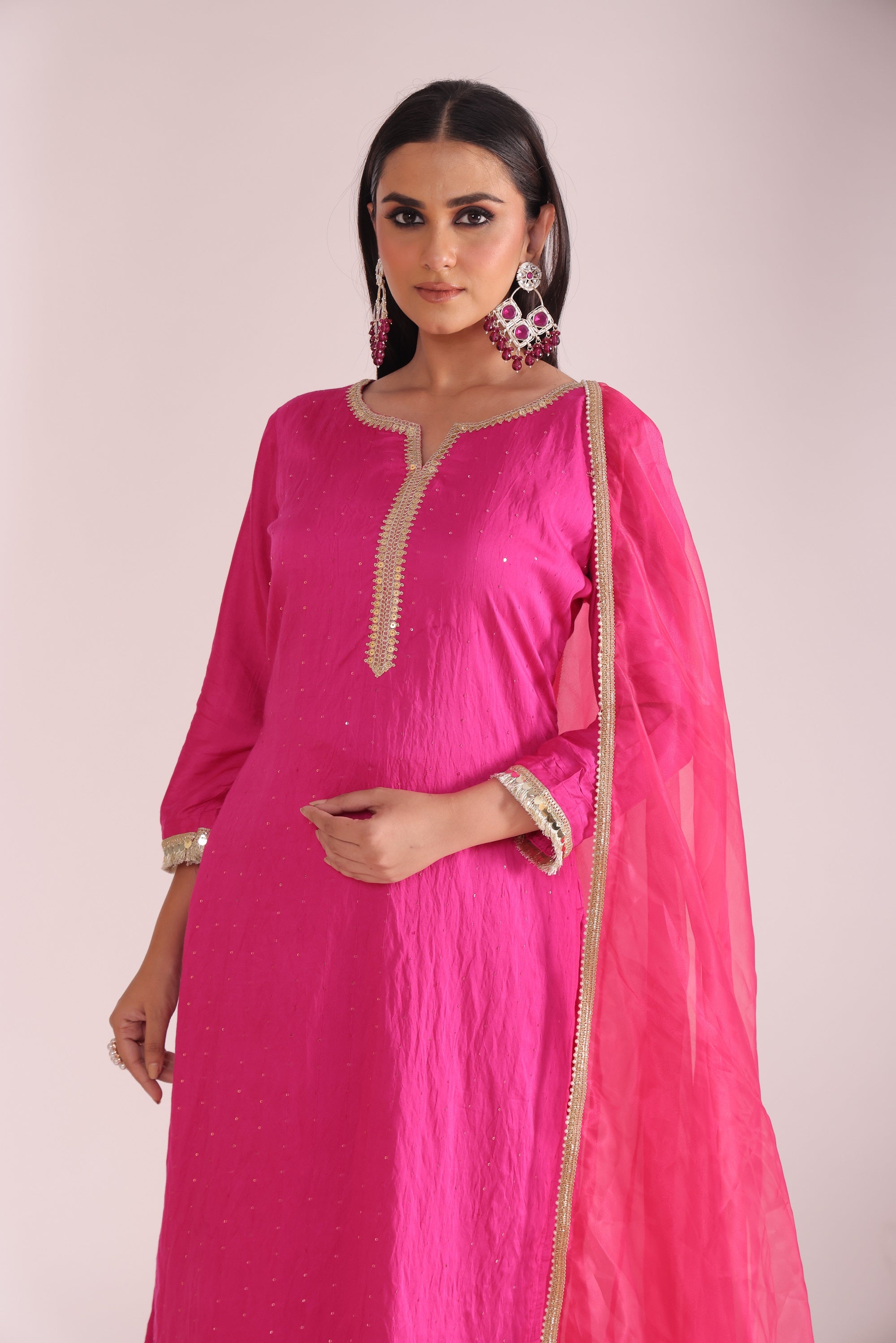 ".This Three Piece Set Includes Kurta, Palazzo And Dupatta This Set Includes A Fuchsia Sequin Chanderi Kurta, Coordinated Pants, And Organza Dupatta. Crafted In Shimmering Sequin-Embroidered Chanderi, The Kurta Features A Sequin-Detailed Neckline, Along With Delicate Sequin Accents On The Sleeve Hems And Kurta Hem. The Matching Pants Also Carry Subtle Sequin Detailing Along The Hem For A Coordinated Finish. The Look Is Paired With A Lightweight Organza Dupatta, Highlighted With A Refined Four-Sided Dori Border For A Polished And Festive Touch.