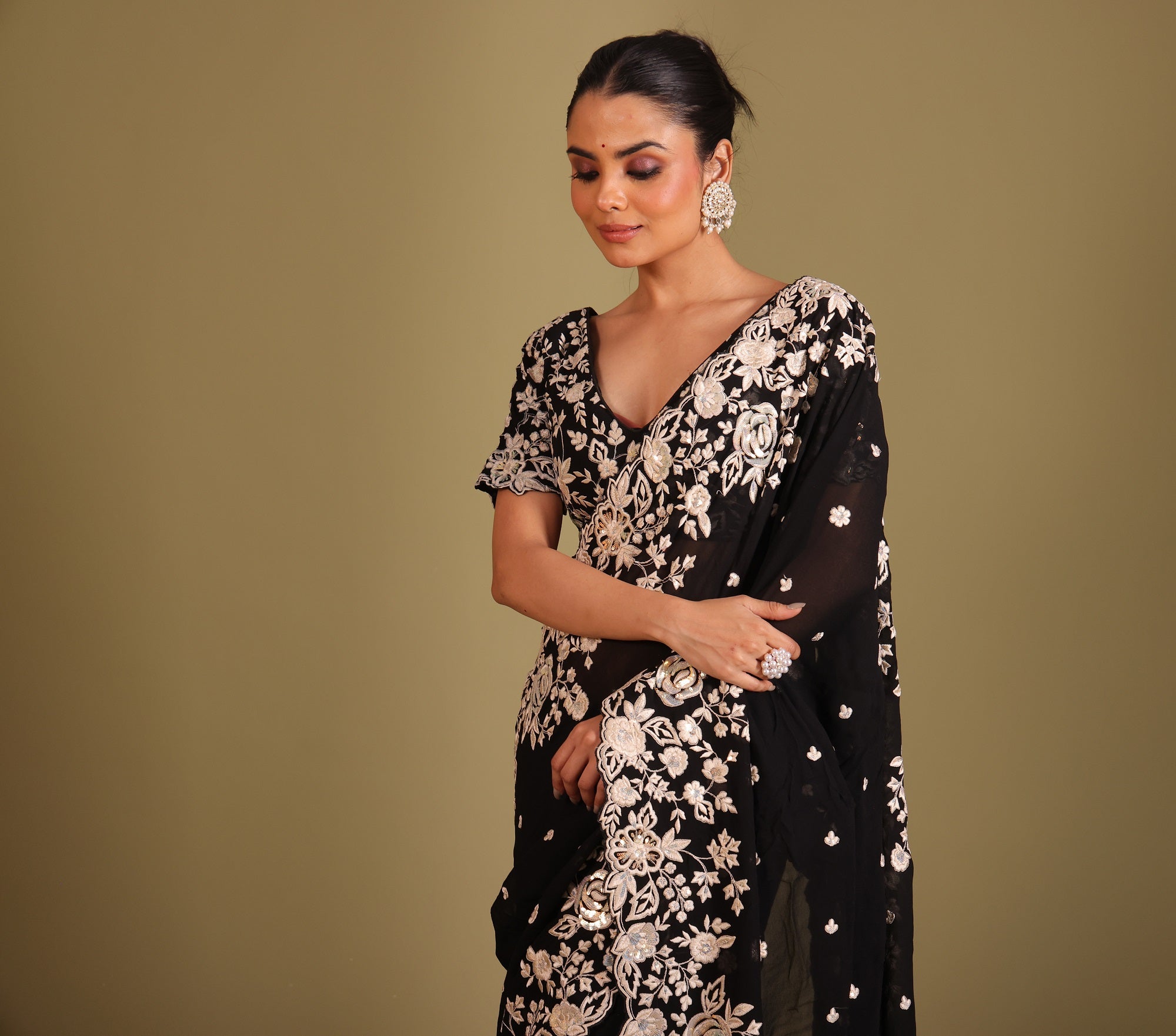 "This Set Includes A Black Georgette Saree With Intricate Embroidery. The Saree Features Exquisite Ivory Thread And Sequin Work Spread Gracefully Across The Body, Creating A Delicate Floral Booti Pattern. It Is Further Enhanced With Intricately Designed Floral Borders, Adding A Touch Of Elegance And Craftsmanship Throughout The Drape.