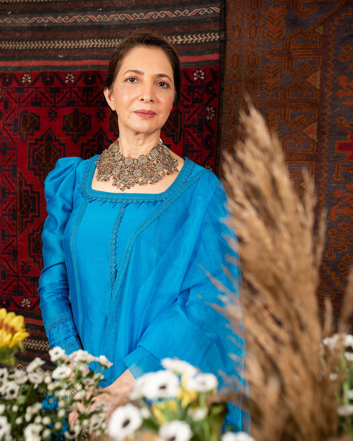 Featuring an azure blue kurta in organza and chanderi base. It is paired with matching sharara pants and a dupatta.