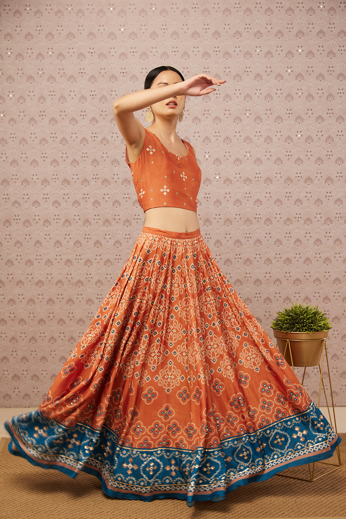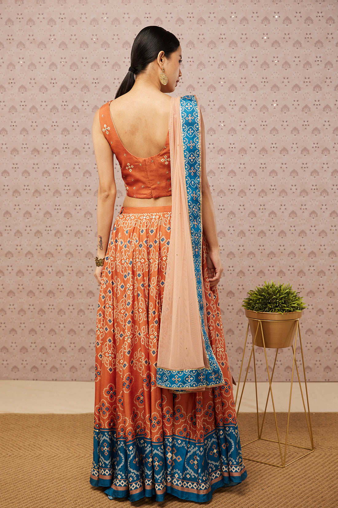 Featuring a rust cotton silk based lehenga set. It is paired with a crop top blouse and net dupatta.