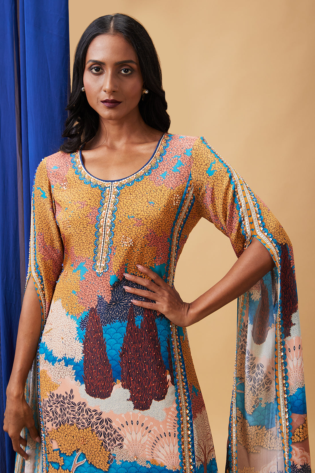 | Benazir Embroidered Kurta Set Crafted From The Finest Crepe Fabric, Both The Kurta And Palazzo Pants In This Set Offer A Luxurious Feel And A Flattering Drape That Ensures You Look And Feel Your Best. The Focal Point Of This Ensemble Is The Kurta, Adorned With A Scenic Print That Tells A Story Of Timeless Beauty. The Intricate Detailing And Picturesque Motifs On The Kurta Evoke A Sense Of Grace And Sophistication. The Long Slit Sleeves Add A Modern Twist To The Traditional Silhouette, Creating An Alluring And Distinctive Look. Whether You'Re Attending A Festive Occasion, A Family Gathering, Or Simply Want To Showcase Your Love For Exquisite Craftsmanship, This Ensemble Delivers On Every Front. |