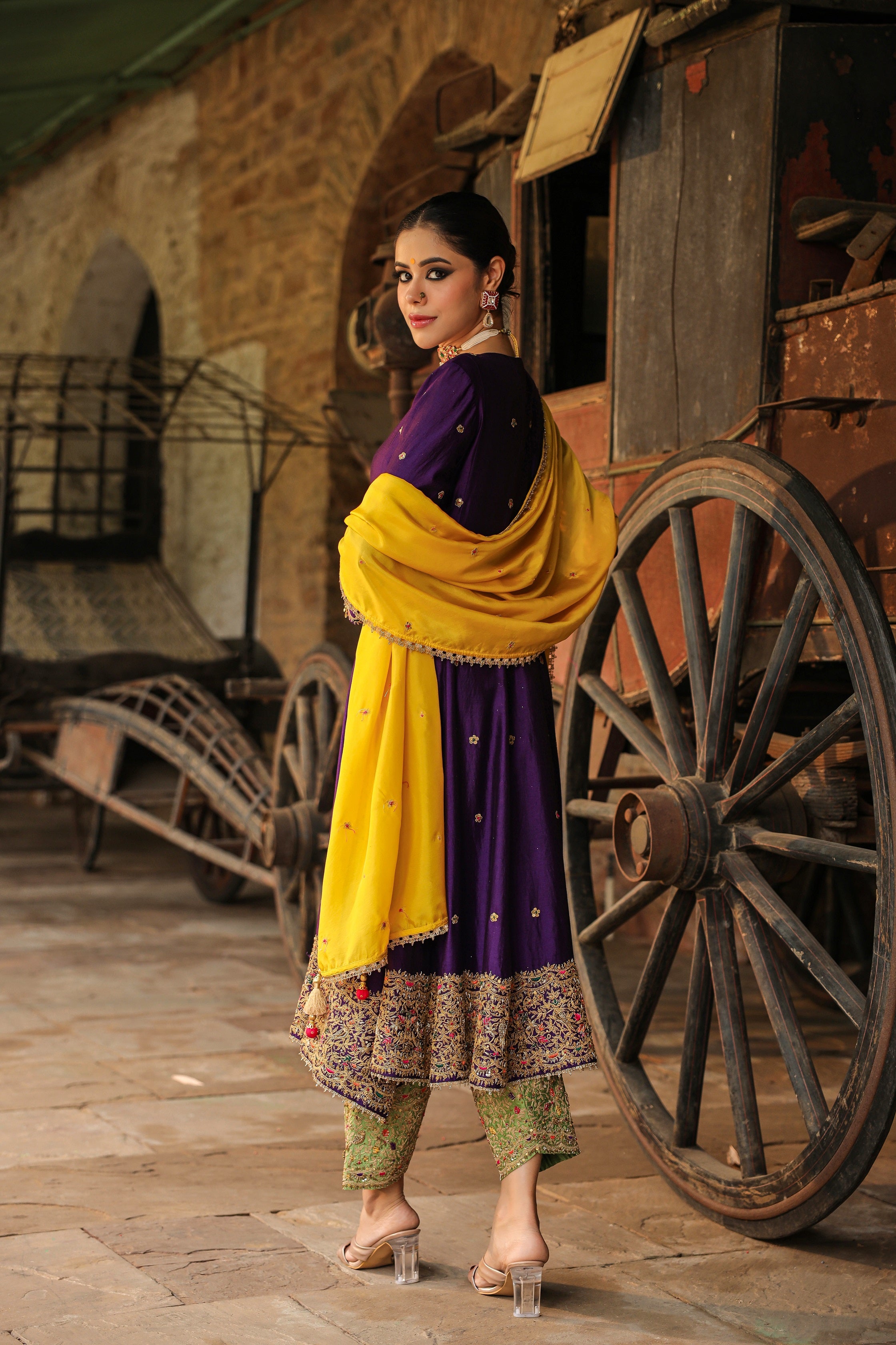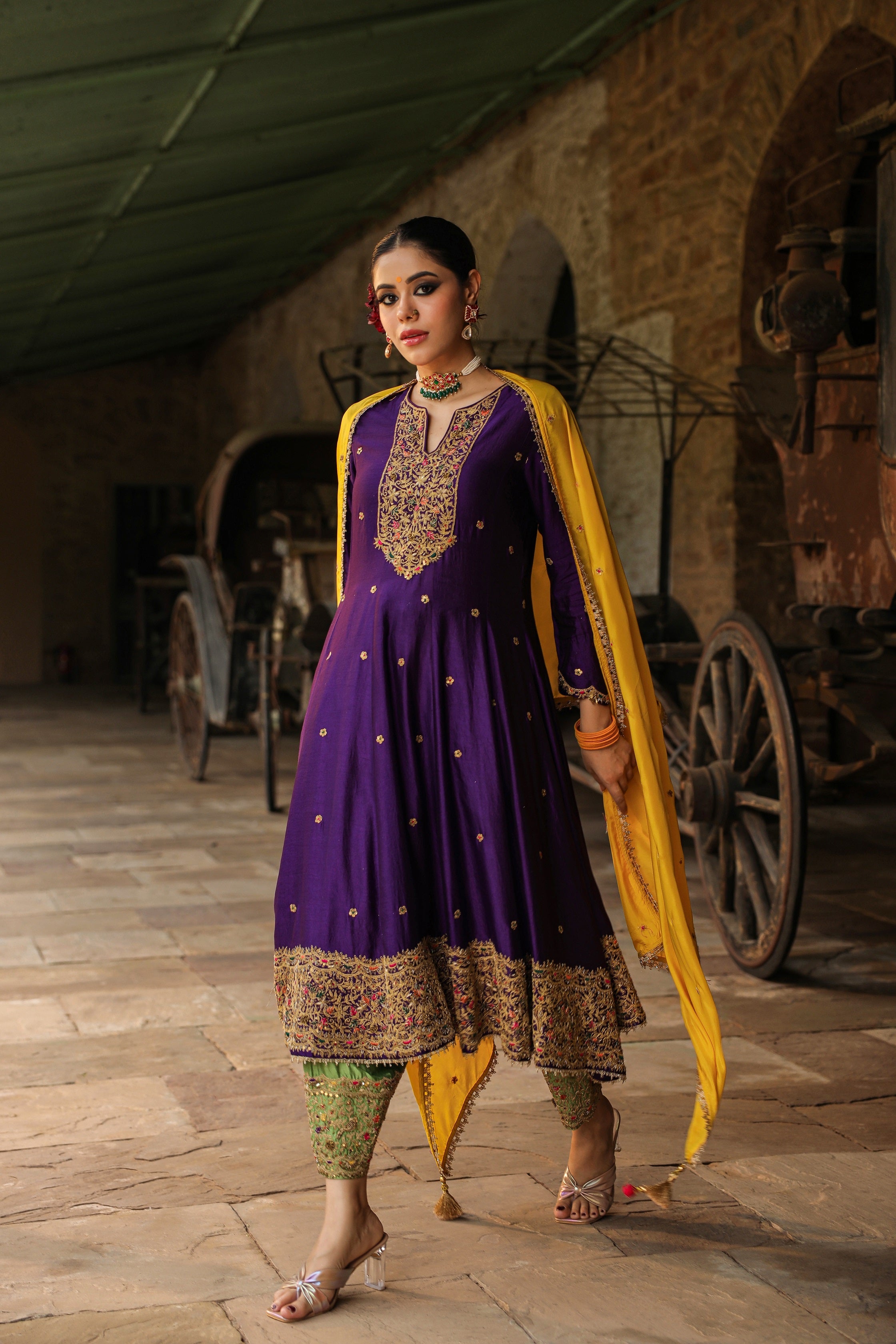 | This 3 pc Kalidaar kurta Set comes with a heavy zari dori embroidery on neck, border with colourful resham and tikki details. The salwar also comes heavily embroidered. The dupatta in a contrast colour is embellished with an embroidered border on two sides and sprinkle of buttis enhanced with lace and latkans . |