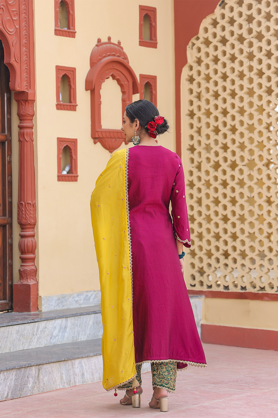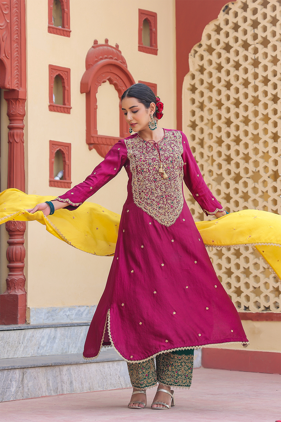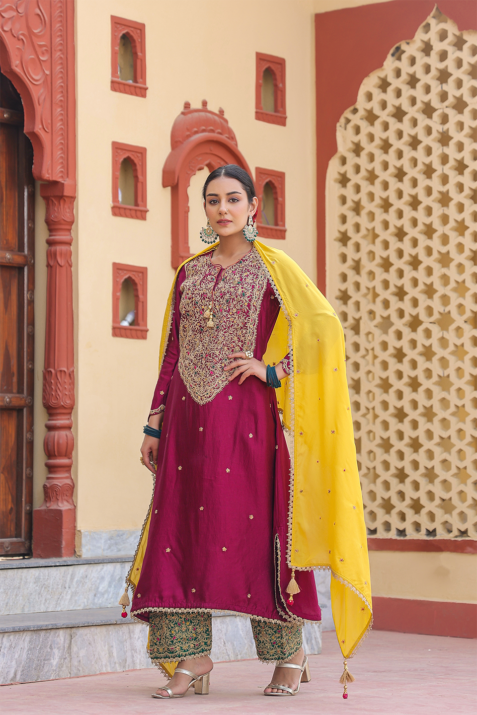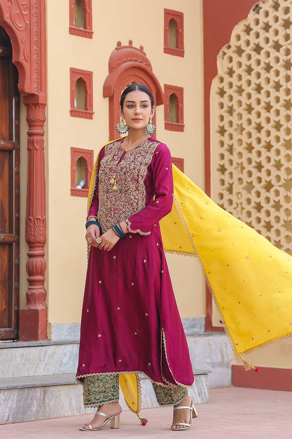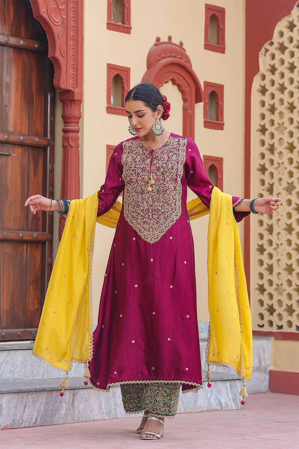 | This 2pc kurta Set comes with a heavily embroidered long neck with zari dori, colourful resham and tikkis. Paired with heavily embroidered contrast salwaar |