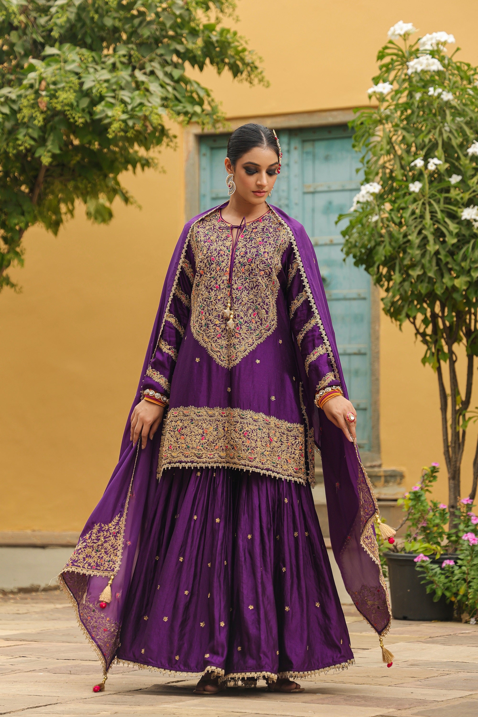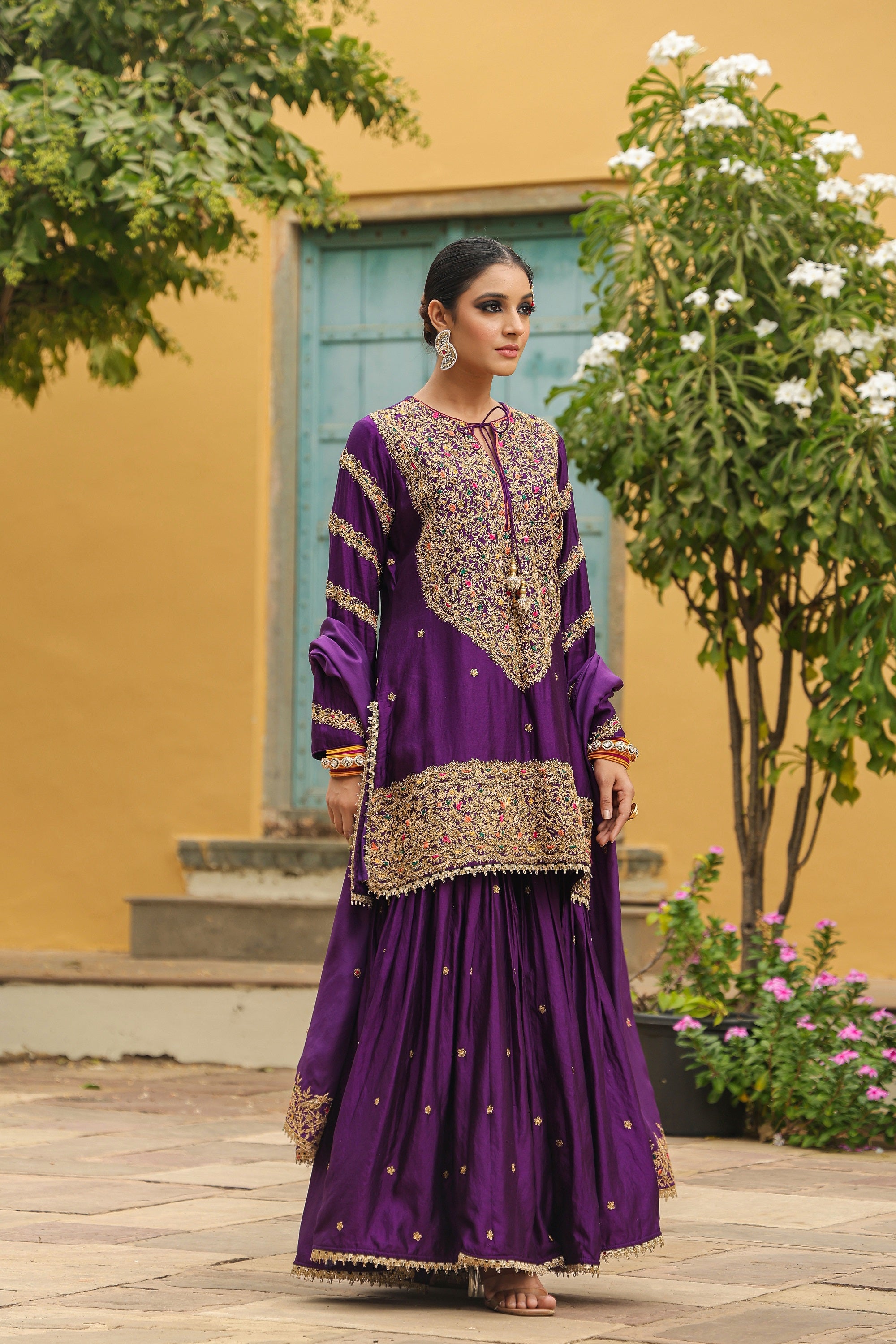 | This 3pc Heavily embroidered Sharara set comes with zari dori, colourful resham thread work, tikkis and an interesting spiral design on the sleeve Buttis on the Sharara enhanced with lace and latkans paired with a beautiful soft silk dupatta |