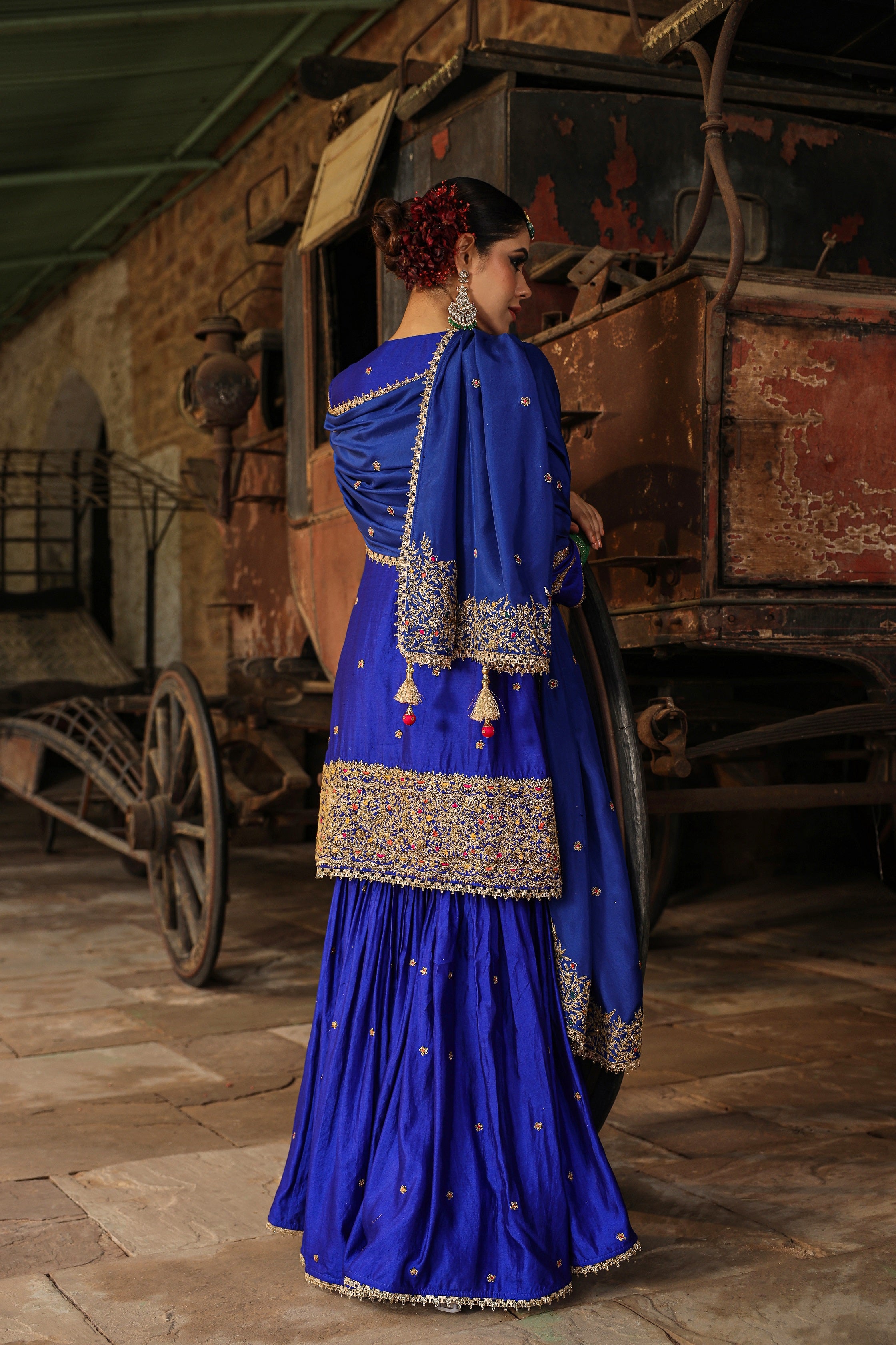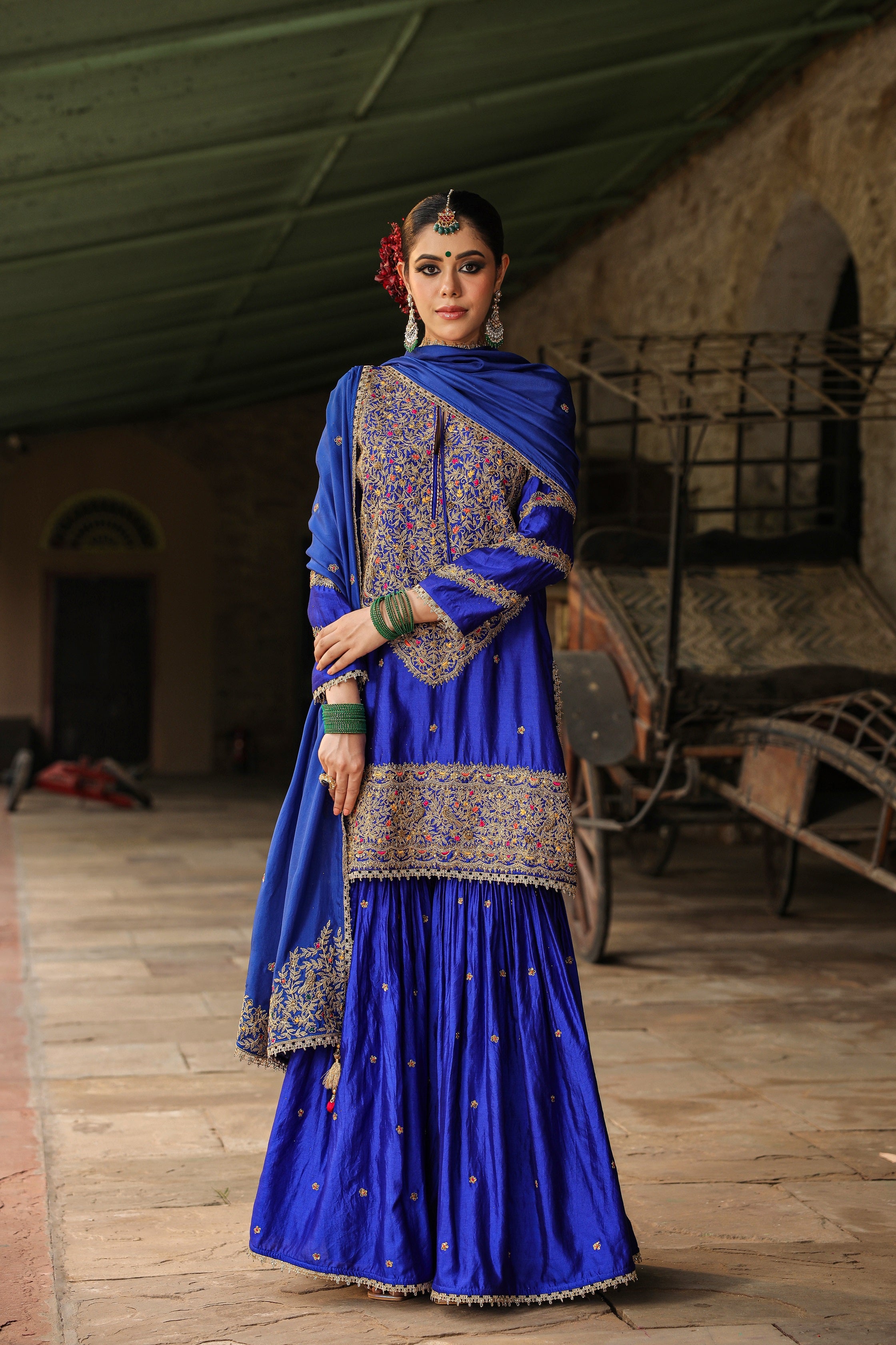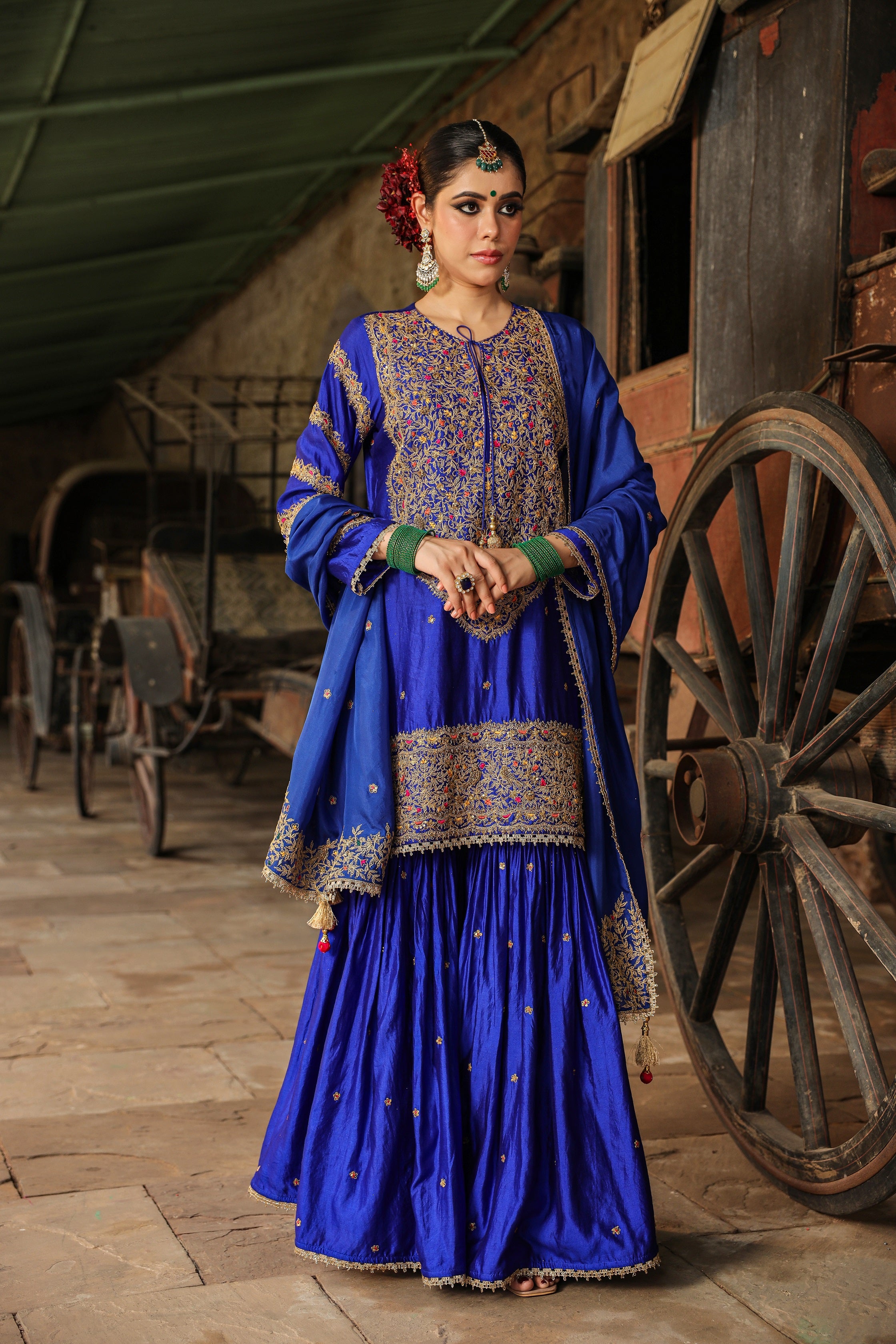 | This 3pc Heavily embroidered Sharara set comes with zari dori, colourful resham thread work, tikkis and an interesting spiral design on the sleeve Buttis on the Sharara enhanced with lace and latkans paired with a beautiful soft silk dupatta |