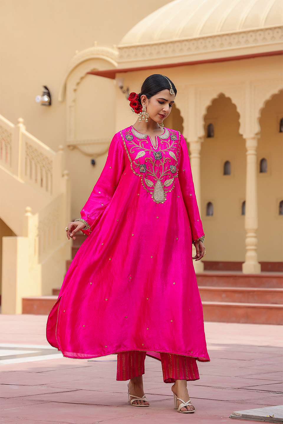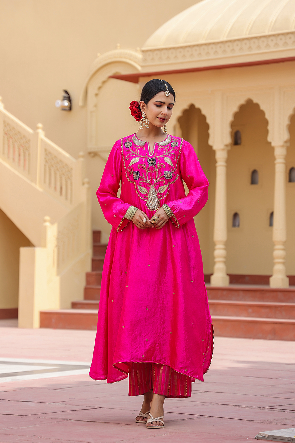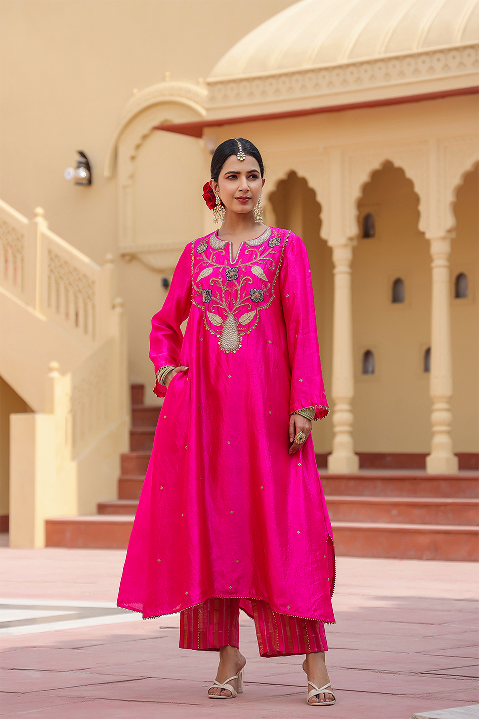 | This 2 pc Kurta set comes with applique motifs, enhanced with pearls and colorful resham work on the long neck yoke of the kurta. The sleeves are delicately embellished with tikki and pearl hangings. Its paired with a palazzo with golden weave texture. |