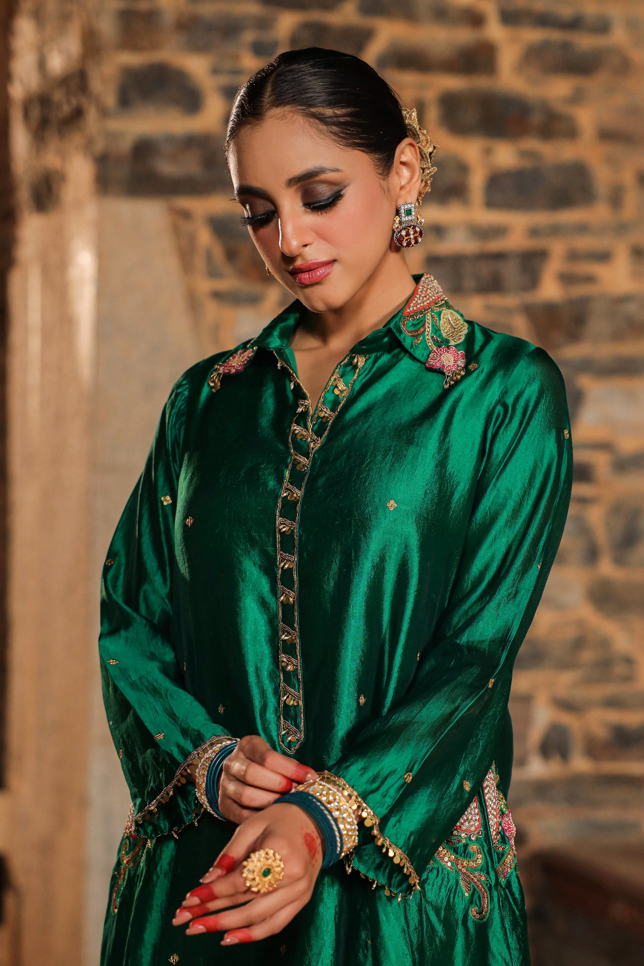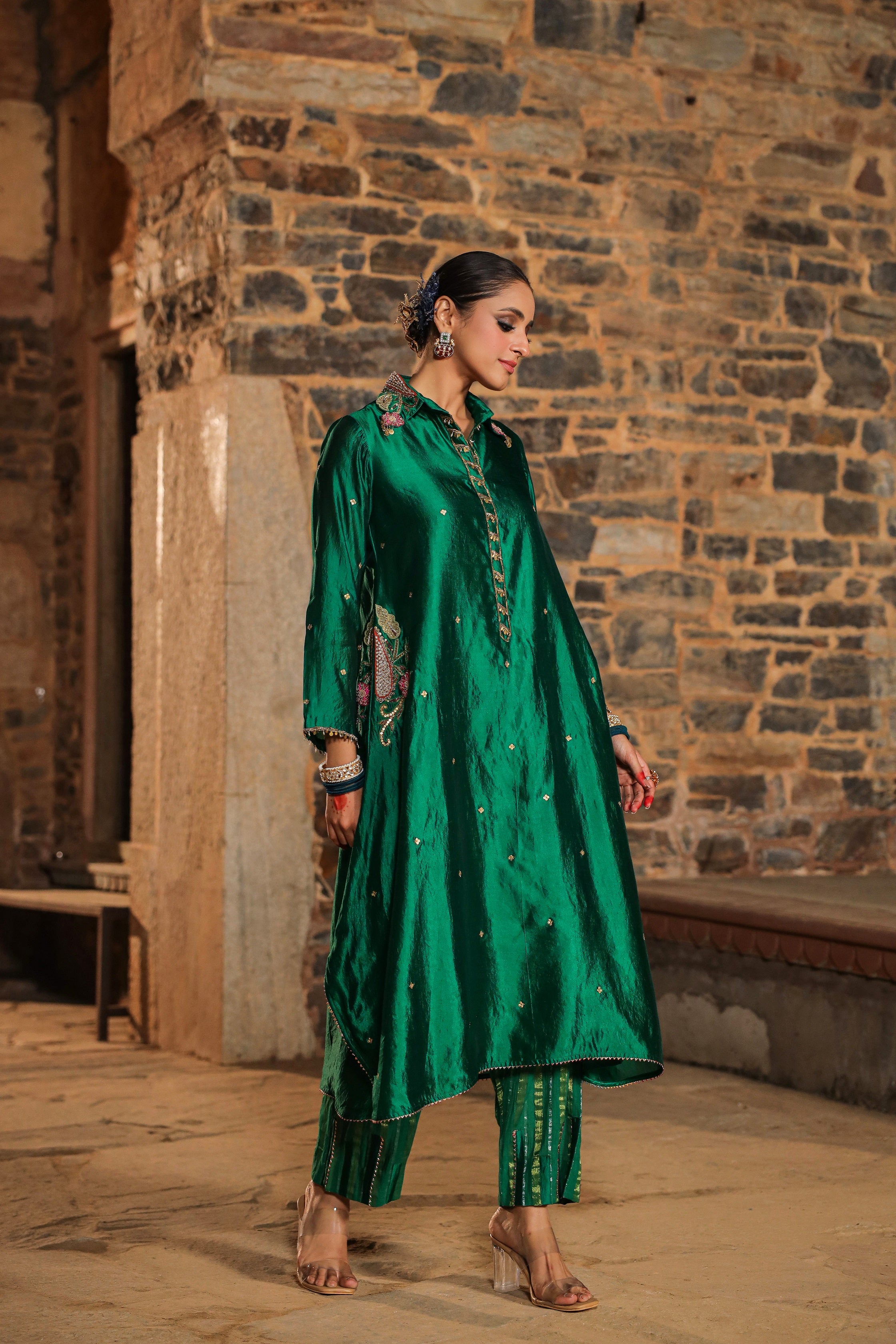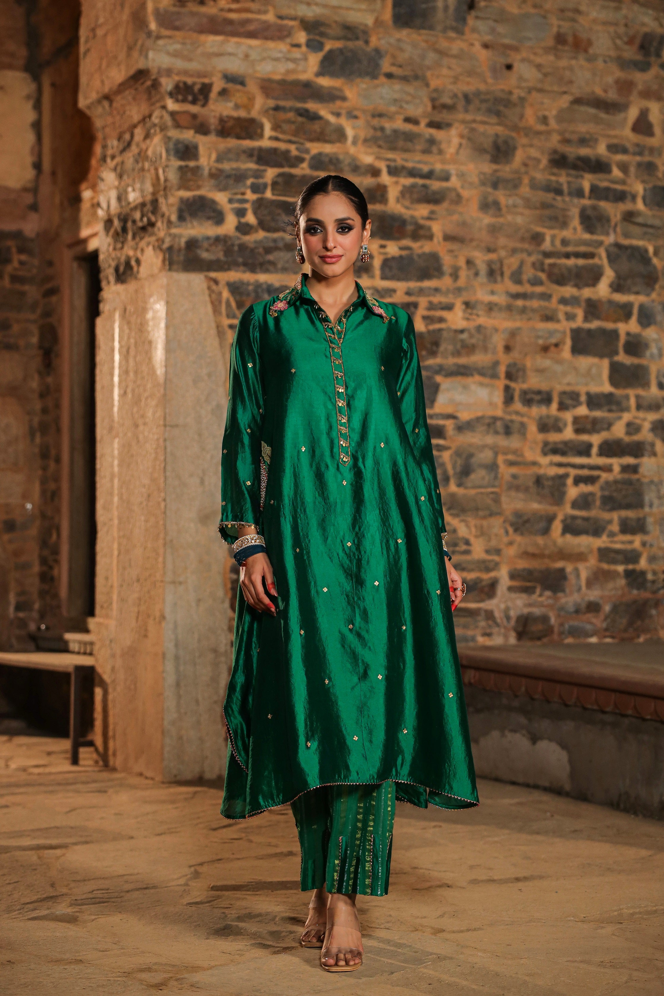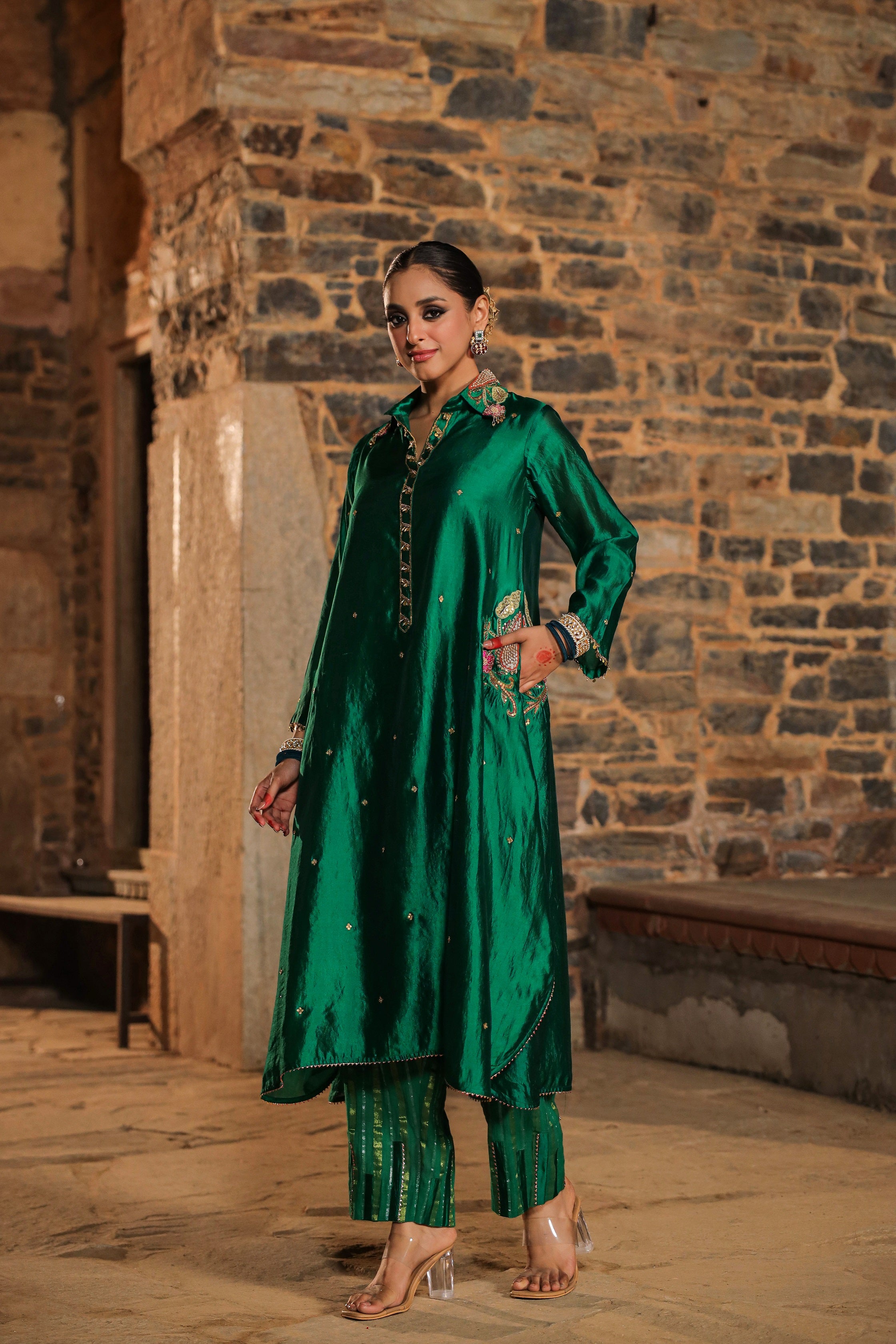 "This 2pc Kurta Set comes with Applique motifs enhanced with pearls and colourful resham on the collar and pockets, with an embroidered button patti