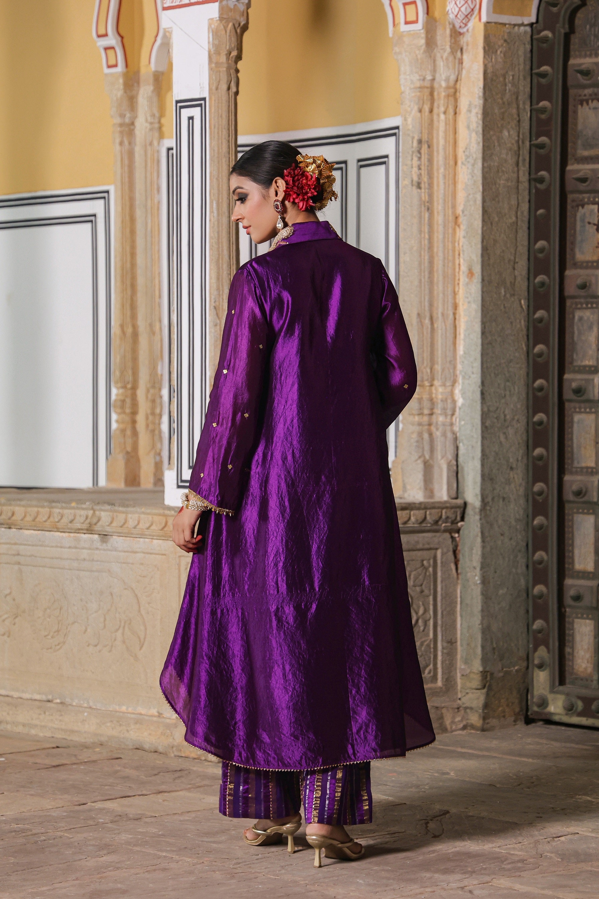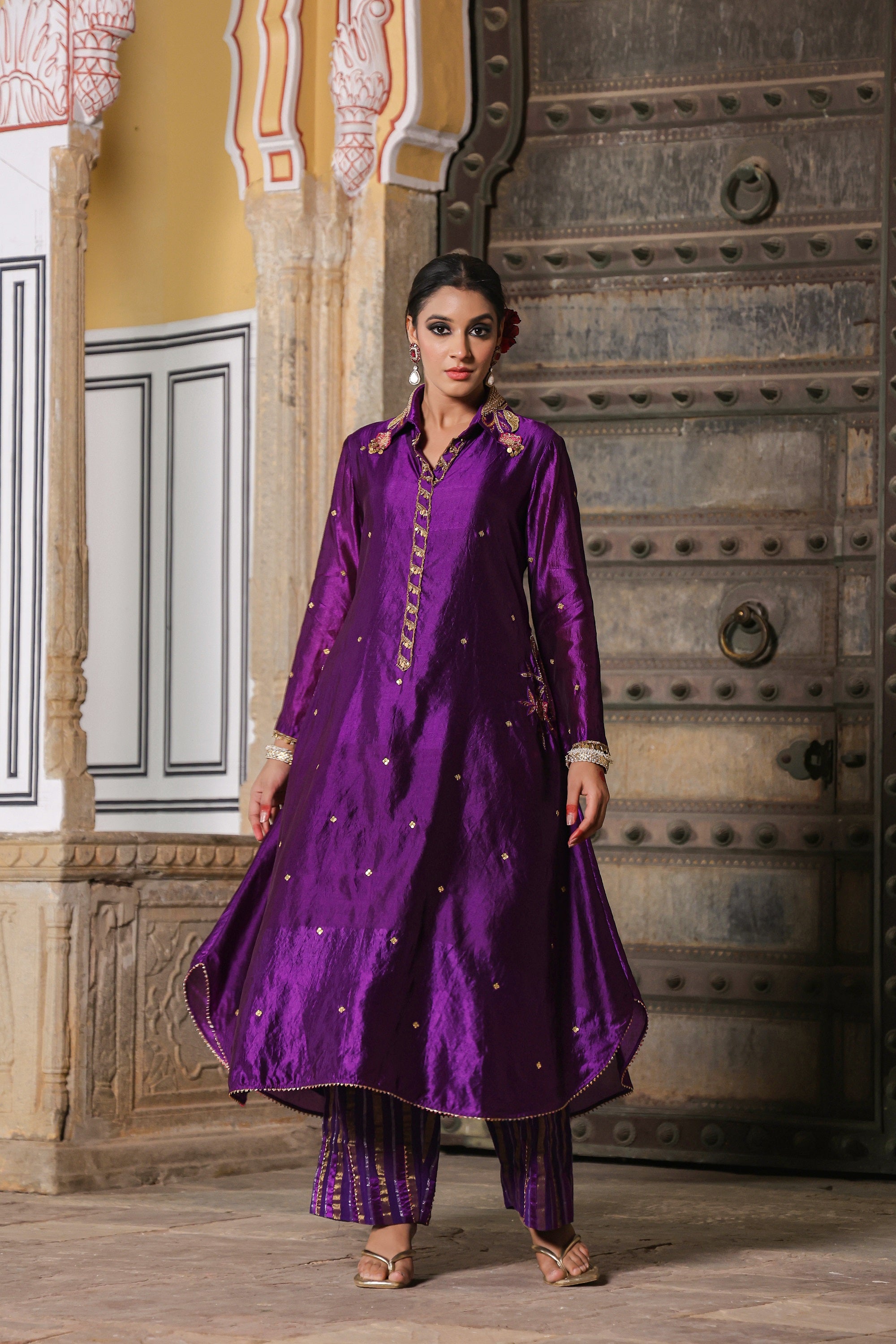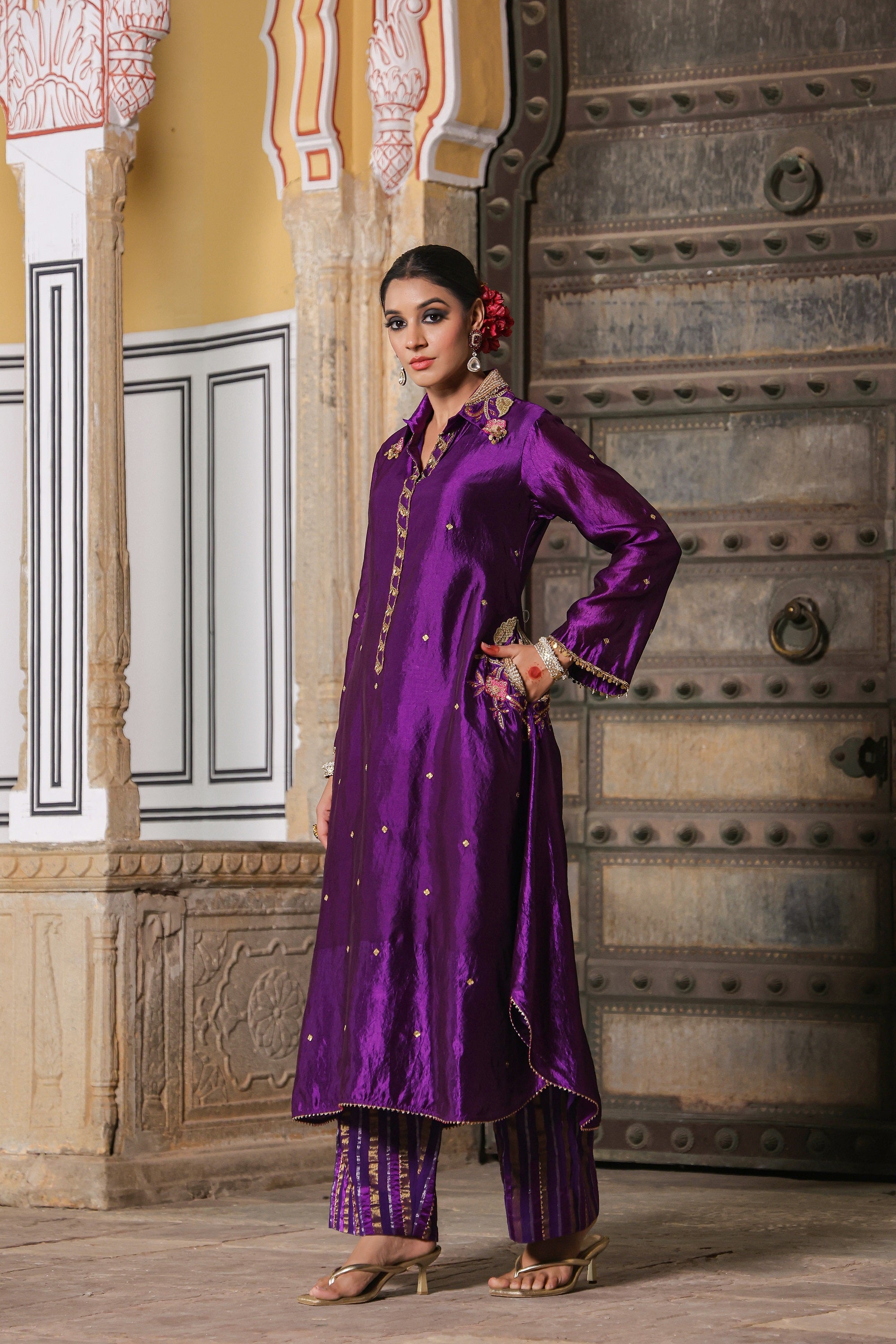 | This 2pc Kurta Set comes with Applique motifs enhanced with pearls and colourful resham on the collar and pockets, with an embroidered button patti Its paired with a palazzo with golden weave texture. |