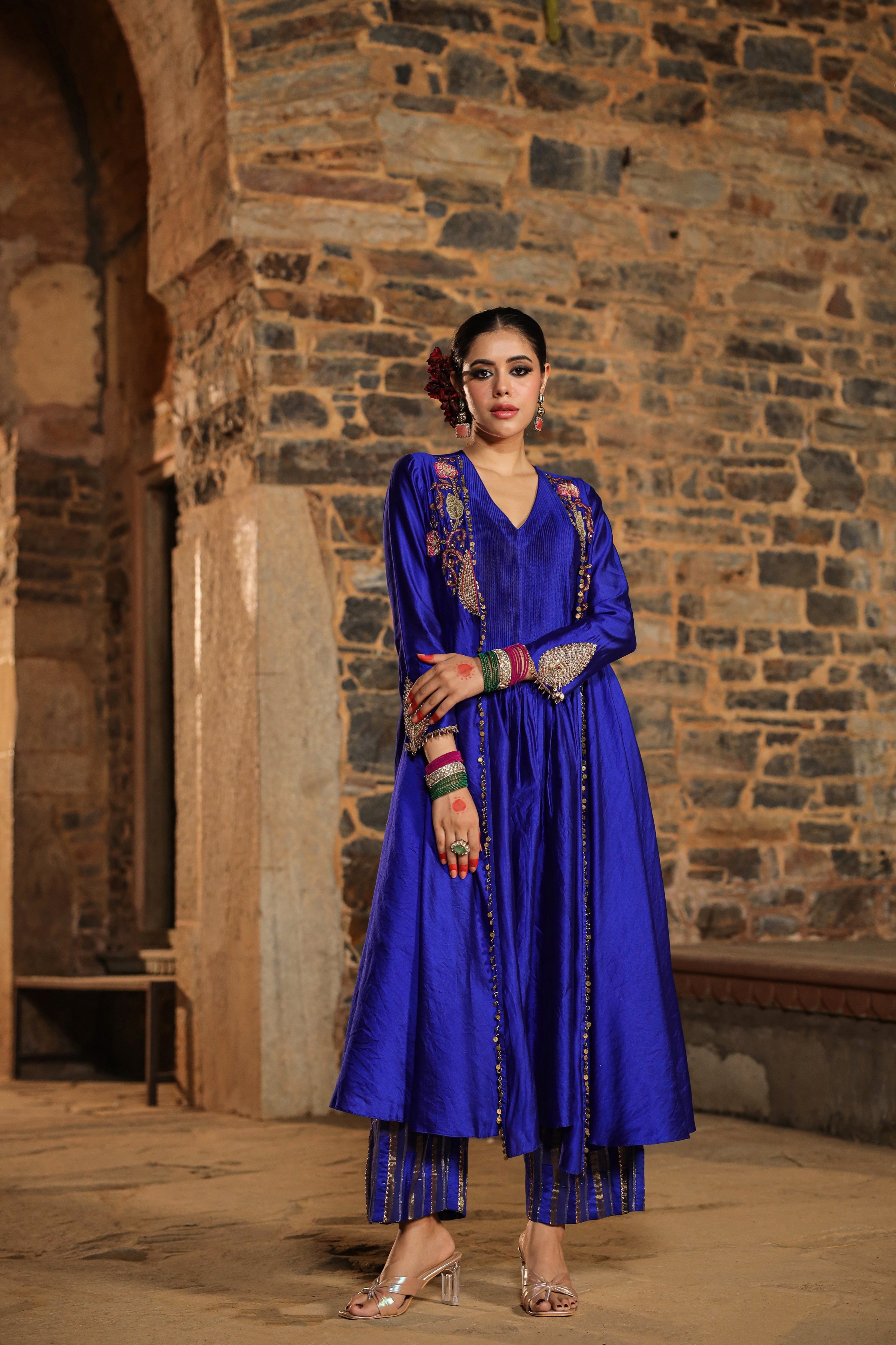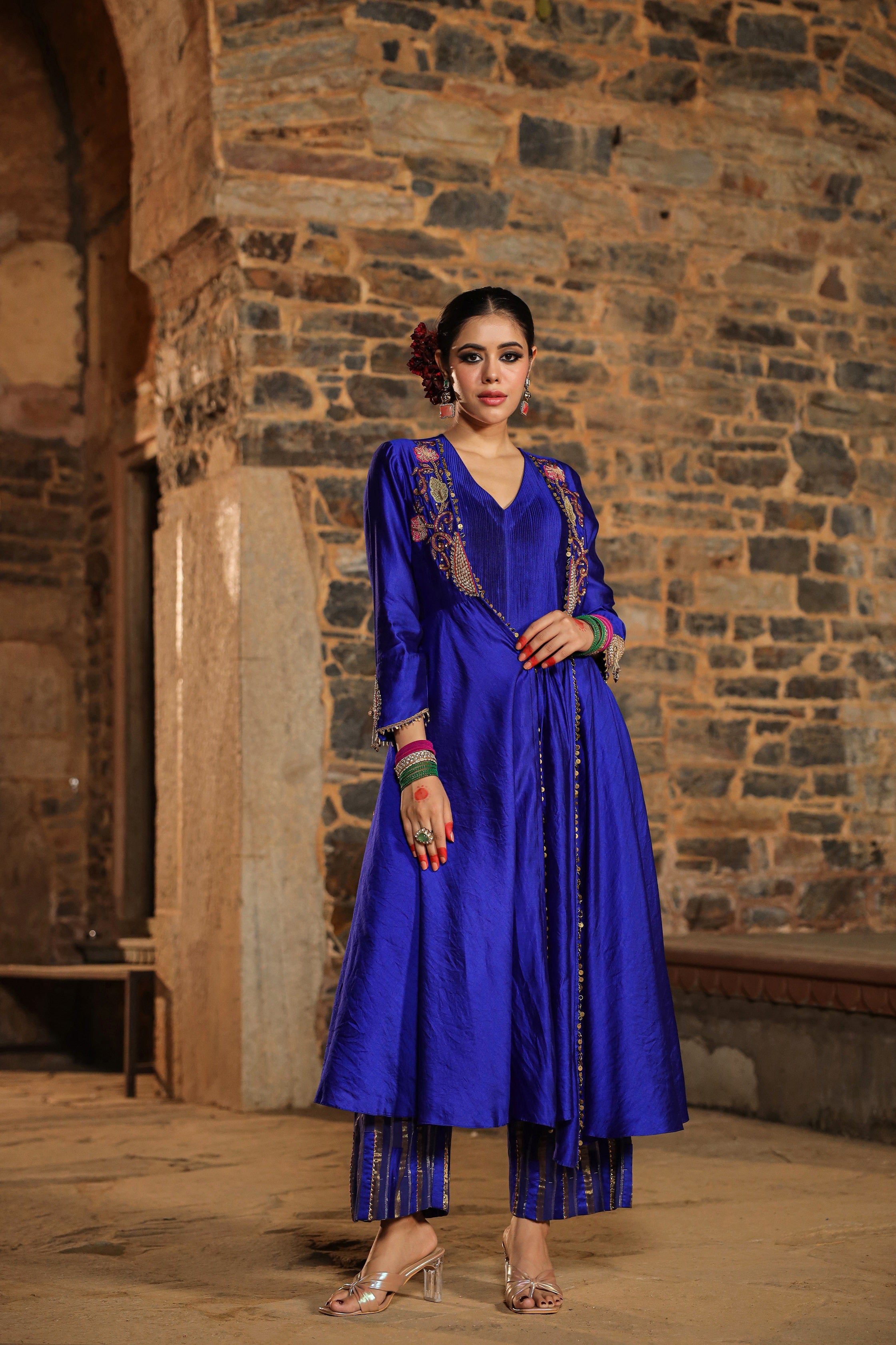 | This 2 pc Kurta Set comes with Applique motifs, enhanced with pearls and colourful resham on the lapel of the jacket, and very fine pintuck details on the inner Its paired with a palazzo with golden weave texture. |