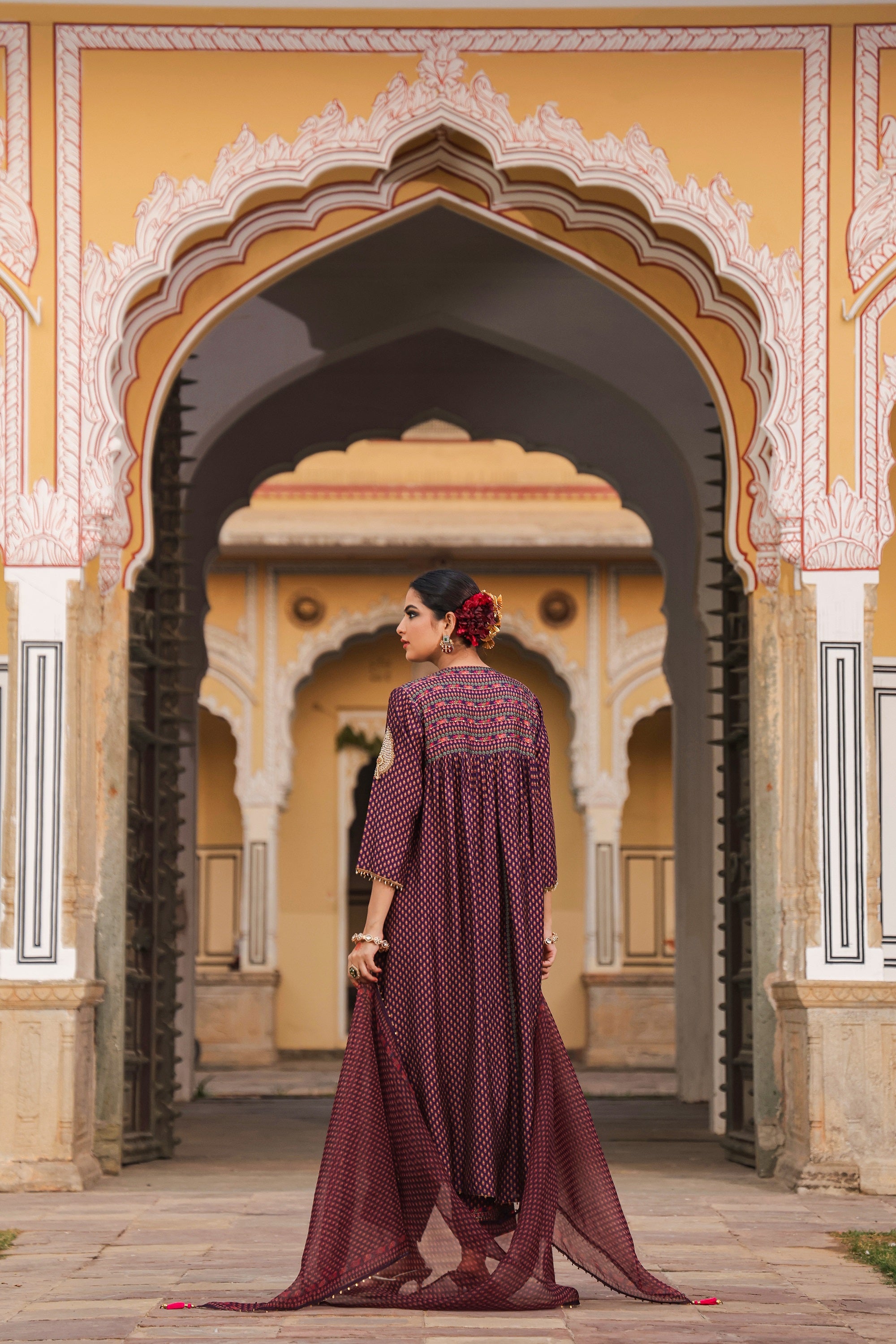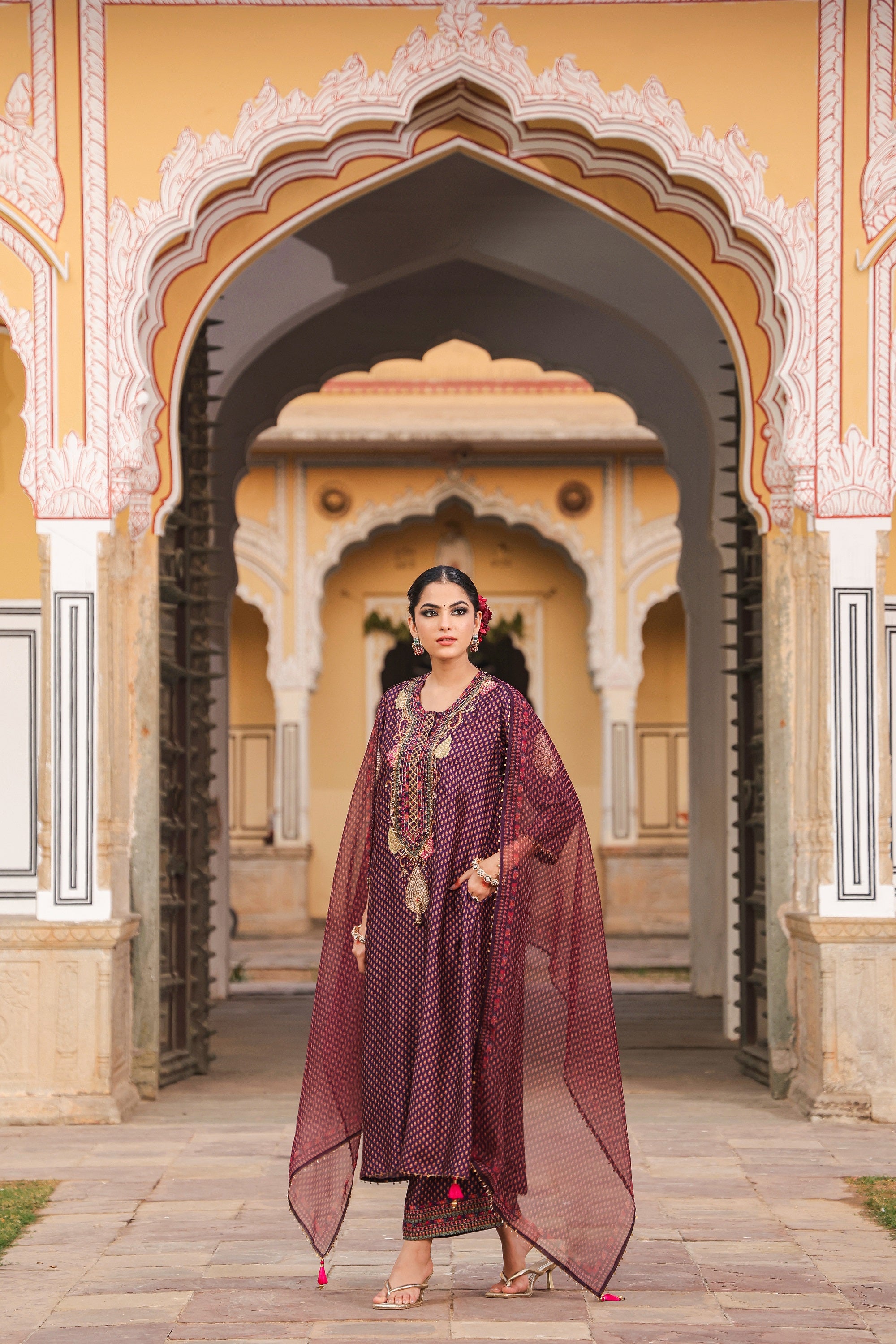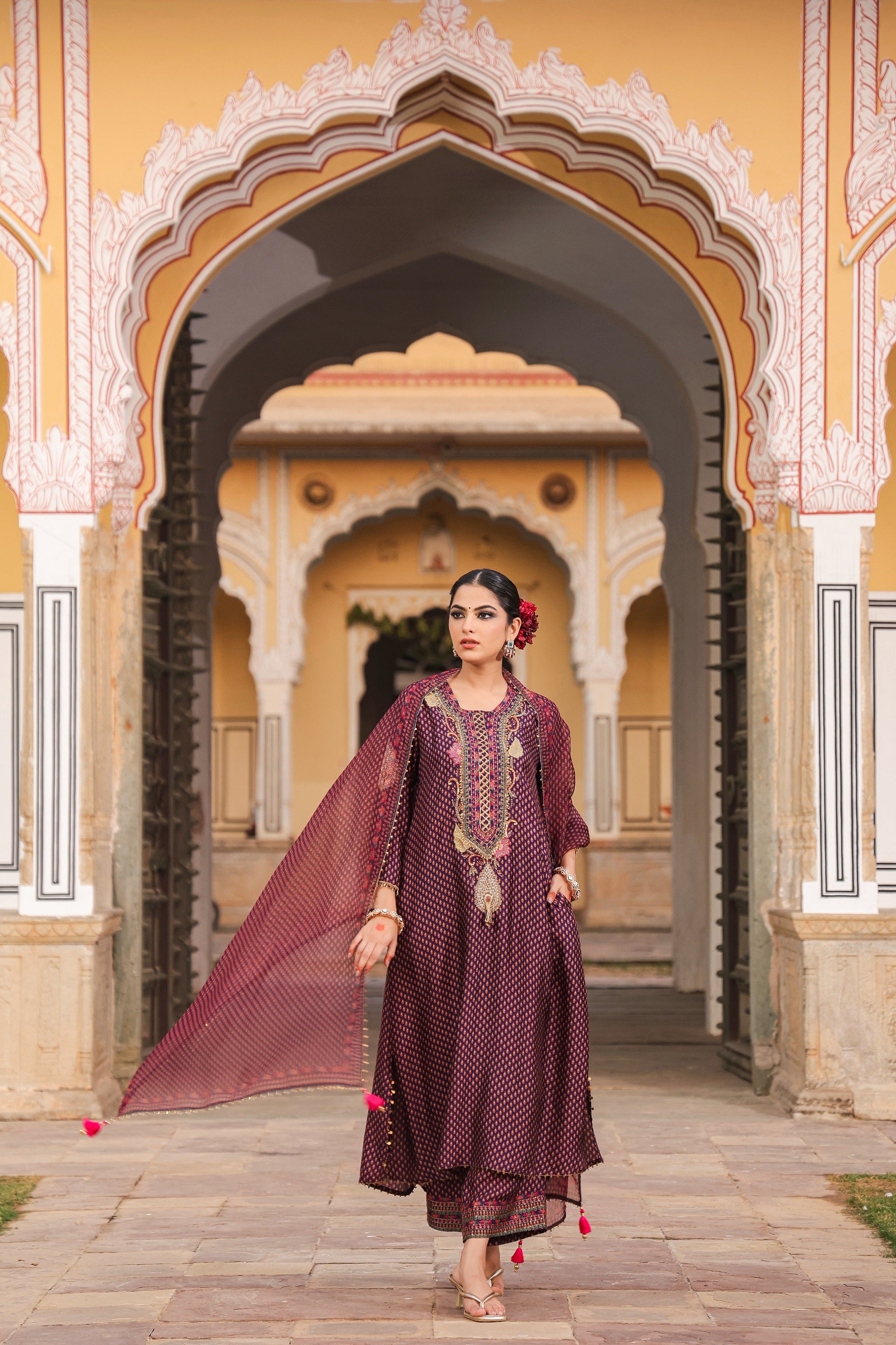 | This 3Pc Kurta Set comes with Applique motifs, enhanced with pearls and resham thread work on the neck line Sleeve is adorned with a pearl badaam butta Its paired with Palazzo and an Organza dupatta with delicate pearl and tikki detailing |