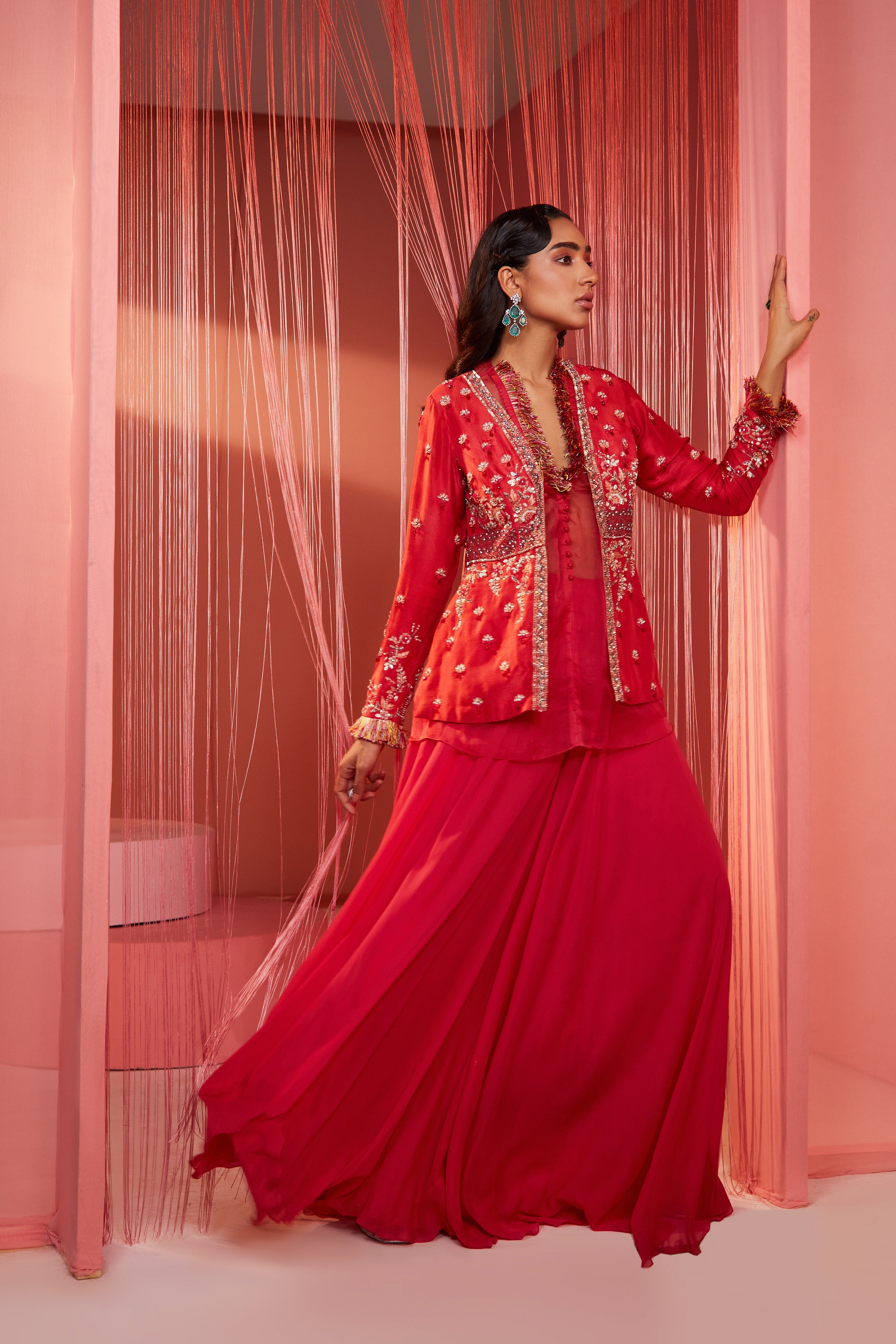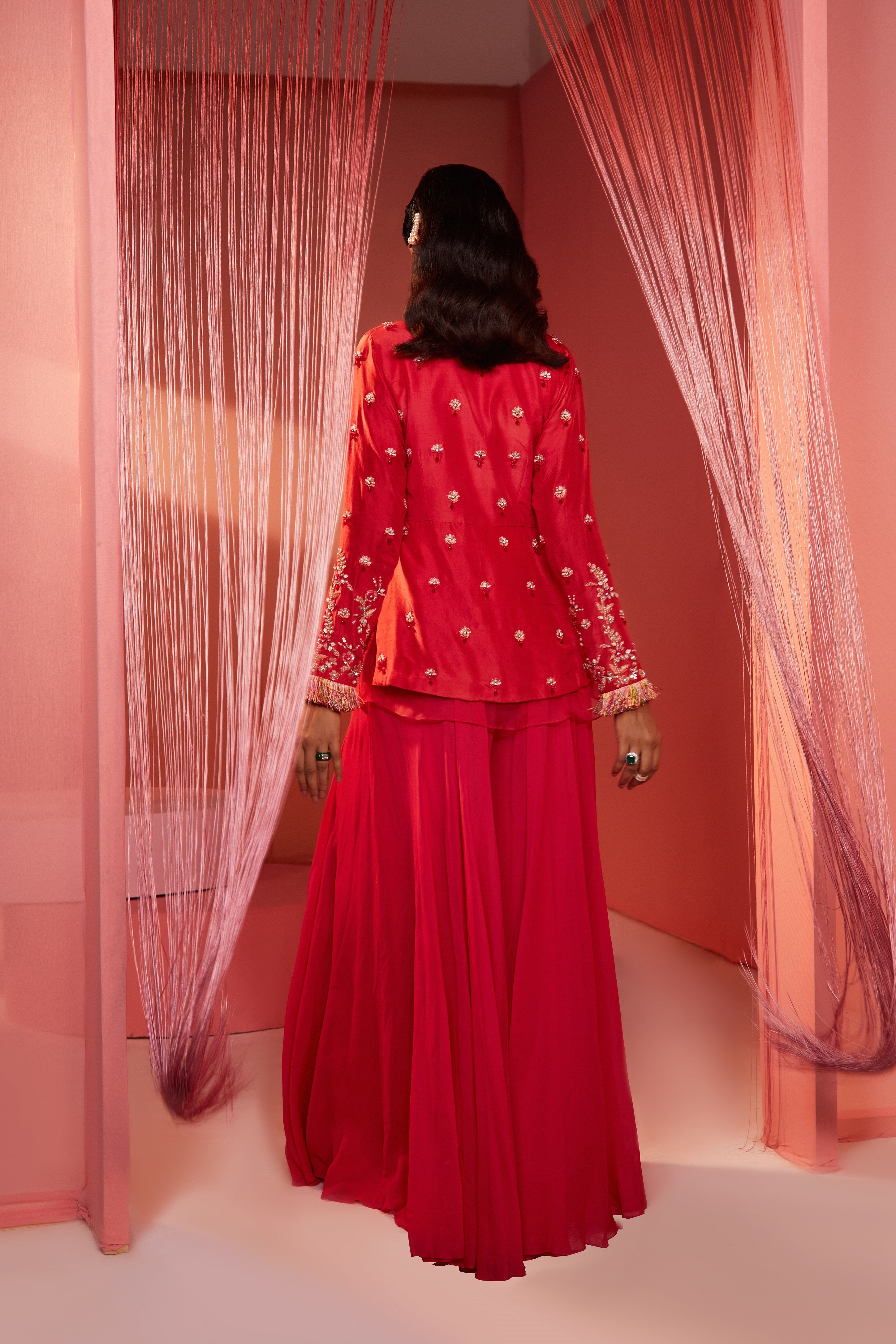 Coral Red Silk hand embroidered peplum with a sheer organza inner.The peplum is embroidered with french knots, sequins and cut-daana.
