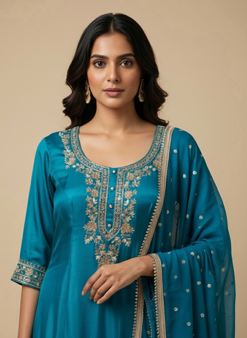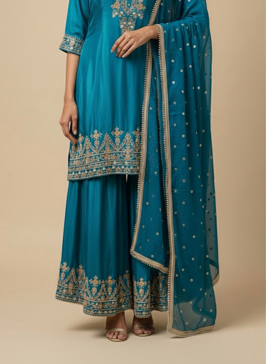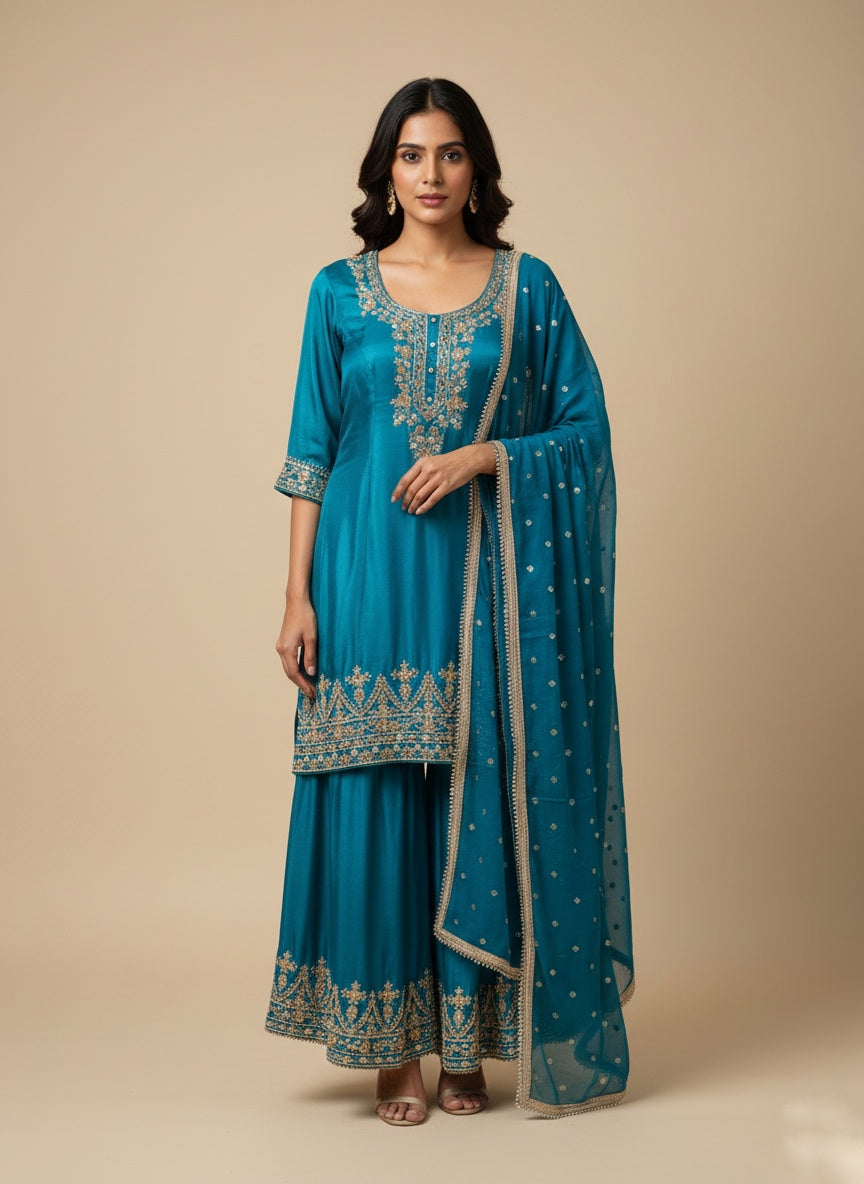 This Elegant Crepe Fabric Sharara Set Offers A Soft, Fluid Drape With A Refined, Modern Look. The Kurti Features Delicate Embroidery That Enhances Its Graceful Appeal, Paired With A Flowy Crepe Sharara For Comfortable Yet Stylish Movement. Complete With A Coordinated Dupatta, This Set Is Perfect For Festive Events, Family Functions, And Special Occasions.