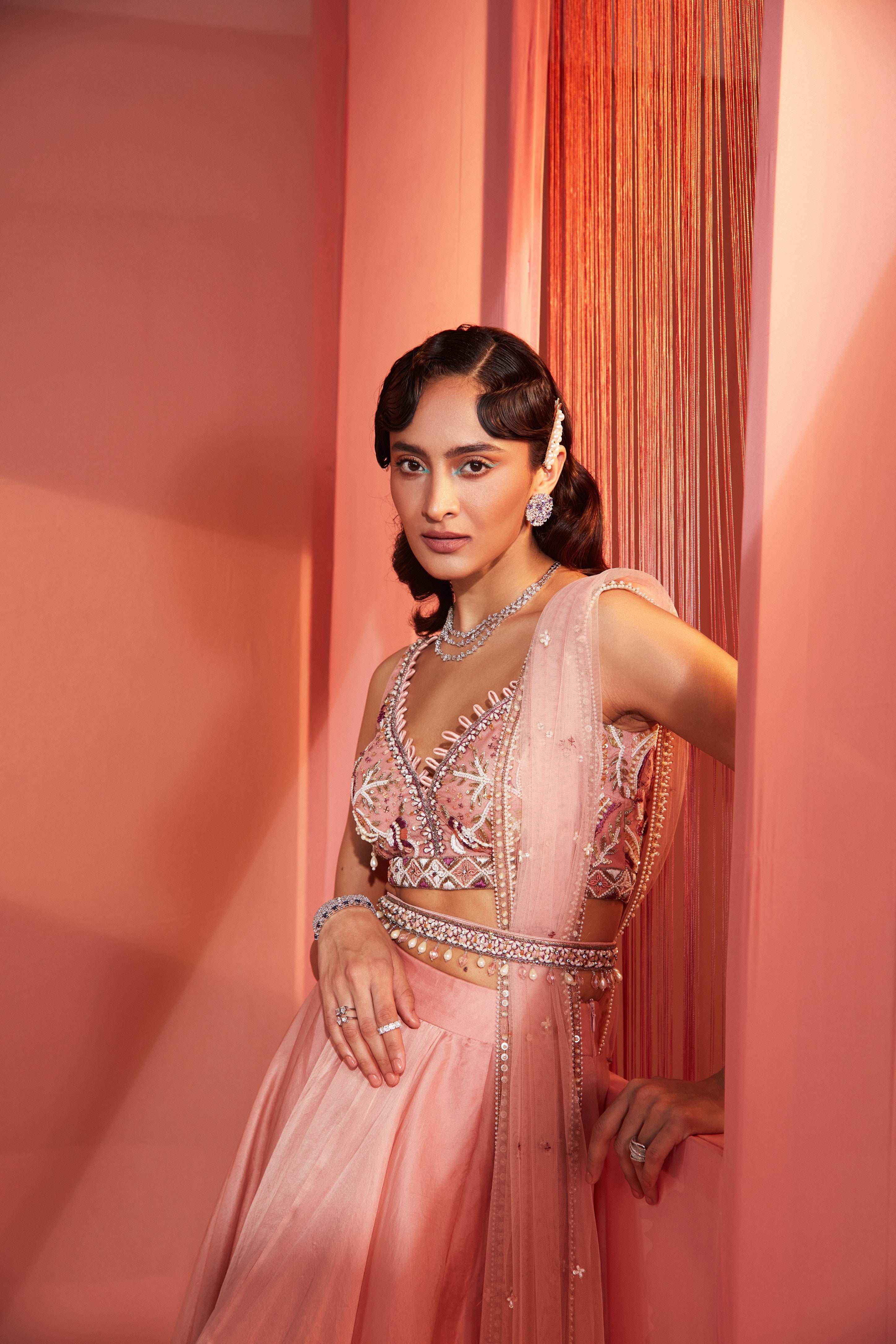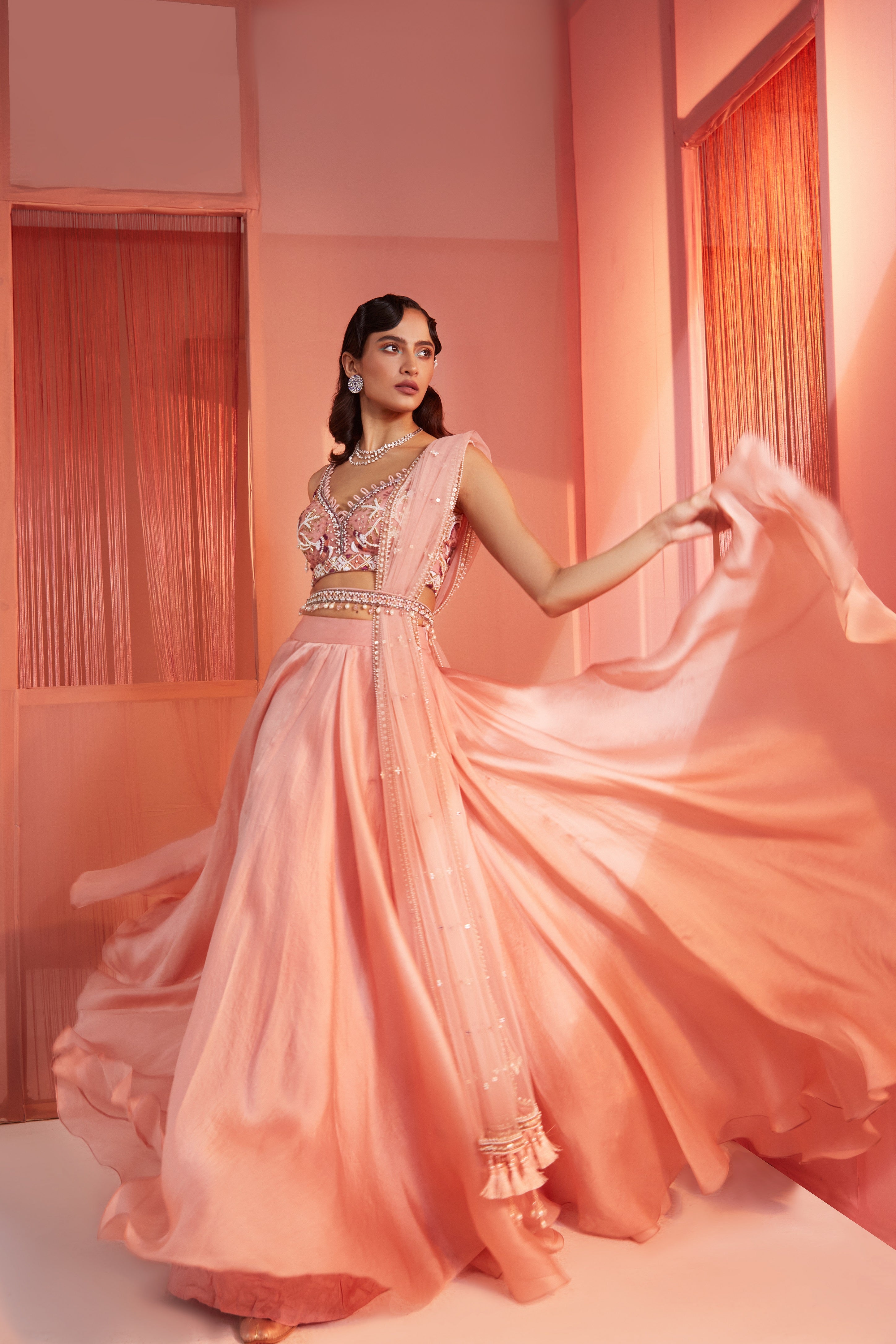 Dusty pink blouse and organza lehenga set