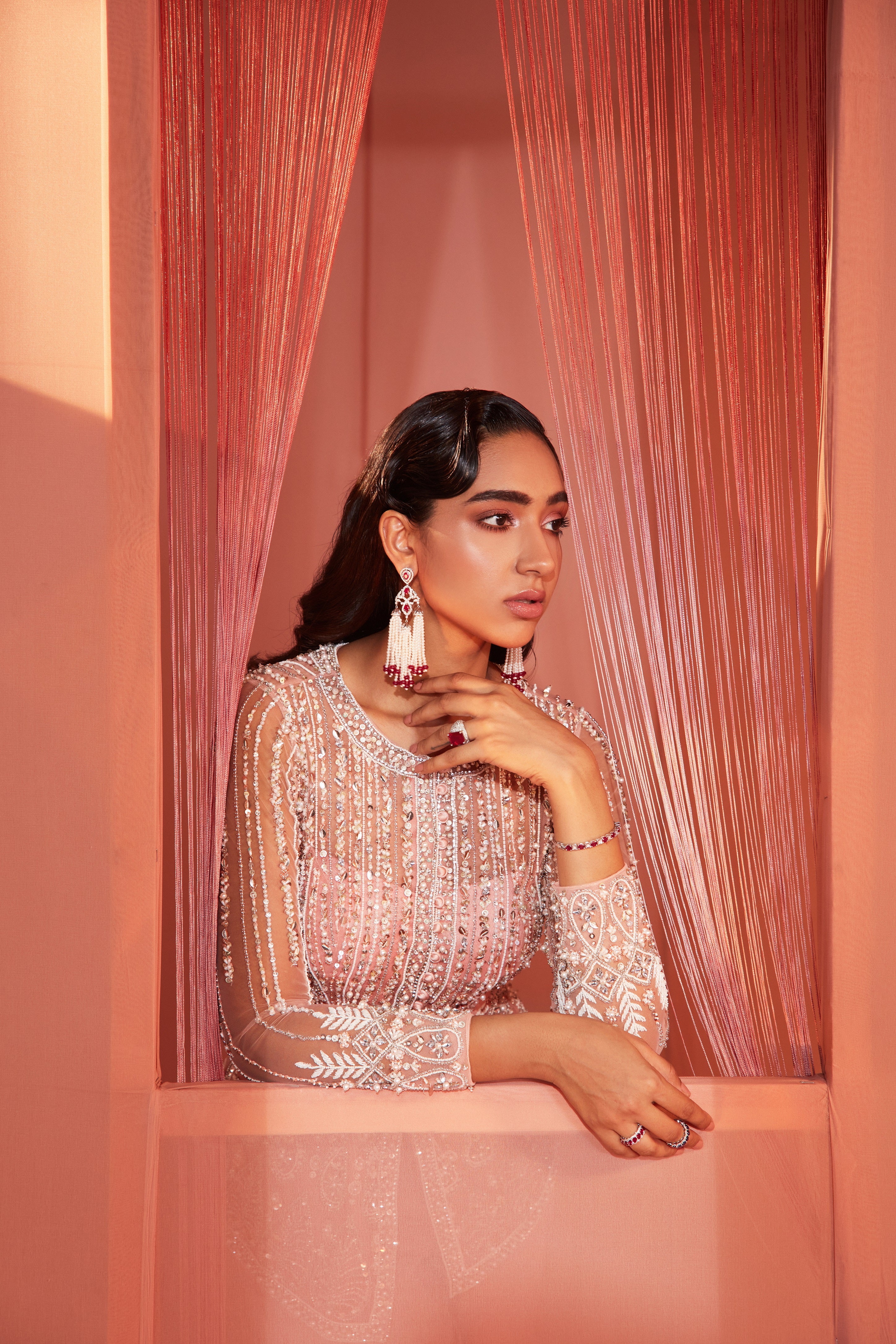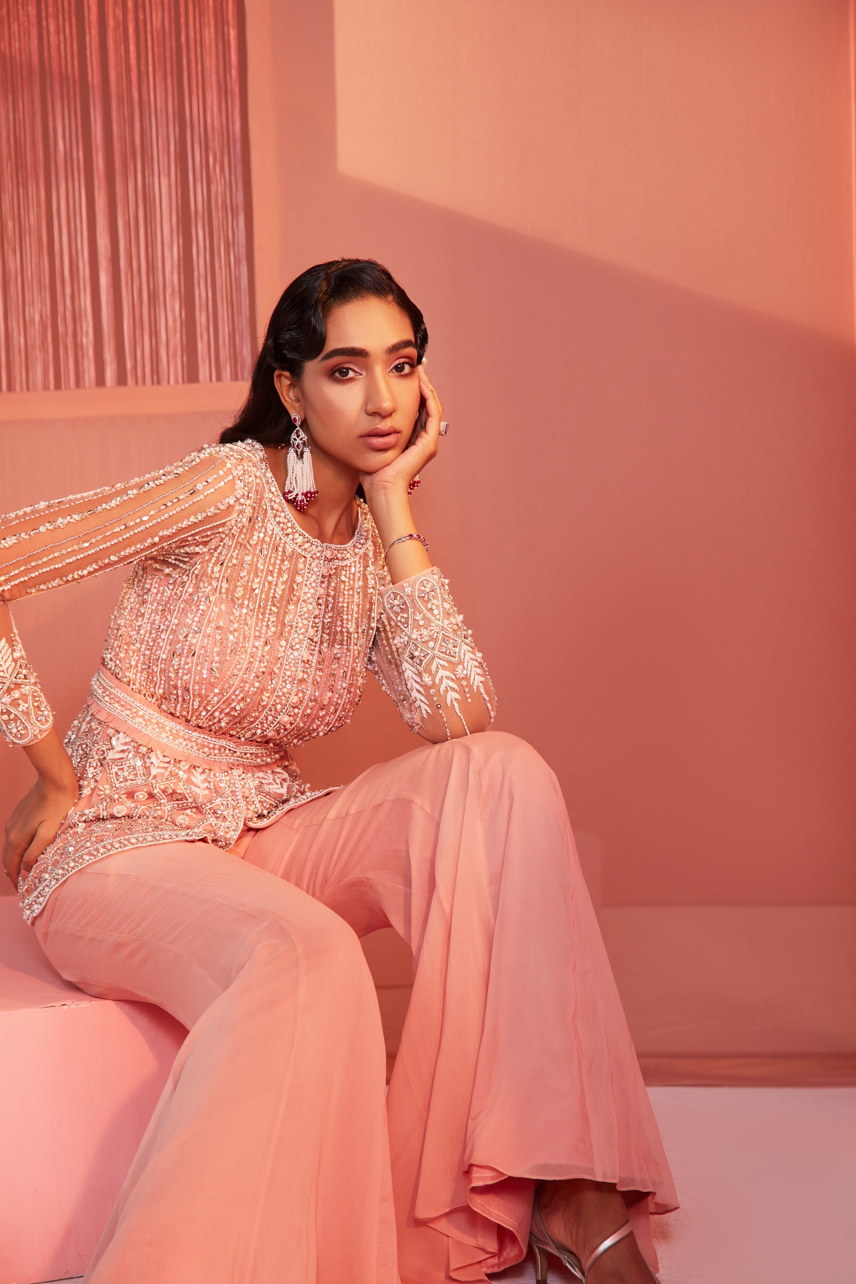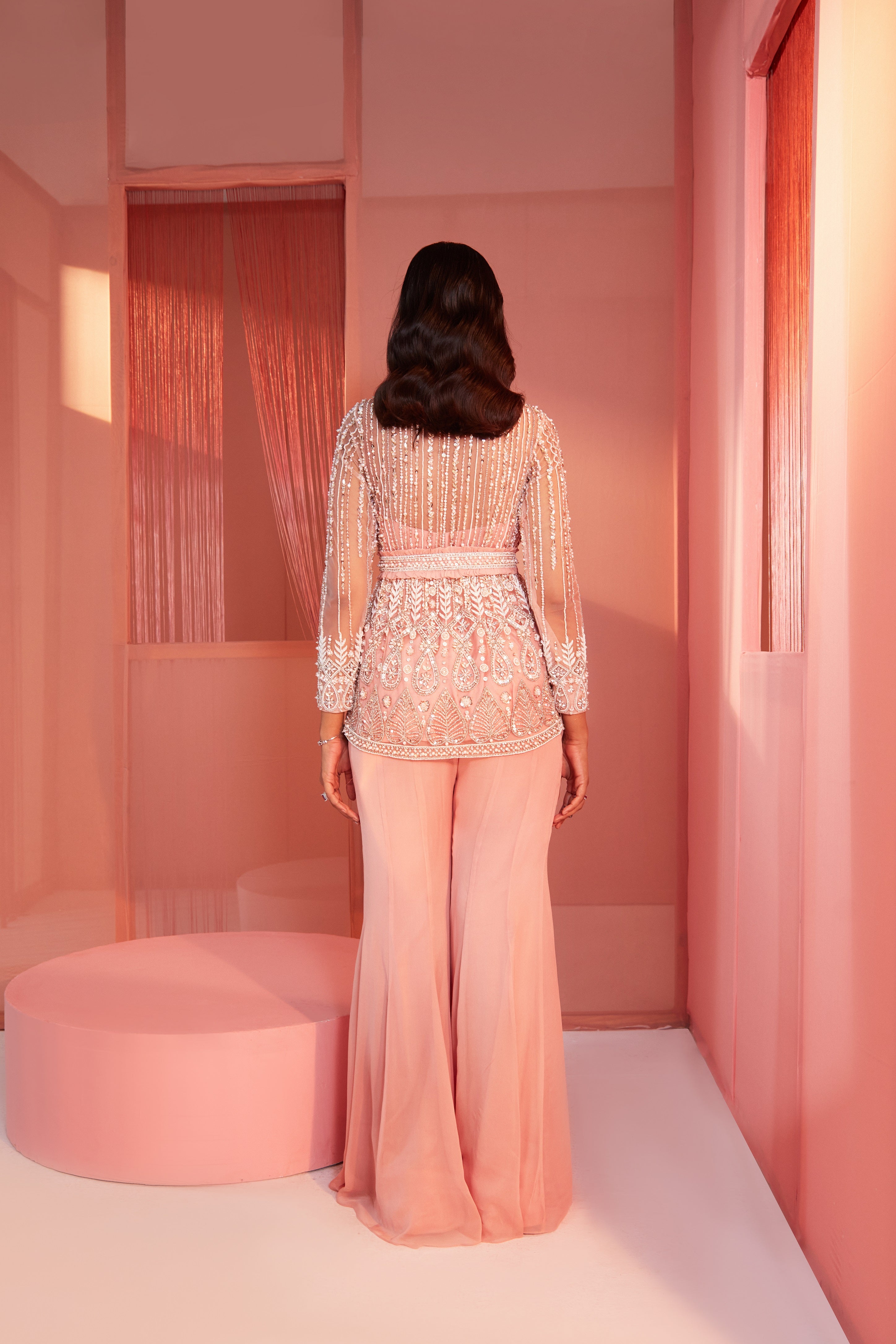 Dusty pink hand embroidered peplum top with potli button detailing. It features a beautiful geometric pattern embroidery using different shaped sequins, stones, pearls and cut-daana. It is paired with georgette bell bottom flared pants and a hand embroidered belt with ruffle details.