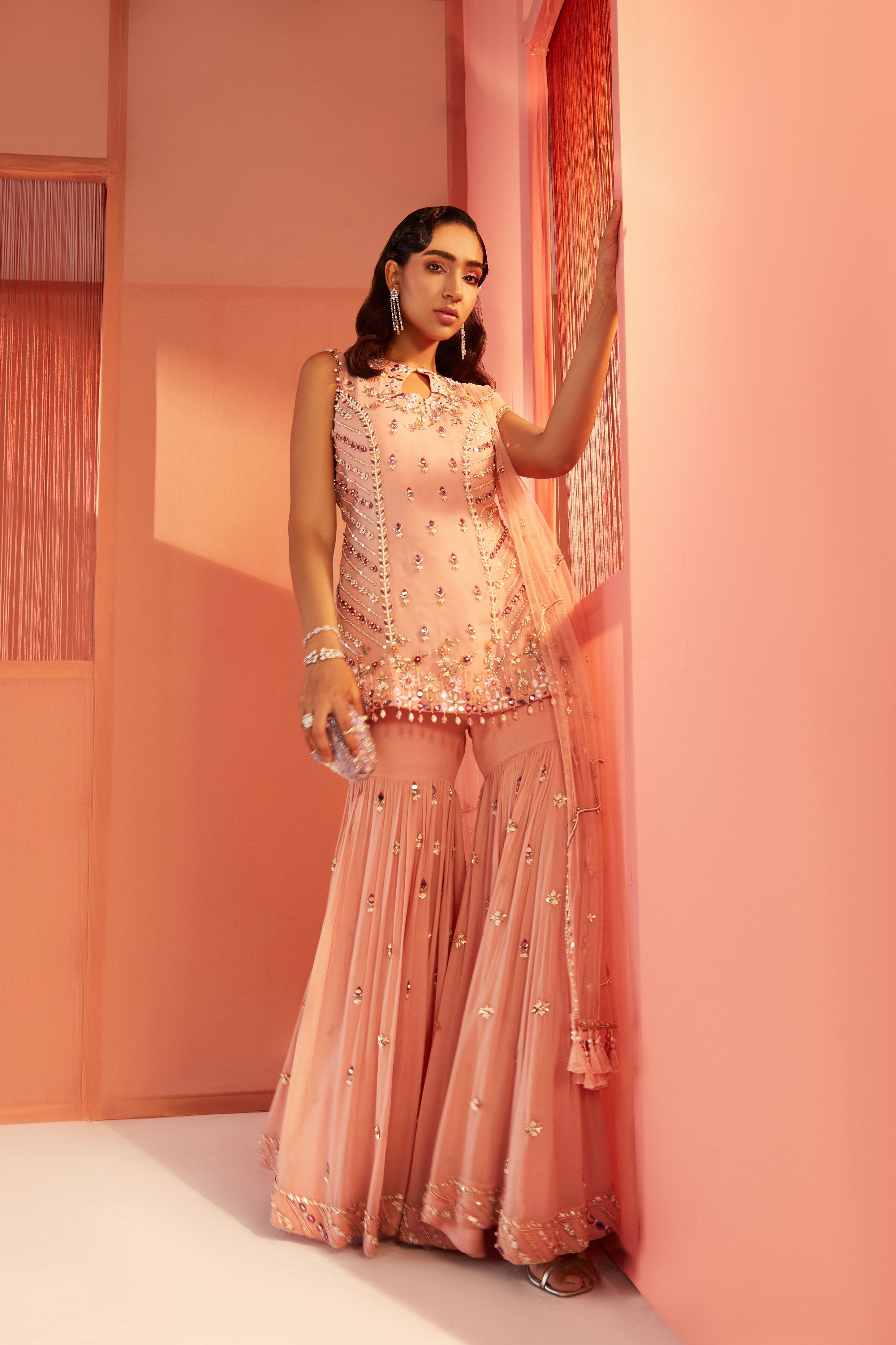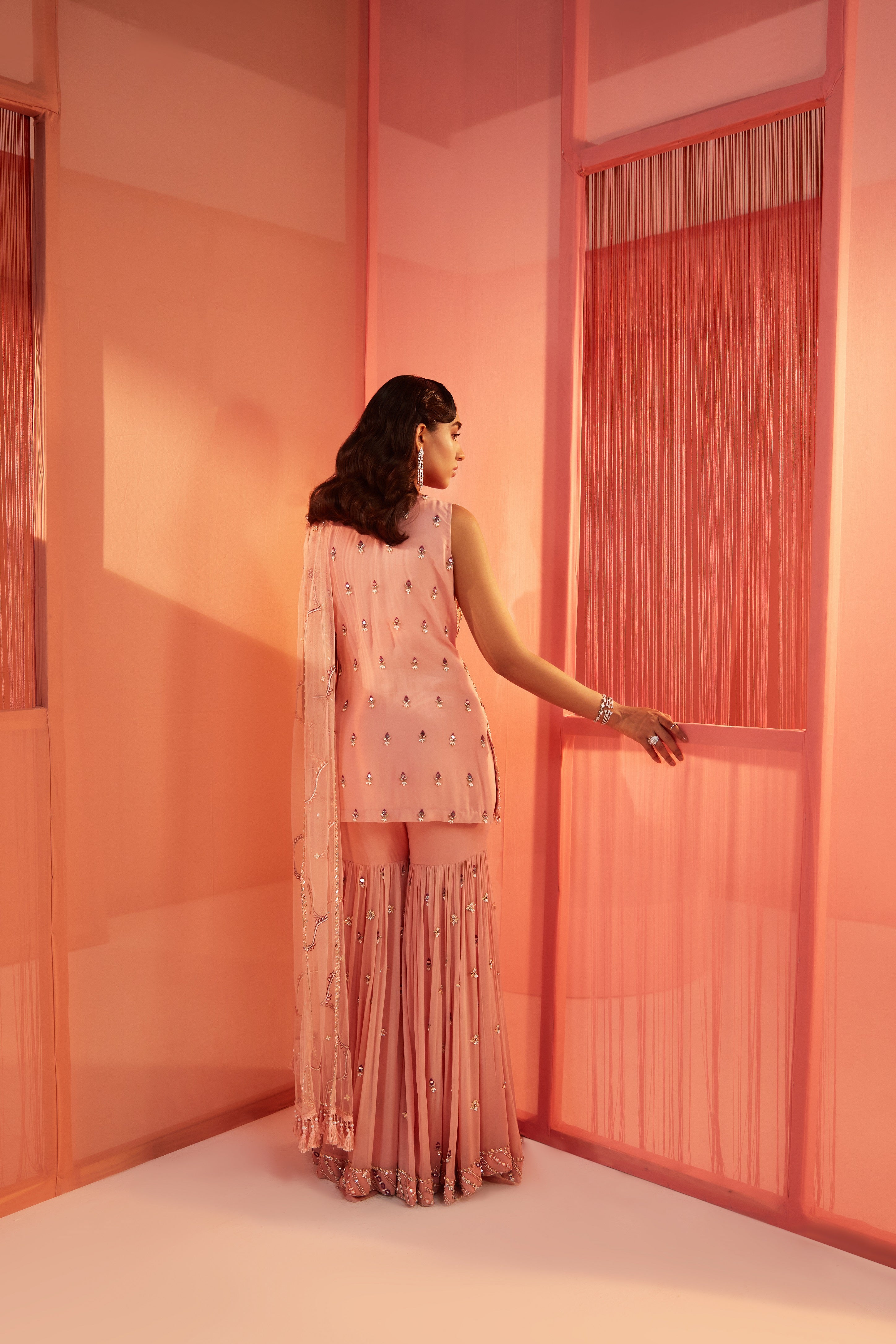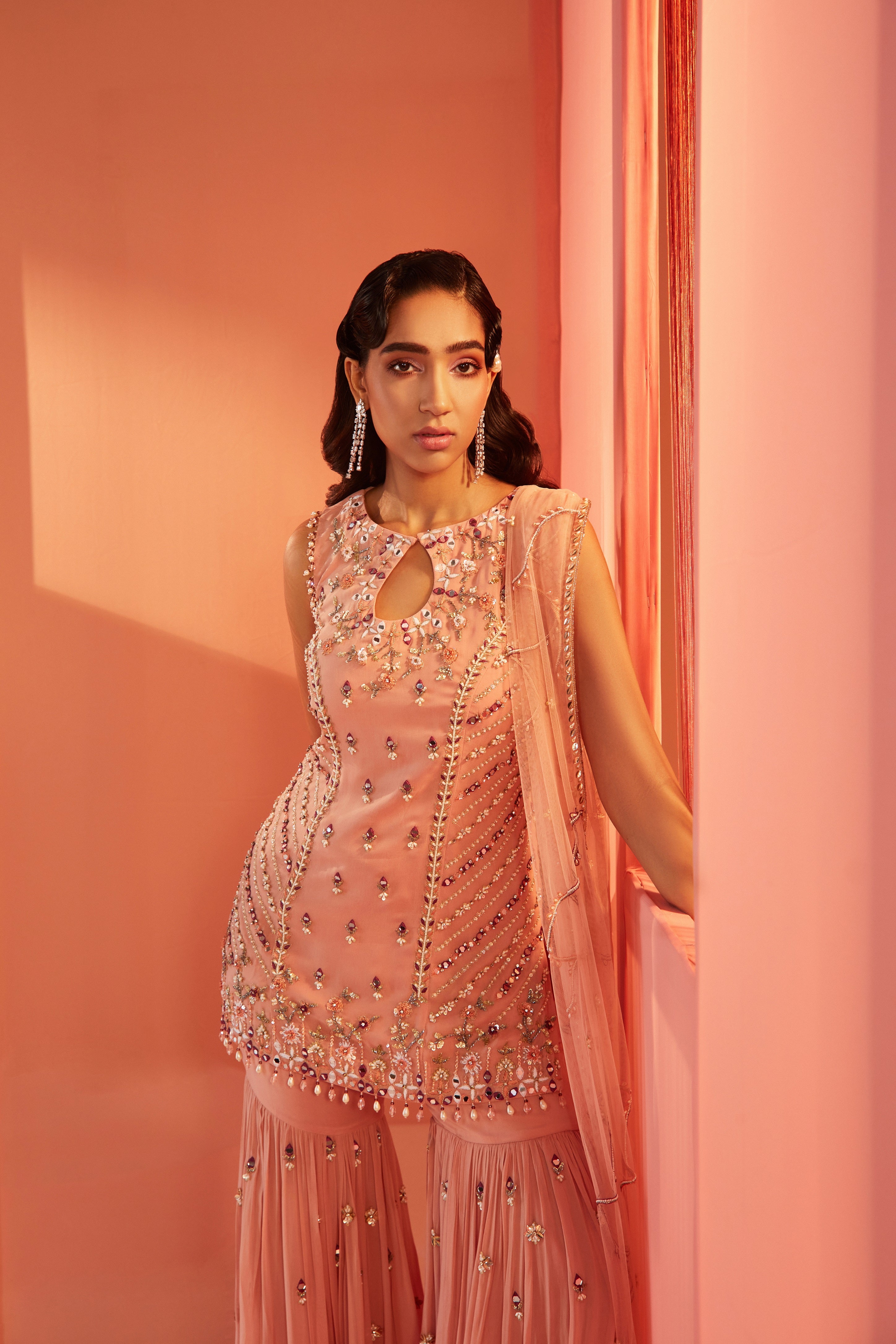 Dusty pink georgette hand embroidered kurta with a matching sharara and dupatta set. It is beautifully embroidered with different shaped sequins, threadwork, nalki and pearls. It has hand-made tassel detailing at the hem and armhole.