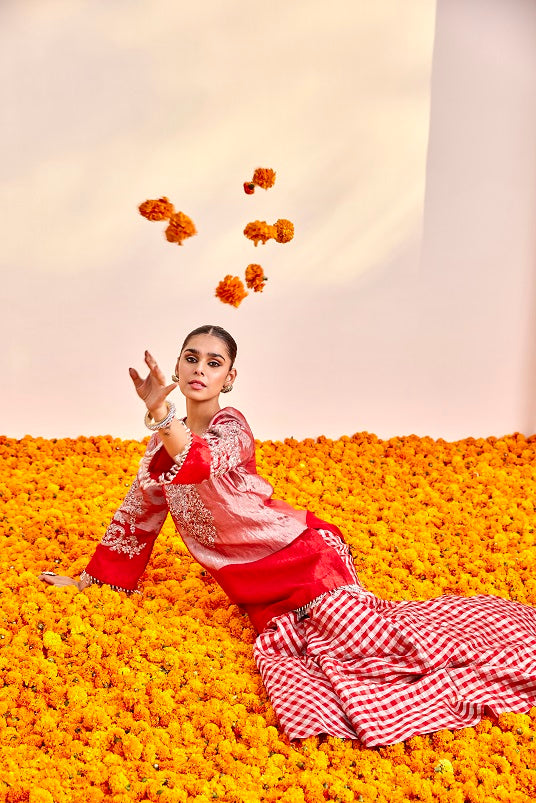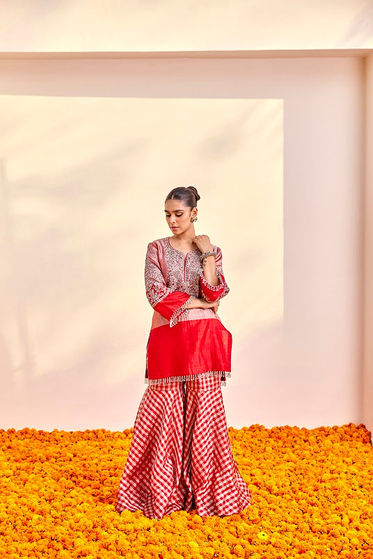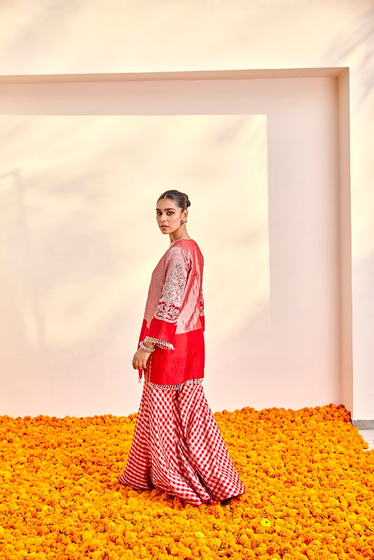 Featuring with Red Garara set with short shirt and Dupatta it is 2 components in set.