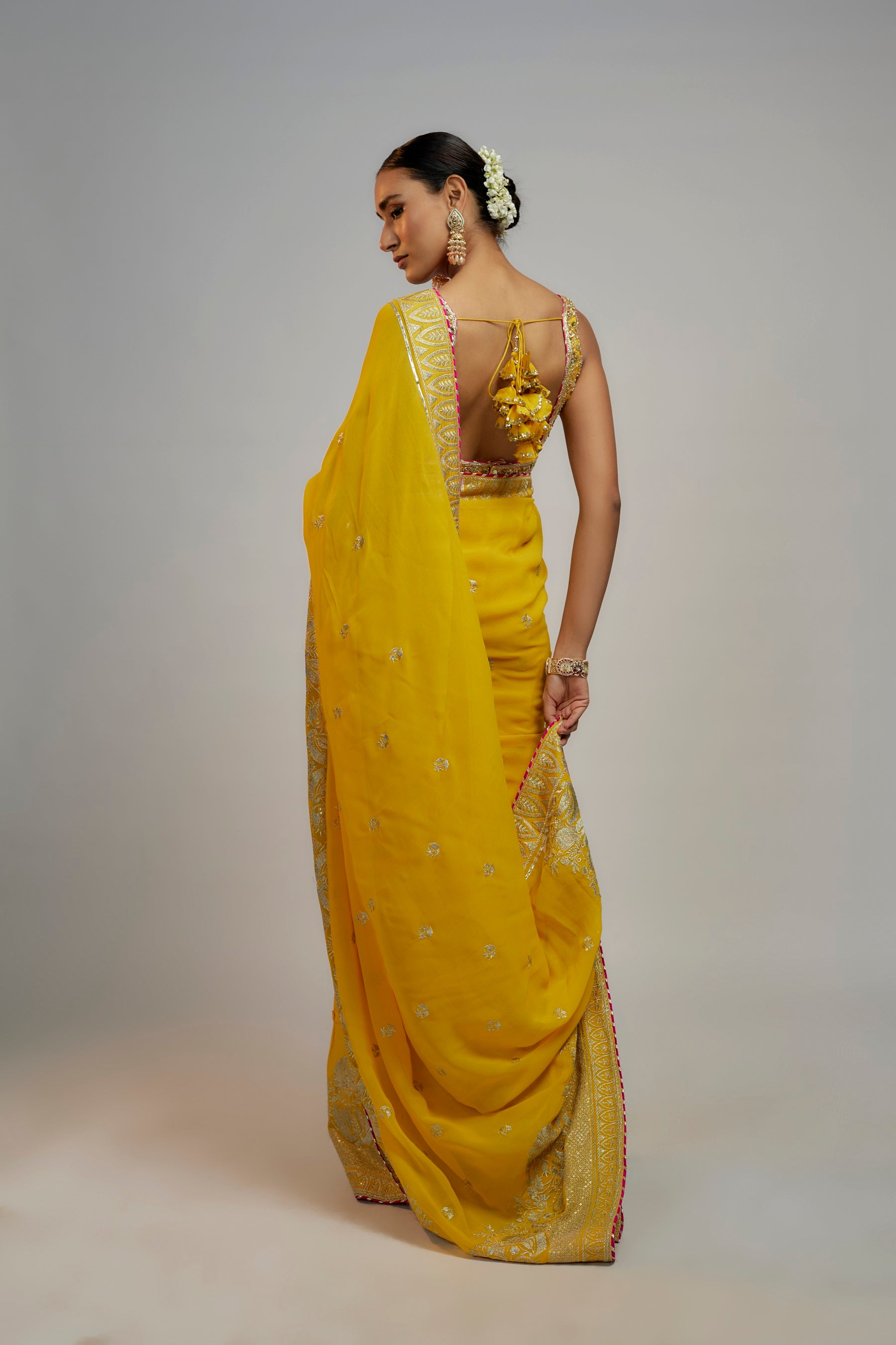 This stunning wrap lehenga-saree is ready to wear. . It embodies variations in textures accentuated by delicate gold embroidery that elevates the pattern. The strappy choli, done in zardosi work, imparts a youthful and graceful aura.